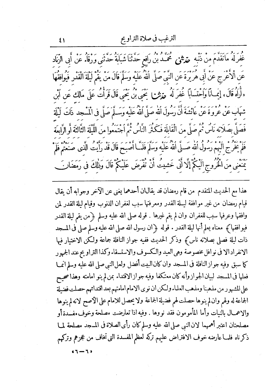 [761] قَوْلُهُ أَنَّ رَسُولَ اللَّهِ صَلَّى اللَّهُ عَلَيْهِ وسلم صَلَّى فِي الْمَسْجِدِ ذَاتَ لَيْلَةٍ فَصَلَّى بِصَلَاتِهِ نَاسٌ وَذَكَرَ الْحَدِيثَ فَفِيهِ جَوَازُ النَّافِلَةِ جَمَاعَةً وَلَكِنَّ الِاخْتِيَارَ فِيهَا الِانْفِرَادُ إِلَّا فِي نَوَافِلَ مَخْصُوصَةٍ وَهِيَ الْعِيدُ وَالْكُسُوفُ وَالِاسْتِسْقَاءُ وَكَذَا التَّرَاوِيحُ عِنْدَ الْجُمْهُورِ كَمَا سَبَقَ وَفِيهِ جَوَازُ النَّافِلَةِ فِي الْمَسْجِدِ وَإِنْ كَانَ الْبَيْتُ أَفْضَلَ وَلَعَلَّ النَّبِيَّ صَلَّى اللَّهُ عَلَيْهِ وَسَلَّمَ إِنَّمَا فَعَلَهَا فِي الْمَسْجِدِ لِبَيَانِ الْجَوَازِ وَأَنَّهُ كَانَ مُعْتَكِفًا وَفِيهِ جَوَازُ الِاقْتِدَاءِ بِمَنْ لَمْ يَنْوِ إِمَامَتَهُ وَهَذَا صَحِيحٌ عَلَى الْمَشْهُورِ مِنْ مَذْهَبِنَا وَمَذْهَبِ الْعُلَمَاءِ وَلَكِنْ إِنْ نَوَى الْإِمَامُ إِمَامَتَهُمْ بَعْدَ اقْتِدَائِهِمْ حَصَلَتْ فَضِيلَةُ الْجَمَاعَةِ لَهُ وَلَهُمْ وَإِنْ لَمْ يَنْوِهَا حَصَلَتْ لَهُمْ فَضِيلَةُ الْجَمَاعَةِ وَلَا يَحْصُلُ لِلْإِمَامِ عَلَى الْأَصَحِّ لِأَنَّهُ لَمْ يَنْوِهَا وَالْأَعْمَالُ بِالنِّيَّاتِ وَأَمَّا الْمَأْمُومُونَ فَقَدْ نَوَوْهَا وَفِيهِ إِذَا تَعَارَضَتْ مَصْلَحَةٌ وَخَوْفُ مَفْسَدَةٍ أَوْ مَصْلَحَتَانِ اعْتُبِرَ أَهَمُّهُمَا لِأَنَّ النَّبِيَّ صَلَّى اللَّهُ عَلَيْهِ وَسَلَّمَ كَانَ رَأَى الصَّلَاةَ فِي الْمَسْجِدِ مَصْلَحَةً لِمَا ذَكَرْنَاهُ فَلَمَّا عَارَضَهُ خَوْفُ الِافْتِرَاضِ عَلَيْهِمْ تَرَكَهُ لِعِظَمِ الْمَفْسَدَةِ الَّتِي تُخَافُ مِنْ عَجْزِهِمْ وتركهم