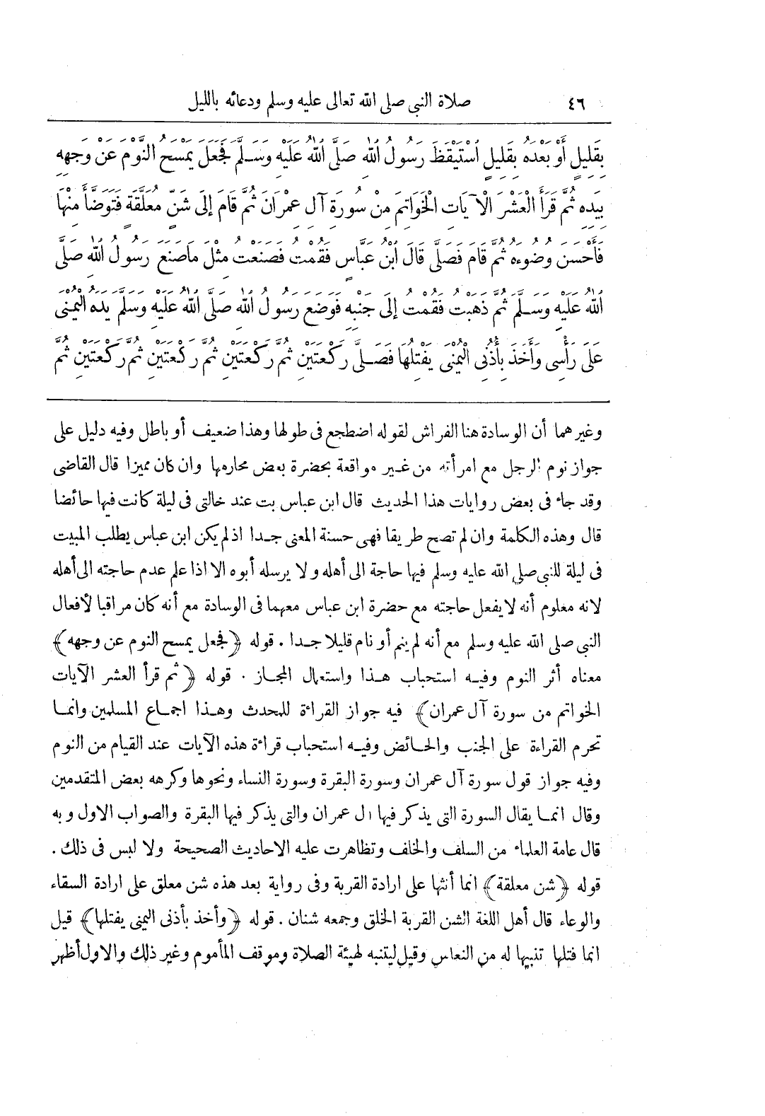 وَغَيْرِهِمَا أَنَّ الْوِسَادَةَ هُنَا الْفِرَاشُ لِقَوْلِهِ اضْطَجَعَ فِي طُولِهَا وَهَذَا ضَعِيفٌ أَوْ بَاطِلٌ وَفِيهِ دَلِيلٌ عَلَى جَوَازِ نَوْمِ الرَّجُلِ مَعَ امْرَأَتِهِ مِنْ غَيْرِ مُوَاقَعَةٍ بِحَضْرَةِ بَعْضِ مَحَارِمِهَا وَإِنْ كَانَ مُمَيِّزًا قَالَ الْقَاضِي وَقَدْ جَاءَ فِي بعض روايات هذا الحديث قال بن عباس بت عند خالتي في ليلة كانت فِيهَا حَائِضًا قَالَ وَهَذِهِ الْكَلِمَةُ وَإِنْ لَمْ تصح طريقا فهي حسنة المعنى جدا إذ لم يكن بن عَبَّاسٍ يَطْلُبُ الْمَبِيتَ فِي لَيْلَةٍ لِلنَّبِيِّ صَلَّى اللَّهُ عَلَيْهِ وَسَلَّمَ فِيهَا حَاجَةٌ إِلَى أَهْلِهِ وَلَا يُرْسِلُهُ أَبُوهُ إِلَّا إِذَا عَلِمَ عَدَمَ حَاجَتِهِ إِلَى أَهْلِهِ لِأَنَّهُ مَعْلُومٌ أَنَّهُ لَا يفعل حاجته مع حضرة بن عَبَّاسٍ مَعَهُمَا فِي الْوِسَادَةِ مَعَ أَنَّهُ كَانَ مُرَاقِبًا لِأَفْعَالِ النَّبِيِّ صَلَّى اللَّهُ عَلَيْهِ وَسَلَّمَ مَعَ أَنَّهُ لَمْ يَنَمْ أَوْ نَامَ قَلِيلًا جِدًّا قَوْلُهُ فَجَعَلَ يَمْسَحُ النَّوْمَ عَنْ وَجْهِهِ مَعْنَاهُ أَثَرَ النَّوْمِ وَفِيهِ اسْتِحْبَابُ هَذَا وَاسْتِعْمَالُ الْمَجَازِ قَوْلُهُ ثُمَّ قَرَأَ الْعَشْرَ الْآيَاتِ الْخَوَاتِمَ مِنْ سُورَةِ آلِ عِمْرَانَ فِيهِ جَوَازُ الْقِرَاءَةِ لِلْمُحْدِثِ وَهَذَا إِجْمَاعُ الْمُسْلِمِينَ وَإِنَّمَا تَحْرُمُ الْقِرَاءَةُ عَلَى الْجُنُبِ وَالْحَائِضِ وَفِيهِ اسْتِحْبَابُ قِرَاءَةِ هَذِهِ الْآيَاتِ عِنْدَ الْقِيَامِ مِنَ النَّوْمِ وَفِيهِ جَوَازُ قَوْلِ سُورَةِ آلِ عِمْرَانَ وَسُورَةِ الْبَقَرَةِ وَسُورَةِ النِّسَاءِ وَنَحْوِهَا وَكَرِهَهُ بَعْضُ الْمُتَقَدِّمِينَ وَقَالَ إِنَّمَا يُقَالُ السُّورَةُ الَّتِي يُذْكَرُ فِيهَا آلُ عِمْرَانَ وَالَّتِي يُذْكَرُ فِيهَا الْبَقَرَةُ وَالصَّوَابُ الْأَوَّلُ وَبِهِ قَالَ عَامَّةُ الْعُلَمَاءِ مِنَ السَّلَفِ وَالْخَلَفِ وَتَظَاهَرَتْ عَلَيْهِ الْأَحَادِيثُ الصَّحِيحَةُ وَلَا لَبْسَ فِي ذَلِكَ قَوْلُهُ شَنٍّ مُعَلَّقَةٍ إِنَّمَا أَنَّثَهَا عَلَى إِرَادَةِ الْقِرْبَةِ وَفِي رِوَايَةٍ بَعْدَ هَذِهِ شَنٍّ مُعَلَّقٍ عَلَى إِرَادَةِ السِّقَاءِ وَالْوِعَاءِ قَالَ أَهْلُ اللُّغَةِ الشَّنُّ الْقِرْبَةُ الْخَلَقُ وَجَمْعُهُ شِنَانٌ قَوْلُهُ وَأَخَذَ بِأُذُنِي الْيُمْنَى يَفْتِلُهَا قِيلَ إِنَّمَا فَتَلَهَا تَنْبِيهًا لَهُ مِنَ النُّعَاسِ وَقِيلَ لِيَتَنَبَّهَ لِهَيْئَةِ الصَّلَاةِ وَمَوْقِفِ الْمَأْمُومِ وَغَيْرِ ذَلِكَ وَالْأَوَّلُ أَظْهَرُ