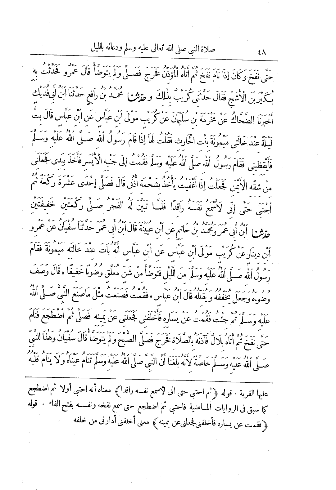 عَلَيْهَا الْقِرْبَةَ قَوْلُهُ ثُمَّ احْتَبَى حَتَّى إِنِّي لَأَسْمَعُ نَفَسَهُ رَاقِدًا مَعْنَاهُ أَنَّهُ احْتَبَى أَوَّلًا ثُمَّ اضْطَجَعَ كَمَا سَبَقَ فِي الرِّوَايَاتِ الْمَاضِيَةِ فَاحْتَبَى ثُمَّ اضْطَجَعَ حَتَّى سَمِعَ نَفْخَهُ وَنَفَسَهُ بِفَتْحِ الْفَاءِ قَوْلُهُ فَقُمْتُ عَنْ يَسَارِهِ فَأَخْلَفَنِي فَجَعَلَنِي عَنْ يَمِينِهِ مَعْنَى أَخْلَفَنِي أَدَارَنِي مِنْ خلفه