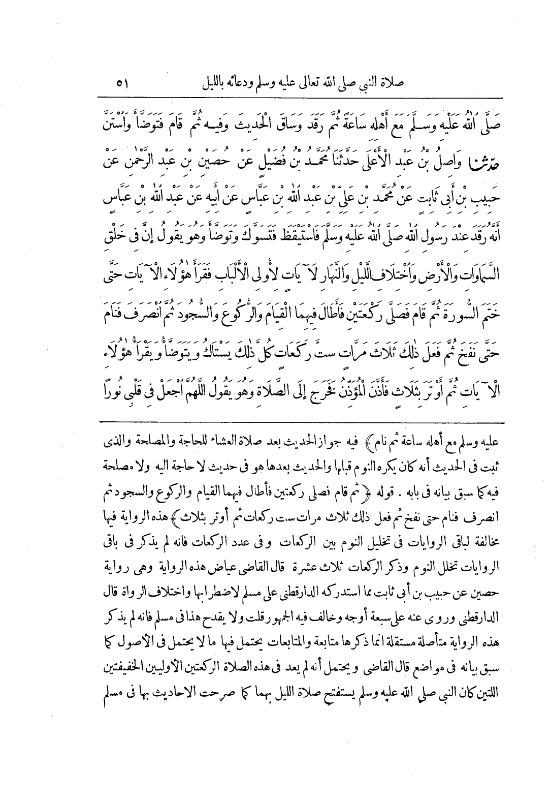 مَعَ أَهْلِهِ سَاعَةً ثُمَّ نَامَ فِيهِ جَوَازُ الْحَدِيثِ بَعْدَ صَلَاةِ الْعِشَاءِ لِلْحَاجَةِ وَالْمَصْلَحَةِ وَالَّذِي ثَبَتَ فِي الْحَدِيثِ أَنَّهُ كَانَ يَكْرَهُ النَّوْمَ قَبْلَهَا وَالْحَدِيثُ بَعْدَهَا هُوَ فِي حَدِيثٍ لَا حَاجَةَ إِلَيْهِ وَلَا مَصْلَحَةَ فِيهِ كَمَا سَبَقَ بَيَانُهُ فِي بَابِهِ قَوْلُهُ ثُمَّ قَامَ فَصَلَّى رَكْعَتَيْنِ فَأَطَالَ فِيهِمَا الْقِيَامَ وَالرُّكُوعَ وَالسُّجُودَ ثُمَّ انْصَرَفَ فَنَامَ حَتَّى نَفَخَ ثُمَّ فَعَلَ ذَلِكَ ثَلَاثَ مَرَّاتٍ سِتَّ رَكَعَاتٍ ثُمَّ أَوْتَرَ بِثَلَاثٍ هَذِهِ الرِّوَايَةُ فِيهَا مُخَالَفَةٌ لِبَاقِي الرِّوَايَاتِ فِي تَخْلِيلِ النَّوْمِ بَيْنَ الرَّكَعَاتِ وَفِي عَدَدِ الرَّكَعَاتِ فَإِنَّهُ لَمْ يَذْكُرْ فِي بَاقِي الرِّوَايَاتِ تَخَلُّلَ النَّوْمِ وَذَكَرَ الرَّكَعَاتِ ثَلَاثَ عَشْرَةَ قَالَ الْقَاضِي عِيَاضٌ هَذِهِ الرِّوَايَةُ وَهِيَ رِوَايَةُ حُصَيْنٍ عَنْ حَبِيبِ بْنِ أَبِي ثَابِتٍ مِمَّا اسْتَدْرَكَهُ الدَّارَقُطْنِيُّ عَلَى مُسْلِمٍ لِاضْطِرَابِهَا وَاخْتِلَافِ الرُّوَاةِ قَالَ الدَّارَقُطْنِيُّ وَرُوِيَ عَنْهُ عَلَى سَبْعَةِ أَوْجُهٍ وَخَالَفَ فِيهِ الْجُمْهُورَ قُلْتُ وَلَا يَقْدَحُ هَذَا فِي مُسْلِمٍ فَإِنَّهُ لَمْ يَذْكُرْ هَذِهِ الرِّوَايَةَ مُتَأَصِّلَةً مُسْتَقِلَّةً إِنَّمَا ذَكَرَهَا مُتَابَعَةً وَالْمُتَابَعَاتُ يَحْتَمِلُ فِيهَا مَا لَا يَحْتَمِلُ فِي الْأُصُولِ كَمَا سَبَقَ بَيَانُهُ فِي مَوَاضِعَ قَالَ الْقَاضِي وَيَحْتَمِلُ أَنَّهُ لَمْ يَعُدَّ فِي هَذِهِ الصَّلَاةِ الرَّكْعَتَيْنِ الْأُولَيَيْنِ الْخَفِيفَتَيْنِ اللَّتَيْنِ كَانَ النَّبِيُّ صَلَّى اللَّهُ عَلَيْهِ وَسَلَّمَ يَسْتَفْتِحُ صَلَاةَ اللَّيْلِ بِهِمَا كَمَا صَرَّحَتِ الْأَحَادِيثُ بِهَا فِي مُسْلِمٍ