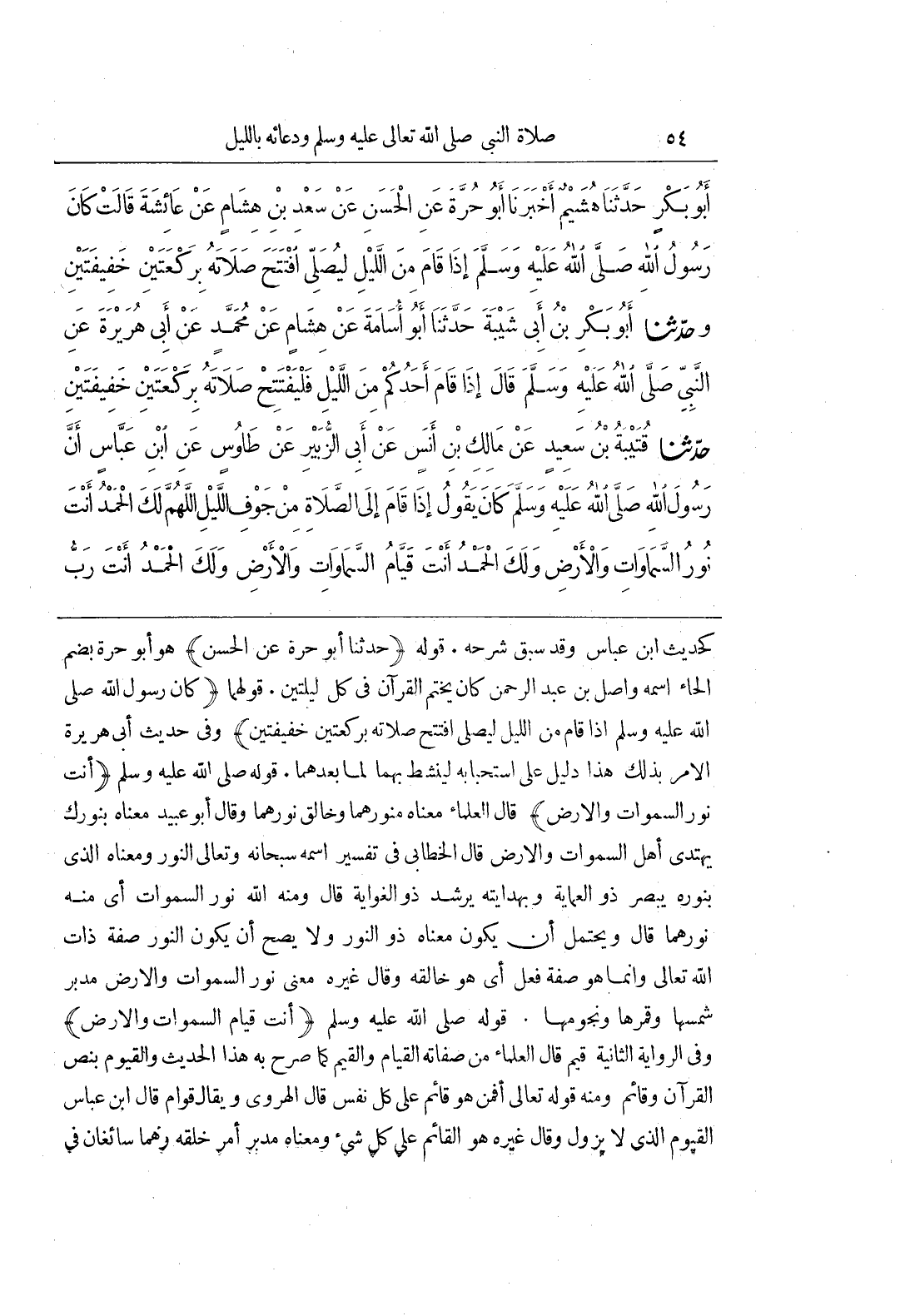 [769] قَوْلُهُ صَلَّى اللَّهُ عَلَيْهِ وَسَلَّمَ أَنْتَ نُورُ السَّمَاوَاتِ وَالْأَرْضِ قَالَ الْعُلَمَاءُ مَعْنَاهُ مُنَوِّرُهُمَا وَخَالِقُ نُورِهِمَا وَقَالَ أَبُو عُبَيْدٍ مَعْنَاهُ بِنُورِكَ يَهْتَدِي أَهْلُ السَّمَاوَاتِ وَالْأَرْضِ قَالَ الْخَطَّابِيُّ فِي تَفْسِيرِ اسْمِهِ سُبْحَانَهُ وَتَعَالَى النُّورِ وَمَعْنَاهُ الَّذِي بِنُورِهِ يُبْصِرُ ذُو الْعِمَايَةِ وَبِهِدَايَتِهِ يَرْشُدُ ذُو الغواية قال ومنه الله نور السماوات أَيْ مِنْهُ نُورُهُمَا قَالَ وَيَحْتَمِلُ أَنْ يَكُونَ مَعْنَاهُ ذُو النُّورِ وَلَا يَصِحُّ أَنْ يَكُونَ النُّورُ صِفَةَ ذَاتِ اللَّهِ تَعَالَى وَإِنَّمَا هُوَ صِفَةُ فِعْلٍ أَيْ هُوَ خَالِقُهُ وَقَالَ غَيْرُهُ مَعْنَى نُورُ السَّمَاوَاتِ وَالْأَرْضِ مُدَبِّرُ شَمْسِهَا وَقَمَرِهَا وَنُجُومِهَا قَوْلُهُ صَلَّى اللَّهُ عَلَيْهِ وَسَلَّمَ أَنْتَ قَيَّامُ السَّمَاوَاتِ وَالْأَرْضِ وَفِي الرِّوَايَةِ الثَّانِيَةِ قَيِّمُ قَالَ الْعُلَمَاءُ مِنْ صِفَاتِهِ الْقَيَّامُ وَالْقَيِّمُ كَمَا صَرَّحَ بِهِ هَذَا الْحَدِيثُ وَالْقَيُّومُ بِنَصِّ الْقُرْآنِ وَقَائِمٌ وَمِنْهُ قَوْلُهُ تَعَالَى أَفَمَنْ هُوَ قَائِمٌ على كل نفس قال الهروي ويقال قوام قال بن عباس القيوم الذي لايزول وَقَالَ غَيْرُهُ هُوَ الْقَائِمُ عَلَى كُلِّ شَيْءٍ وَمَعْنَاهُ مُدَبِّرُ أَمْرِ خَلْقِهِ وَهُمَا سَائِغَانِ فِي