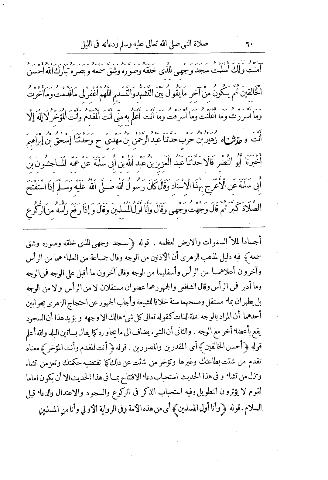 أَجْسَامًا لَمَلَأَ السَّمَاوَاتِ وَالْأَرْضَ لِعِظَمِهِ قَوْلُهُ سَجَدَ وَجْهِي لِلَّذِي خَلَقَهُ وَصَوَّرَهُ وَشَقَّ سَمْعَهُ فِيهِ دَلِيلٌ لِمَذْهَبِ الزُّهْرِيِّ أَنَّ الْأُذُنَيْنِ مِنَ الْوَجْهِ وَقَالَ جَمَاعَةٌ مِنَ الْعُلَمَاءِ هُمَا مِنَ الرَّأْسِ وَآخَرُونَ أَعْلَاهُمَا مِنَ الرَّأْسِ وَأَسْفَلُهُمَا مِنَ الْوَجْهِ وَقَالَ آخَرُونَ مَا أَقْبَلَ عَلَى الْوَجْهِ فَمِنَ الْوَجْهِ وَمَا أَدْبَرَ فَمِنَ الرَّأْسِ وَقَالَ الشَّافِعِيُّ وَالْجُمْهُورُ هُمَا عُضْوَانِ مُسْتَقِلَّانِ لَا مِنَ الرَّأْسِ وَلَا مِنَ الْوَجْهِ بَلْ يَطْهُرَانِ بِمَاءٍ مُسْتَقِلٍّ وَمَسْحُهُمَا سُنَّةٌ خِلَافًا لِلشِّيعَةِ وَأَجَابَ الْجُمْهُورُ عَنِ احْتِجَاجِ الزُّهْرِيِّ بِجَوَابَيْنِ أَحَدُهُمَا أَنَّ الْمُرَادَ بِالْوَجْهِ جُمْلَةُ الذَّاتِ كَقَوْلِهِ تَعَالَى كُلُّ شَيْءٍ هَالِكٌ الا وجهه وَيُؤَيِّدُ هَذَا أَنَّ السُّجُودَ يَقَعُ بِأَعْضَاءٍ أُخَرَ مَعَ الْوَجْهِ وَالثَّانِي أَنَّ الشَّيْءَ يُضَافُ إِلَى مَا يُجَاوِرُهُ كَمَا يُقَالُ بَسَاتِينُ الْبَلَدِ وَاللَّهُ أَعْلَمُ قَوْلُهُ أَحْسَنُ الْخَالِقِينَ أَيِ الْمُقَدِّرِينَ وَالْمُصَوِّرِينَ قَوْلُهُ أَنْتَ الْمُقَدِّمُ وَأَنْتَ الْمُؤَخِّرُ مَعْنَاهُ تُقَدِّمُ مَنْ شِئْتَ بِطَاعَتِكَ وَغَيْرِهَا وَتُؤَخِّرُ مَنْ شِئْتَ عَنْ ذَلِكِ كَمَا تَقْتَضِيهِ حِكْمَتُكَ وَتُعِزُّ مَنْ تَشَاءُ وَتُذِلُّ مَنْ تَشَاءُ وَفِي هَذَا الْحَدِيثِ اسْتِحْبَابُ دُعَاءِ الِافْتِتَاحِ بِمَا فِي هَذَا الْحَدِيثِ إِلَّا أَنْ يَكُونَ إِمَامًا لِقَوْمٍ لَا يُؤْثِرُونَ التَّطْوِيلَ وَفِيهِ اسْتِحْبَابُ الذِّكْرِ فِي الرُّكُوعِ وَالسُّجُودِ وَالِاعْتِدَالِ وَالدُّعَاءِ قَبْلَ السَّلَامِ قَوْلُهُ وَأَنَا أَوَّلُ الْمُسْلِمِينَ أَيْ مِنْ هَذِهِ الْأُمَّةِ وَفِي الرِّوَايَةِ الْأُولَى وَأَنَا مِنَ الْمُسْلِمِينَ