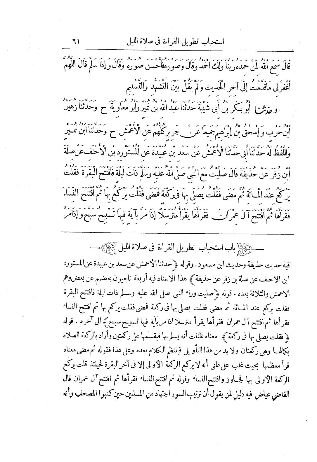 [772] فيه حديث حذيفة وحديث بن مسعود وقوله حَدَّثَنَا الْأَعْمَشُ عَنْ سَعْدِ بْنِ عُبَيْدَةَ عَنِ الْمُسْتَوْرِدِ بْنِ الْأَحْنَفِ عَنْ صِلَةَ بْنِ زُفَرَ عَنْ حُذَيْفَةَ هَذَا الْإِسْنَادُ فِيهِ أَرْبَعَةٌ تَابِعِيُّونَ بَعْضُهُمْ عَنْ بَعْضٍ وَهُمُ الْأَعْمَشُ وَالثَّلَاثَةُ بَعْدَهُ قَوْلُهُ صَلَّيْتُ وَرَاءَ النَّبِيِّ صَلَّى اللَّهُ عَلَيْهِ وَسَلَّمَ ذَاتَ لَيْلَةٍ فَافْتَتَحَ الْبَقَرَةَ فَقُلْتُ يَرْكَعُ عِنْدَ الْمِائَةِ ثُمَّ مَضَى فَقُلْتُ يُصَلِّي بِهَا فِي رَكْعَةٍ فَمَضَى فَقُلْتُ يَرْكَعُ بِهَا ثُمَّ افْتَتَحَ النِّسَاءَ فَقَرَأَهَا ثُمَّ افْتَتَحَ آلَ عِمْرَانَ فَقَرَأَهَا يَقْرَأُ مُتَرَسِّلًا إِذَا مَرَّ بِآيَةٍ فِيهَا تَسْبِيحٌ سَبَّحَ إِلَى آخِرِهِ قَوْلُهُ فَقُلْتُ يُصَلِّي بِهَا فِي رَكْعَةٍ مَعْنَاهُ ظَنَنْتُ أَنَّهُ يُسَلِّمُ بِهَا فَيَقْسِمُهَا عَلَى رَكْعَتَيْنِ وَأَرَادَ بِالرَّكْعَةِ الصَّلَاةَ بِكَمَالِهَا وَهِيَ رَكْعَتَانِ وَلَا بُدَّ مِنْ هَذَا التَّأْوِيلِ فَيَنْتَظِمُ الْكَلَامُ بَعْدَهُ وَعَلَى هَذَا فَقَوْلُهُ ثُمَّ مَضَى مَعْنَاهُ قَرَأَ مُعْظَمَهَا بِحَيْثُ غَلَبَ عَلَى ظَنِّي أَنَّهُ لَا يَرْكَعُ الرَّكْعَةَ الْأُولَى إلا في آخر الْبَقَرَةِ فَحِينَئِذٍ قُلْتُ يَرْكَعُ الرَّكْعَةَ الْأُولَى بِهَا فَجَاوَزَ وَافْتَتَحَ النِّسَاءَ وَقَوْلُهُ ثُمَّ افْتَتَحَ النِّسَاءَ فَقَرَأَهَا ثُمَّ افْتَتَحَ آلَ عِمْرَانَ قَالَ الْقَاضِي عِيَاضٌ فِيهِ دَلِيلٌ لِمَنْ يَقُولُ إِنَّ تَرْتِيبَ السُّوَرِ اجْتِهَادٌ مِنَ الْمُسْلِمِينَ حِينَ كَتَبُوا الْمُصْحَفَ وأنه