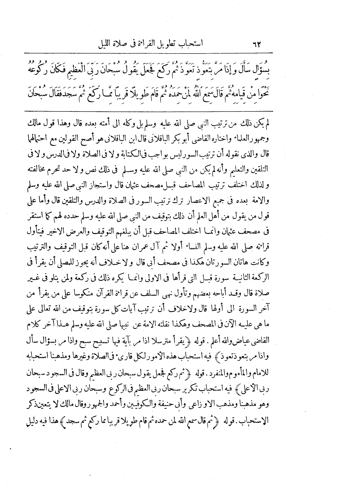 لَمْ يَكُنْ ذَلِكَ مِنْ تَرْتِيبِ النَّبِيِّ صَلَّى اللَّهُ عَلَيْهِ وَسَلَّمَ بَلْ وَكَّلَهُ إِلَى أُمَّتِهِ بَعْدَهُ قَالَ وَهَذَا قَوْلُ مَالِكٍ وَجُمْهُورِ الْعُلَمَاءِ واختاره القاضي أبو بكر الباقلاني قال بن الْبَاقِلَّانِيِّ هُوَ أَصَحُّ الْقَوْلَيْنِ مَعَ احْتِمَالِهِمَا قَالَ وَالَّذِي نَقُولُهُ إِنَّ تَرْتِيبَ السُّوَرِ لَيْسَ بِوَاجِبٍ فِي الْكِتَابَةِ وَلَا فِي الصَّلَاةِ وَلَا فِي الدَّرْسِ وَلَا فِي التَّلْقِينِ وَالتَّعْلِيمِ وَأَنَّهُ لَمْ يَكُنْ مِنَ النَّبِيِّ صَلَّى اللَّهُ عَلَيْهِ وَسَلَّمَ فِي ذَلِكَ نَصٌّ وَلَا حَدٌّ تَحْرُمُ مُخَالَفَتُهُ وَلِذَلِكَ اخْتَلَفَ تَرْتِيبُ الْمَصَاحِفِ قَبْلَ مُصْحَفِ عُثْمَانَ قَالَ وَاسْتَجَازَ النَّبِيُّ صَلَّى اللَّهُ عَلَيْهِ وَسَلَّمَ وَالْأُمَّةُ بَعْدَهُ فِي جَمِيعِ الْأَعْصَارِ تَرْكَ تَرْتِيبِ السُّوَرِ فِي الصَّلَاةِ وَالدَّرْسِ وَالتَّلْقِينِ قَالَ وَأَمَّا عَلَى قَوْلِ مَنْ يَقُولُ مِنْ أَهْلِ الْعِلْمِ إِنَّ ذَلِكَ بِتَوْقِيفٍ مِنَ النَّبِيِّ صَلَّى اللَّهُ عَلَيْهِ وَسَلَّمَ حَدَّدَهُ لَهُمْ كَمَا اسْتَقَرَّ فِي مصحف عثمان وإنما اختلف الْمَصَاحِفِ قَبْلَ أَنْ يَبْلُغَهُمُ التَّوْقِيفُ وَالْعَرْضُ الْأَخِيرُ فيتأول قرأته صَلَّى اللَّهُ عَلَيْهِ وَسَلَّمَ النِّسَاءَ أَوَّلًا ثُمَّ آلَ عِمْرَانَ هُنَا عَلَى أَنَّهُ كَانَ قَبْلَ التَّوْقِيفِ وَالتَّرْتِيبِ وَكَانَتْ هَاتَانِ السُّورَتَانِ هَكَذَا فِي مُصْحَفِ أُبَيٍّ قَالَ وَلَا خِلَافَ أَنَّهُ يَجُوزُ لِلْمُصَلِّي أَنْ يَقْرَأَ فِي الرَّكْعَةِ الثَّانِيَةِ سُورَةً قَبْلَ الَّتِي قَرَأَهَا فِي الْأُولَى وَإِنَّمَا يُكْرَهُ ذلك ي رَكْعَةٍ وَلِمَنْ يَتْلُو فِي غَيْرِ صَلَاةٍ قَالَ وقد أباحه بعضهم وتأول نَهْيِ السَّلَفِ عَنْ قِرَاءَةِ الْقُرْآنِ مَنْكُوسًا عَلَى مَنْ يَقْرَأُ مِنْ آخِرِ السُّورَةِ إِلَى أَوَّلِهَا قَالَ وَلَا خِلَافَ أَنَّ تَرْتِيبَ آيَاتِ كُلِّ سُورَةٍ بِتَوْقِيفٍ مِنَ اللَّهِ تَعَالَى عَلَى مَا هِيَ عَلَيْهِ الْآنَ فِي الْمُصْحَفِ وَهَكَذَا نَقَلَتْهُ الْأُمَّةُ عَنْ نَبِيِّهَا صَلَّى اللَّهُ عَلَيْهِ وَسَلَّمَ هَذَا آخِرُ كَلَامِ الْقَاضِي عِيَاضٍ وَاللَّهُ أَعْلَمُ قَوْلُهُ يَقْرَأُ مُتَرَسِّلًا إِذَا مَرَّ بِآيَةٍ فِيهَا تَسْبِيحٌ سَبَّحَ وَإِذَا مَرَّ بِسُؤَالٍ سَأَلَ وَإِذَا مَرَّ بِتَعَوُّذٍ تَعَوَّذَ فِيهِ اسْتِحْبَابُ هَذِهِ الْأُمُورِ لِكُلِّ قَارِئٍ فِي الصَّلَاةِ وَغَيْرِهَا وَمَذْهَبُنَا اسْتِحْبَابُهُ لِلْإِمَامِ وَالْمَأْمُومِ وَالْمُنْفَرِدِ قَوْلُهُ ثُمَّ رَكَعَ فَجَعَلَ يَقُولُ سُبْحَانَ رَبِّيَ الْعَظِيمِ وَقَالَ فِي السُّجُودِ سُبْحَانَ رَبِّيَ الْأَعْلَى فِيهِ اسْتِحْبَابُ تَكْرِيرِ سُبْحَانَ رَبِّيَ الْعَظِيمِ فِي الرُّكُوعِ وَسُبْحَانَ رَبِّيَ الْأَعْلَى فِي السُّجُودِ وَهُوَ مَذْهَبُنَا وَمَذْهَبُ الْأَوْزَاعِيِّ وَأَبِي حَنِيفَةَ وَالْكُوفِيِّينَ وَأَحْمَدَ وَالْجُمْهُورِ وَقَالَ مَالِكٌ لَا يَتَعَيَّنُ ذِكْرُ الِاسْتِحْبَابِ قَوْلُهُ ثُمَّ قَالَ سَمِعَ اللَّهُ لِمَنْ حَمِدَهُ ثُمَّ قَامَ طَوِيلًا قَرِيبًا مِمَّا رَكَعَ ثُمَّ سَجَدَ هَذَا فِيهِ دَلِيلٌ