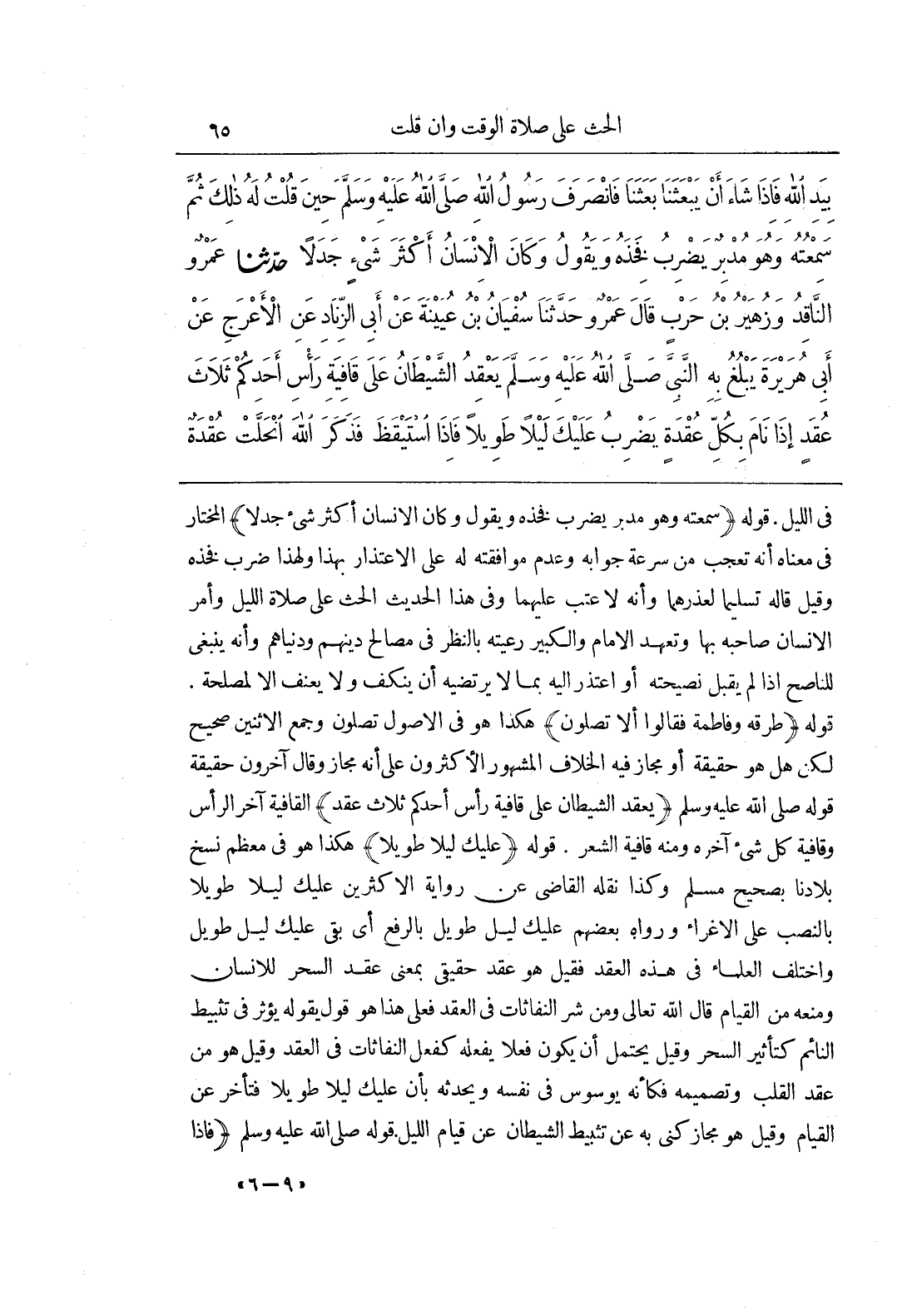 فِي اللَّيْلِ قَوْلُهُ سَمِعْتُهُ وَهُوَ مُدْبِرٌ يَضْرِبُ فَخِذَهُ وَيَقُولُ وَكَانَ الْإِنْسَانُ أَكْثَرَ شَيْءٍ جَدَلًا الْمُخْتَارُ فِي مَعْنَاهُ أَنَّهُ تَعَجَّبَ مَنْ سُرْعَةِ جَوَابِهِ وَعَدَمِ مُوَافَقَتِهِ لَهُ عَلَى الِاعْتِذَارِ بِهَذَا وَلِهَذَا ضَرَبَ فَخِذَهُ وَقِيلَ قَالَهُ تَسْلِيمًا لِعُذْرِهِمَا وَأَنَّهُ لَا عَتْبَ عَلَيْهِمَا وَفِي هَذَا الْحَدِيثِ الْحَثُّ عَلَى صَلَاةِ اللَّيْلِ وَأَمْرُ الْإِنْسَانِ صَاحِبَهُ بِهَا وَتَعَهُّدُ الْإِمَامِ وَالْكَبِيرِ رَعِيَّتَهُ بِالنَّظَرِ فِي مَصَالِحِ دِينِهِمْ وَدُنْيَاهُمْ وَأَنَّهُ يَنْبَغِي لِلنَّاصِحِ إِذَا لَمْ يَقْبَلْ نَصِيحَتَهُ أَوِ اعْتَذَرَ إِلَيْهِ بِمَا لَا يَرْتَضِيهِ أَنْ يَنْكَفَّ وَلَا يُعَنِّفَ إِلَّا لمصلحة قوله طرقه وفاطمة فقالوا أَلَا تُصَلُّونَ هَكَذَا هُوَ فِي الْأُصُولِ تُصَلُّونَ وَجَمْعُ الِاثْنَيْنِ صَحِيحٌ لَكِنْ هَلْ هُوَ حَقِيقَةٌ أَوْ مَجَازٌ فِيهِ الْخِلَافُ الْمَشْهُورُ الْأَكْثَرُونَ عَلَى أَنَّهُ مَجَازٌ وَقَالَ آخَرُونَ حَقِيقَةٌ