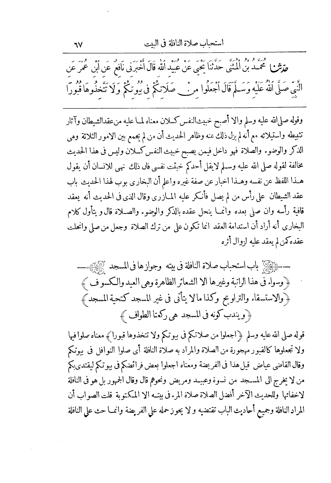 [777] قَوْلُهُ صَلَّى اللَّهُ عَلَيْهِ وَسَلَّمَ اجْعَلُوا مِنْ صَلَاتِكُمْ فِي بُيُوتِكُمْ وَلَا تَتَّخِذُوهَا قُبُورًا مَعْنَاهُ صَلُّوا فِيهَا وَلَا تَجْعَلُوهَا كَالْقُبُورِ مَهْجُورَةً مِنَ الصَّلَاةِ وَالْمُرَادُ به صَلَاةُ النَّافِلَةِ أَيْ صَلُّوا النَّوَافِلَ فِي بُيُوتِكُمْ وَقَالَ الْقَاضِي عِيَاضٌ قِيلَ هَذَا فِي الْفَرِيضَةِ وَمَعْنَاهُ اجْعَلُوا بَعْضَ فَرَائِضِكُمْ فِي بُيُوتِكُمْ لِيَقْتَدِيَ بِكُمْ مَنْ لَا يَخْرُجُ إِلَى الْمَسْجِدِ مِنْ نِسْوَةٍ وَعَبِيدٍ وَمَرِيضٍ وَنَحْوِهِمْ قَالَ وَقَالَ الْجُمْهُورُ بَلْ هُوَ فِي النَّافِلَةِ لِإِخْفَائِهَا وَلِلْحَدِيثِ الْآخَرِ أفضل الصلاة صلاة المرء في بيته إلا الْمَكْتُوبَةَ قُلْتُ الصَّوَابُ أَنَّ الْمُرَادَ النَّافِلَةُ وَجَمِيعُ أَحَادِيثِ الْبَابِ تَقْتَضِيهِ وَلَا يَجُوزُ حَمْلُهُ عَلَى الْفَرِيضَةِ وَإِنَّمَا حَثَّ عَلَى النَّافِلَةِ