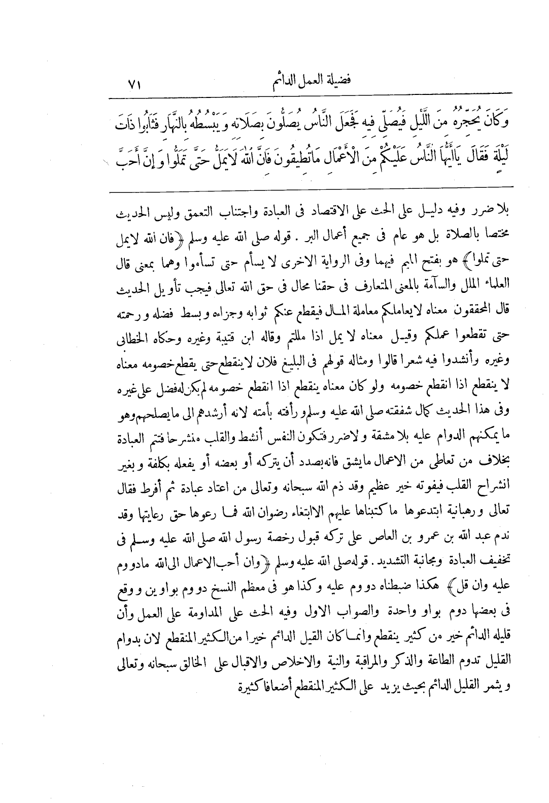 بِلَا ضَرَرٍ وَفِيهِ دَلِيلٌ عَلَى الْحَثِّ عَلَى الِاقْتِصَادِ فِي الْعِبَادَةِ وَاجْتِنَابِ التَّعَمُّقِ وَلَيْسَ الْحَدِيثُ مُخْتَصًّا بِالصَّلَاةِ بَلْ هُوَ عَامٌّ فِي جَمِيعِ أَعْمَالِ الْبِرِّ قَوْلُهُ صَلَّى اللَّهُ عَلَيْهِ وَسَلَّمَ فَإِنَّ اللَّهَ لَا يَمَلُّ حَتَّى تَمَلُّوا هُوَ بِفَتْحِ الْمِيمِ فِيهِمَا وَفِي الرِّوَايَةِ الْأُخْرَى لَا يَسْأَمُ حَتَّى تَسْأَمُوا وَهُمَا بِمَعْنًى قَالَ الْعُلَمَاءُ الْمَلَلُ وَالسَّآمَةُ بِالْمَعْنَى الْمُتَعَارَفِ فِي حَقِّنَا مُحَالٌ فِي حَقِّ اللَّهِ تَعَالَى فَيَجِبُ تَأْوِيلُ الْحَدِيثِ قَالَ الْمُحَقِّقُونَ مَعْنَاهُ لَا يُعَامِلُكُمْ مُعَامَلَةَ الْمَالِّ فَيَقْطَعُ عَنْكُمْ ثَوَابَهُ وَجَزَاءَهُ وَبَسْطَ فَضْلِهِ وَرَحْمَتِهِ حَتَّى تَقْطَعُوا عَمَلَكُمْ وَقِيلَ مَعْنَاهُ لَا يَمَلُّ إذا مللتم وقاله بن قُتَيْبَةَ وَغَيْرُهُ وَحَكَاهُ الْخَطَّابِيُّ وَغَيْرُهُ وَأَنْشَدُوا فِيهِ شِعْرًا قَالُوا وَمِثَالُهُ قَوْلُهُمْ فِي الْبَلِيغِ فُلَانٌ لَا يَنْقَطِعُ حَتَّى يَقْطَعَ خُصُومَهُ مَعْنَاهُ لَا يَنْقَطِعُ إِذَا انْقَطَعَ خُصُومُهُ وَلَوْ كَانَ مَعْنَاهُ يَنْقَطِعُ إِذَا انْقَطَعَ خُصُومُهُ لَمْ يَكُنْ لَهُ فَضْلٌ عَلَى غَيْرِهِ وَفِي هَذَا الْحَدِيثِ كَمَالُ شَفَقَتِهِ صَلَّى اللَّهُ عَلَيْهِ وَسَلَّمَ وَرَأْفَتِهِ بِأُمَّتِهِ لِأَنَّهُ أَرْشَدَهُمْ إِلَى مَا يُصْلِحُهُمْ وَهُوَ مَا يُمْكِنُهُمُ الدَّوَامُ عَلَيْهِ بِلَا مَشَقَّةٍ وَلَا ضَرَرٍ فَتَكُونُ النَّفْسُ أَنْشَطَ وَالْقَلْبُ مُنْشَرِحًا فَتَتِمُّ الْعِبَادَةُ بِخِلَافِ مَنْ تَعَاطَى مِنَ الْأَعْمَالِ مَا يَشُقُّ فَإِنَّهُ بِصَدَدِ أَنْ يَتْرُكَهُ أَوْ بَعْضَهُ أَوْ يَفْعَلَهُ بِكُلْفَةٍ وَبِغَيْرِ انْشِرَاحِ الْقَلْبِ فَيَفُوتُهُ خَيْرٌ عَظِيمٌ وَقَدْ ذَمَّ اللَّهُ سُبْحَانَهُ وَتَعَالَى مَنِ اعْتَادَ عِبَادَةً ثُمَّ أَفْرَطَ فَقَالَ تَعَالَى وَرَهْبَانِيَّةً ابْتَدَعُوهَا مَا كَتَبْنَاهَا عَلَيْهِمْ إِلَّا ابْتِغَاءَ رِضْوَانِ اللَّهِ فَمَا رَعَوْهَا حَقَّ رعايتها وَقَدْ نَدِمَ عَبْدُ اللَّهِ بْنُ عَمْرِو بْنِ الْعَاصِ عَلَى تَرْكِهِ قَبُولَ رُخْصَةِ رَسُولِ اللَّهِ صَلَّى اللَّهُ عَلَيْهِ وَسَلَّمَ فِي تَخْفِيفِ الْعِبَادَةِ وَمُجَانَبَةِ التَّشْدِيدِ قَوْلُهُ صَلَّى اللَّهُ عَلَيْهِ وَسَلَّمَ وَإِنَّ أَحَبَّ الْأَعْمَالِ إِلَى اللَّهِ مَا دُووِمَ عَلَيْهِ وَإِنْ قَلَّ هَكَذَا ضَبَطْنَاهُ دُووِمَ عَلَيْهِ وَكَذَا هُوَ فِي مُعْظَمِ النُّسَخِ دُووِمَ بِوَاوَيْنِ وَوَقَعَ فِي بَعْضِهَا دُوِمَ بِوَاوٍ وَاحِدَةٍ وَالصَّوَابُ الْأَوَّلُ وَفِيهِ الْحَثُّ عَلَى الْمُدَاوَمَةِ عَلَى الْعَمَلِ وَأَنَّ قَلِيلَهُ الدَّائِمَ خَيْرٌ مِنْ كَثِيرٍ يَنْقَطِعُ وَإِنَّمَا كَانَ الْقَلِيلُ الدَّائِمُ خَيْرًا مِنْ الْكَثِيرِ الْمُنْقَطِعِ لِأَنَّ بِدَوَامِ الْقَلِيلِ تَدُومُ الطَّاعَةُ وَالذِّكْرُ وَالْمُرَاقَبَةُ وَالنِّيَّةُ وَالْإِخْلَاصُ وَالْإِقْبَالُ عَلَى الْخَالِقِ سُبْحَانَهُ وَتَعَالَى وَيُثْمِرُ الْقَلِيلُ الدَّائِمُ بِحَيْثُ يَزِيدُ عَلَى الْكَثِيرِ الْمُنْقَطِعِ أَضْعَافًا كَثِيرَةً