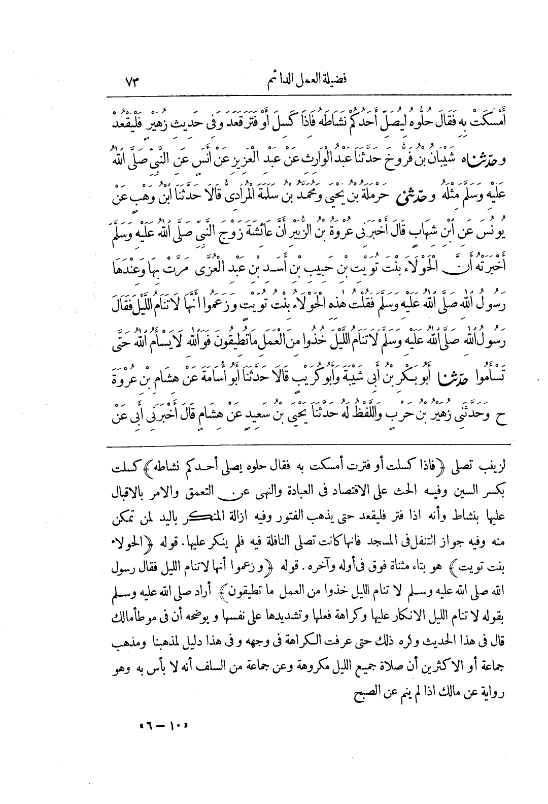 [785] قَوْلُهُ الْحَوْلَاءُ بِنْتُ تُوَيْتٍ هُوَ بِتَاءٍ مُثَنَّاةٍ فَوْقُ فِي أَوَّلِهِ وَآخِرِهِ قَوْلُهُ وَزَعَمُوا أَنَّهَا لَا تَنَامُ اللَّيْلَ فَقَالَ رَسُولُ اللَّهِ صَلَّى اللَّهُ عَلَيْهِ وَسَلَّمَ لا تَنَامُ اللَّيْلَ خُذُوا مِنَ الْعَمَلِ مَا تُطِيقُونَ أَرَادَ صَلَّى اللَّهُ عَلَيْهِ وَسَلَّمَ بِقَوْلِهِ لَا تَنَامُ اللَّيْلَ الْإِنْكَارَ عَلَيْهَا وَكَرَاهَةَ فِعْلِهَا وَتَشْدِيدِهَا عَلَى نَفْسِهَا وَيُوَضِّحُهُ أَنَّ فِي مُوَطَّأِ مَالِكٍ قَالَ فِي هَذَا الْحَدِيثِ وَكَرِهَ ذَلِكَ حَتَّى عُرِفَتِ الْكَرَاهَةُ فِي وَجْهِهِ وَفِي هَذَا دَلِيلٌ لِمَذْهَبِنَا وَمَذْهَبُ جَمَاعَةٍ أَوِ الْأَكْثَرِينَ أَنَّ صَلَاةَ جَمِيعِ اللَّيْلِ مَكْرُوهَةٌ وَعَنْ جَمَاعَةٍ مِنَ السَّلَفِ أَنَّهُ لَا بَأْسَ بِهِ وَهُوَ رِوَايَةٌ عَنْ مالك إذا لم ينم عن الصبح