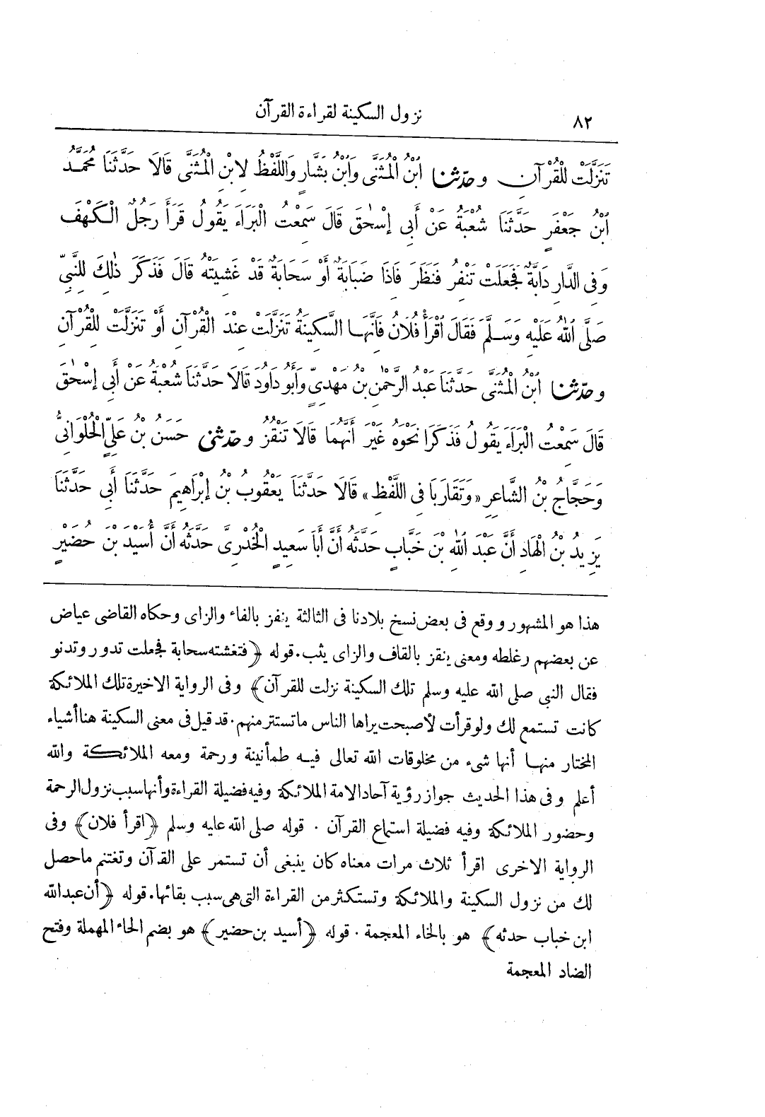 هَذَا هُوَ الْمَشْهُورُ وَوَقَعَ فِي بَعْضِ نُسَخِ بِلَادِنَا فِي الثَّالِثَةِ يَنْفِزُ بِالْفَاءِ وَالزَّايِ وَحَكَاهُ القاضي عياض عن بعضهم وغلطه ومعنى ينقز بِالْقَافِ وَالزَّايِ يَثِبُ قَوْلُهُ فَتَغَشَّتْهُ سَحَابَةٌ فَجَعَلَتْ تَدُورُ وَتَدْنُو فَقَالَ النَّبِيُّ صَلَّى اللَّهُ عَلَيْهِ وَسَلَّمَ تِلْكَ السَّكِينَةُ نَزَلَتْ لِلْقُرْآنِ وَفِي الرِّوَايَةِ الْأَخِيرَةِ تِلْكَ الْمَلَائِكَةُ كَانَتْ تَسْتَمِعُ لَكَ وَلَوْ قَرَأْتَ لَأَصْبَحَتْ يَرَاهَا النَّاسُ مَا تَسْتَتِرُ مِنْهُمْ قَدْ قِيلَ فِي مَعْنَى السَّكِينَةِ هُنَا أَشْيَاءُ الْمُخْتَارُ مِنْهَا أَنَّهَا شَيْءٌ مِنْ مَخْلُوقَاتِ اللَّهِ تعالى فيه طُمَأْنِينَةٌ وَرَحْمَةٌ وَمَعَهُ الْمَلَائِكَةُ وَاللَّهُ أَعْلَمُ وَفِي هَذَا الْحَدِيثِ جَوَازُ رُؤْيَةِ آحَادِ الْأُمَّةِ الْمَلَائِكَةَ وَفِيهِ فَضِيلَةُ الْقِرَاءَةِ وَأَنَّهَا سَبَبُ نُزُولِ الرَّحْمَةِ وَحُضُورِ الْمَلَائِكَةِ وَفِيهِ فَضِيلَةُ اسْتِمَاعِ الْقُرْآنِ قَوْلُهُ صَلَّى اللَّهُ عَلَيْهِ وَسَلَّمَ اقْرَأْ فُلَانٌ وَفِي الرواية الأخرى اقرأ ثلاث مرات معناه كَانَ يَنْبَغِي أَنْ تَسْتَمِرَّ عَلَى الْقُرْآنِ وَتَغْتَنِمَ مَا حَصَلَ لَكَ مِنْ نُزُولِ السَّكِينَةِ وَالْمَلَائِكَةِ وَتَسْتَكْثِرَ مِنَ الْقِرَاءَةِ الَّتِي هِيَ سَبَبُ بَقَائِهَا