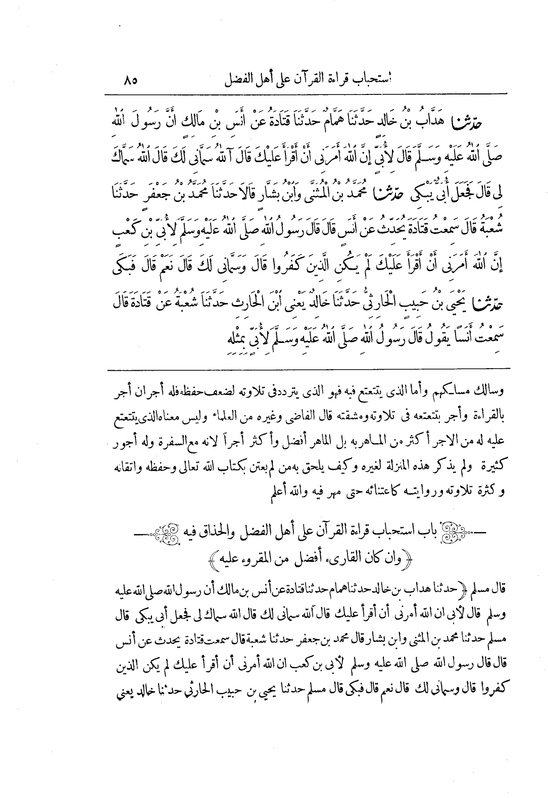 [799] قَالَ مُسْلِمٌ حَدَّثَنَا هَدَّابُ بْنُ خَالِدٍ حَدَّثَنَا هَمَّامُ حَدَّثَنَا قَتَادَةُ عَنْ أَنَسِ بْنِ مَالِكٍ إن رسول الله صلى الله عليه وسلم قَالَ لِأُبَيٍّ إِنَّ اللَّهَ أَمَرَنِي أَنْ أَقْرَأَ عَلَيْكَ قَالَ اللَّهُ سَمَّانِي لَكَ قَالَ اللَّهُ سَمَّاكَ لِي فَجَعَلَ أُبَيٌّ يَبْكِي قَالَ مُسْلِمٌ حدثنا محمد بن المثني وبن بَشَّارٍ قَالَ مُحَمَّدُ بْنُ جَعْفَرٍ حَدَّثَنَا شُعْبَةُ قَالَ سَمِعْتُ قَتَادَةَ يُحَدِّثُ عَنْ أَنَسٍ قَالَ قَالَ رَسُولُ اللَّهِ صَلَّى اللَّهُ عَلَيْهِ وَسَلَّمَ لِأُبَيِّ بْنِ كَعْبٍ إِنَّ اللَّهَ أَمَرَنِي أَنْ أَقْرَأَ عَلَيْكَ لَمْ يَكُنِ الَّذِينَ كَفَرُوا قَالَ وَسَمَّانِي لَكَ قَالَ نَعَمْ قَالَ فَبَكَى قَالَ مُسْلِمٌ حَدَّثَنَا يَحْيَى بْنُ حَبِيبٍ الْحَارِثِيُّ حَدَّثَنَا خالد يعني