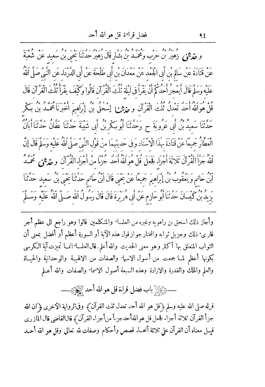 [811] قوله ص قُلْ هُوَ اللَّهُ أَحَدٌ تَعْدِلُ ثُلُثَ الْقُرْآنِ وَفِي الرِّوَايَةِ الْأُخْرَى إِنَّ اللَّهَ جَزَّأَ الْقُرْآنَ ثَلَاثَةَ أَجْزَاءٍ فَجَعَلَ قُلْ هُوَ اللَّهُ أَحَدٌ جُزْءًا مِنْ أَجْزَاءِ الْقُرْآنِ قَالَ الْقَاضِي قَالَ الْمَازِرِيُّ قِيلَ مَعْنَاهُ أَنَّ الْقُرْآنَ عَلَى ثَلَاثَةِ أنحاء قصص وأحكام وصفات لله تعالى وقل هو الله أحد