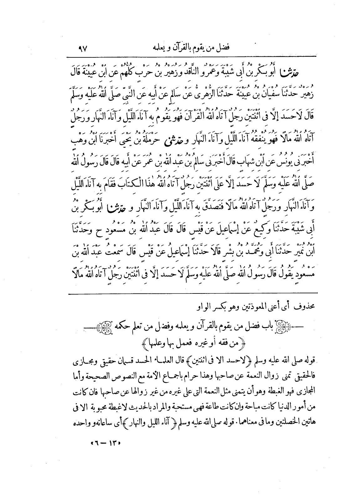 [815] قَوْلُهُ صَلَّى اللَّهُ عَلَيْهِ وَسَلَّمَ لَا حَسَدَ إِلَّا فِي اثْنَتَيْنِ قَالَ الْعُلَمَاءُ الْحَسَدُ قِسْمَانِ حَقِيقِيٌّ وَمَجَازِيٌّ فَالْحَقِيقِيُّ تَمَنِّي زَوَالِ النِّعْمَةِ عَنْ صَاحِبِهَا وَهَذَا حَرَامٌ بِإِجْمَاعِ الْأُمَّةِ مَعَ النُّصُوصِ الصَّحِيحَةِ وَأَمَّا الْمَجَازِيُّ فَهُوَ الْغِبْطَةُ وَهُوَ أَنْ يَتَمَنَّى مِثْلَ النِّعْمَةِ الَّتِي عَلَى غَيْرِهِ مِنْ غَيْرِ زَوَالِهَا عَنْ صَاحِبِهَا فَإِنْ كَانَتْ مِنْ أُمُورِ الدُّنْيَا كَانَتْ مُبَاحَةً وَإِنْ كَانَتْ طَاعَةً فَهِيَ مُسْتَحَبَّةٌ وَالْمُرَادُ بِالْحَدِيثِ لَا غِبْطَةَ مَحْبُوبَةٌ إِلَّا فِي هَاتَيْنِ الْخَصْلَتَيْنِ وَمَا فِي مَعْنَاهُمَا قَوْلُهُ صَلَّى اللَّهُ عَلَيْهِ وَسَلَّمَ آنَاءَ اللَّيْلِ وَالنَّهَارِ أَيْ سَاعَاتُهُ وَوَاحِدُهُ