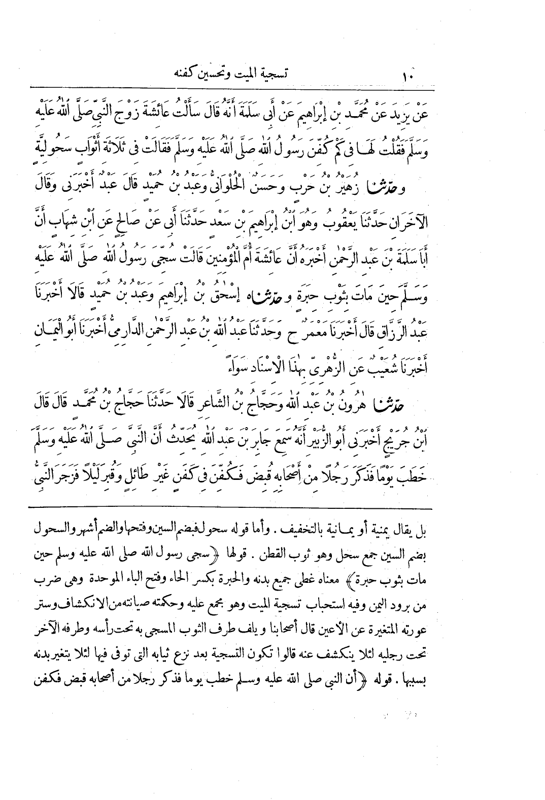 [942] قَوْلُهَا (سُجِّيَ رَسُولِ اللَّهِ صَلَّى اللَّهُ عَلَيْهِ وَسَلَّمَ حِينَ مَاتَ بِثَوْبِ حِبَرَةٍ) مَعْنَاهُ غُطِّيَ جَمِيعُ بَدَنِهِ وَالْحِبَرَةُ بِكَسْرِ الْحَاءِ وَفَتْحِ الْبَاءِ الْمُوَحَّدَةِ وَهِيَ ضَرْبٌ مِنْ بُرُودِ الْيَمَنِ وَفِيهِ اسْتِحْبَابُ تَسْجِيَةِ الْمَيِّتِ وَهُوَ مُجْمَعٌ عَلَيْهِ وَحِكْمَتُهُ صِيَانَتُهُ مِنْ الِانْكِشَافِ وَسَتْرُ عَوْرَتِهِ الْمُتَغَيِّرَةِ عَنِ الْأَعْيُنِ قَالَ أَصْحَابُنَا وَيَلُفُّ طَرَفُ الثَّوْبِ الْمُسَجَّى بِهِ تَحْتَ رَأْسِهِ وَطَرَفُهُ الْآخَرُ تَحْتَ رِجْلَيْهِ لِئَلَّا يَنْكَشِفَ عَنْهُ قَالُوا تَكُونُ التَّسْجِيَةُ بَعْدَ نَزْعِ ثِيَابِهِ الَّتِي تُوُفِّيَ فِيهَا لِئَلَّا يتغير بدنه بسببها