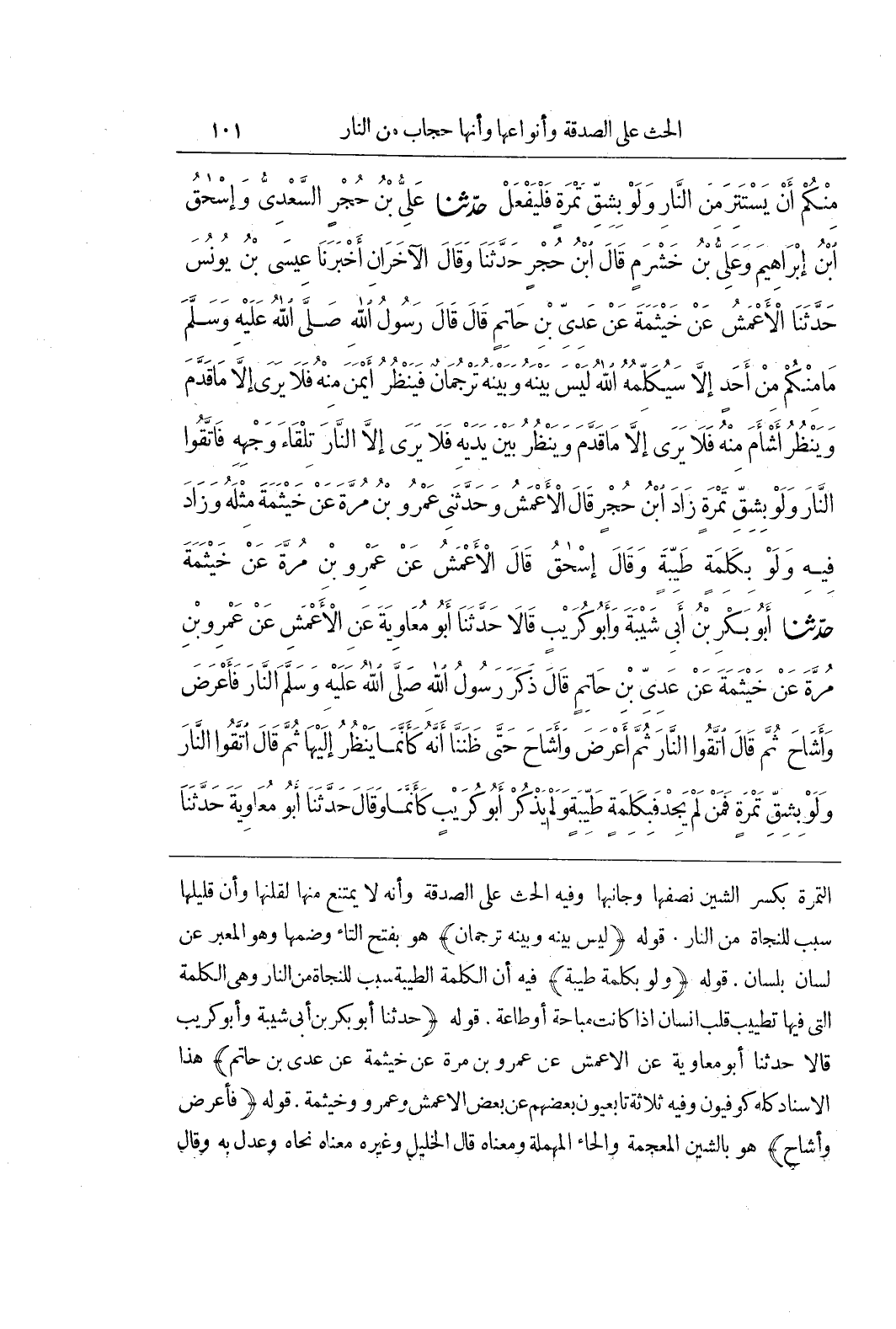 التَّمْرَةِ بِكَسْرِ الشِّينِ نِصْفُهَا وَجَانِبُهَا وَفِيهِ الْحَثُّ عَلَى الصَّدَقَةِ وَأَنَّهُ لَا يَمْتَنِعُ مِنْهَا لِقِلَّتِهَا وَأَنَّ قَلِيلَهَا سَبَبٌ لِلنَّجَاةِ مِنَ النَّارِ قَوْلُهُ (لَيْسَ بَيْنَهُ وَبَيْنَهُ تَرْجُمَانٌ) هُوَ بِفَتْحِ التَّاءِ وَضَمِّهَا وَهُوَ الْمُعَبِّرُ عَنْ لِسَانٍ بِلِسَانٍ قَوْلُهُ (وَلَوْ بِكَلِمَةٍ طَيِّبَةٍ) فِيهِ أَنَّ الْكَلِمَةَ الطَّيِّبَةَ سَبَبٌ لِلنَّجَاةِ مِنَ النَّارِ وَهِيَ الْكَلِمَةُ الَّتِي فيها تطيب قَلْبِ إِنْسَانٍ إِذَا كَانَتْ مُبَاحَةً أَوْ طَاعَةً قَوْلُهُ (حَدَّثَنَا أَبُو بَكْرِ بْنُ أَبِي شَيْبَةَ وَأَبُو كُرَيْبٍ قَالَا حَدَّثَنَا أَبُو مُعَاوِيَةَ عَنِ الْأَعْمَشِ عَنْ عَمْرِو بْنِ مُرَّةَ عَنْ خَيْثَمَةَ عَنْ عَدِيِّ بْنِ حَاتِمٍ) هَذَا الْإِسْنَادُ كُلُّهُ كُوفِيُّونَ وَفِيهِ ثَلَاثَةٌ تَابِعِيُّونَ بَعْضُهُمْ عَنْ بَعْضٍ الْأَعْمَشُ وَعَمْرٌو وَخَيْثَمَةُ قَوْلُهُ (فَأَعْرَضَ وَأَشَاحَ) هُوَ بِالشِّينِ الْمُعْجَمَةِ وَالْحَاءِ الْمُهْمَلَةِ وَمَعْنَاهُ قَالَ الْخَلِيلُ وَغَيْرُهُ مَعْنَاهُ نَحَّاهُ وَعَدَلَ بِهِ وَقَالَ