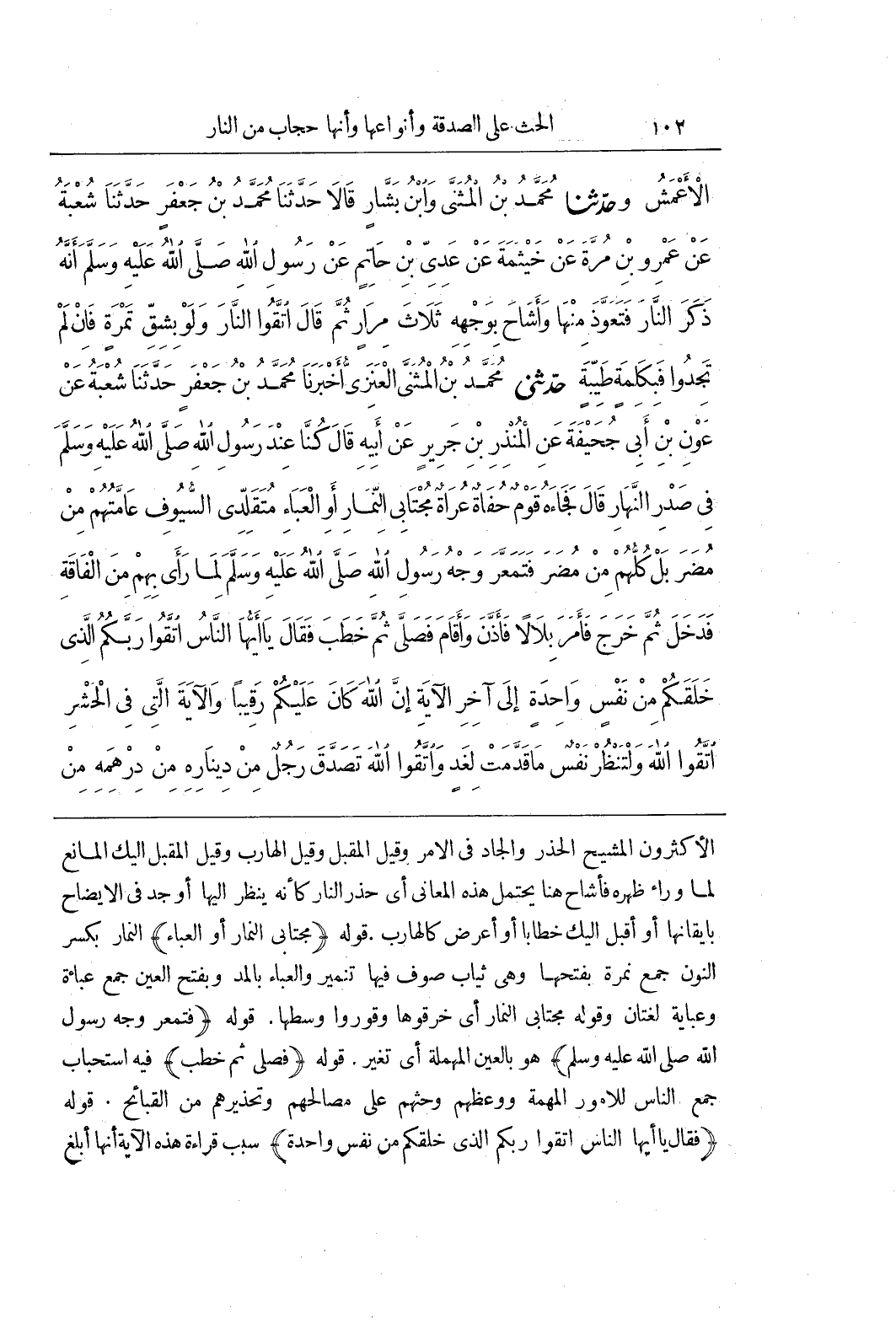 [1017] قَوْلُهُ (مُجْتَابِي النِّمَارِ أَوَ الْعَبَاءِ) النِّمَارُ بِكَسْرِ النُّونِ جَمْعُ نَمِرَةٍ بفتحها وهي ثياب صوف فيها تنمير والعباء بِالْمَدِّ وَبِفَتْحِ الْعَيْنِ جَمْعُ عَبَاءَةٍ وَعَبَايَةٍ لُغَتَانِ وَقَوْلُهُ مُجْتَابِي النِّمَارِ أَيْ خَرَقُوهَا وَقَوَّرُوا وَسَطَهَا قَوْلُهُ (فَتَمَعَّرَ وَجْهُ رَسُولِ اللَّهِ صَلَّى اللَّهُ عَلَيْهِ وَسَلَّمَ) هُوَ بِالْعَيْنِ الْمُهْمَلَةِ أَيْ تَغَيَّرَ قَوْلُهُ (فَصَلَّى ثُمَّ خَطَبَ) فِيهِ اسْتِحْبَابُ جَمْعِ النَّاسِ لِلْأُمُورِ الْمُهِمَّةِ وَوَعْظِهِمْ وَحَثِّهِمْ عَلَى مَصَالِحِهِمْ وَتَحْذِيرِهِمْ مِنَ الْقَبَائِحِ قَوْلُهُ (فَقَالَ يَا أَيُّهَا النَّاسُ اتَّقُوا رَبَّكُمُ الَّذِي خَلَقَكُمْ مِنْ نَفْسٍ واحدة) سَبَبُ قِرَاءَةِ هَذِهِ الْآيَةِ أَنَّهَا أَبْلَغُ
