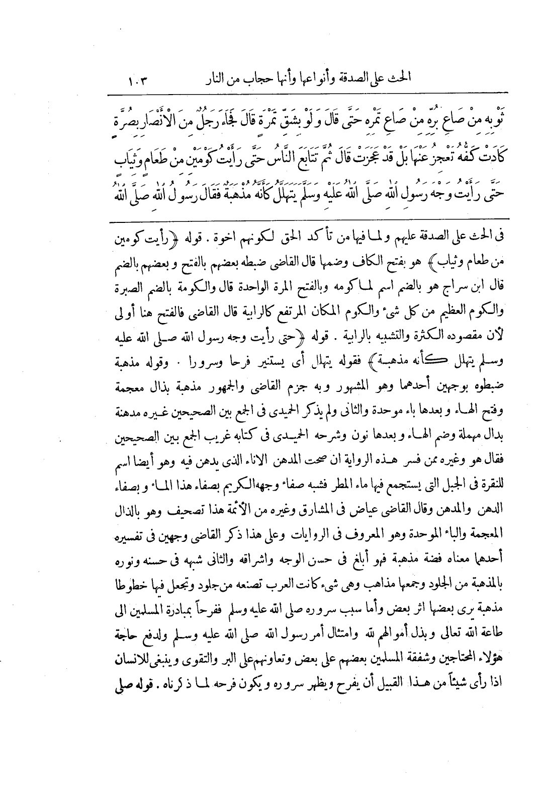 فِي الْحَثِّ عَلَى الصَّدَقَةِ عَلَيْهِمْ وَلِمَا فِيهَا مِنْ تَأَكُّدِ الْحَقِّ لِكَوْنِهِمْ إِخْوَةً قَوْلُهُ (رَأَيْتُ كَوْمَيْنِ مِنْ طَعَامٍ وَثِيَابٍ) هُوَ بِفَتْحِ الْكَافِ وَضَمِّهَا قَالَ الْقَاضِي ضَبَطَهُ بَعْضُهُمْ بِالْفَتْحِ وَبَعْضُهُمْ بالضم قال بن سِرَاجٍ هُوَ بِالضَّمِّ اسْمٌ لِمَا كَوَّمَهُ وَبِالْفَتْحِ الْمَرَّةُ الْوَاحِدَةُ قَالَ وَالْكُوْمَةُ بِالضَّمِّ الصُّبْرَةُ وَالْكَوْمُ الْعَظِيمُ مِنْ كُلِّ شَيْءٍ وَالْكَوْمُ الْمَكَانُ الْمُرْتَفِعُ كَالرَّابِيَةِ قَالَ الْقَاضِي فَالْفَتْحُ هُنَا أَوْلَى لِأَنَّ مَقْصُودَهُ الْكَثْرَةُ وَالتَّشْبِيهُ بِالرَّابِيَةِ قَوْلُهُ (حَتَّى رَأَيْتُ وَجْهَ رَسُولِ اللَّهِ صَلَّى اللَّهُ عَلَيْهِ وَسَلَّمَ يَتَهَلَّلُ كَأَنَّهُ مُذْهَبَةٌ) فَقَوْلُهُ يَتَهَلَّلُ أَيْ يَسْتَنِيرُ فَرَحًا وَسُرُورًا وَقَوْلُهُ مُذْهَبَةٌ ضَبَطُوهُ بِوَجْهَيْنِ أَحَدُهُمَا وَهُوَ الْمَشْهُورُ وَبِهِ جَزَمَ الْقَاضِي وَالْجُمْهُورُ مُذْهَبَةٌ بِذَالٍ مُعْجَمَةٍ وَفَتْحِ الْهَاءِ وَبَعْدَهَا بَاءٌ مُوَحَّدَةٌ وَالثَّانِي وَلَمْ يَذْكُرِ الْحُمَيْدِيُّ فِي الْجَمْعِ بَيْنَ الصَّحِيحَيْنِ غَيْرَهُ مُدْهُنَةٌ بِدَالٍ مُهْمَلَةٍ وَضَمِّ الْهَاءِ وَبَعْدَهَا نُونٌ وَشَرَحَهُ الْحُمَيْدِيُّ فِي كِتَابِهِ غَرِيبُ الْجَمْعِ بَيْنَ الصَّحِيحَيْنِ فَقَالَ هُوَ وَغَيْرُهُ مِمَّنْ فَسَّرَ هَذِهِ الرِّوَايَةَ إِنْ صَحَّتِ الْمُدْهُنُ الْإِنَاءُ الَّذِي يُدْهَنُ فِيهِ وَهُوَ أَيْضًا اسْمٌ لِلنُّقْرَةِ فِي الْجَبَلِ الَّتِي يُسْتَجْمَعُ فِيهَا مَاءُ الْمَطَرِ فَشَبَّهَ صَفَاءَ وَجْهِهِ الْكَرِيمِ بِصَفَاءِ هَذَا الْمَاءِ وَبِصَفَاءِ الدُّهْنِ وَالْمُدْهُنُ وَقَالَ الْقَاضِي عِيَاضٌ فِي الْمَشَارِقِ وَغَيْرُهُ مِنَ الْأَئِمَّةِ هَذَا تَصْحِيفٌ وَهُوَ بِالذَّالِ الْمُعْجَمَةِ وَالْبَاءِ الْمُوَحَّدَةِ وَهُوَ الْمَعْرُوفُ فِي الرِّوَايَاتِ وَعَلَى هَذَا ذَكَرَ الْقَاضِي وَجْهَيْنِ فِي تَفْسِيرِهِ أَحَدُهُمَا مَعْنَاهُ فِضَّةٌ مُذْهَبَةٌ فَهُوَ أَبْلَغُ فِي حُسْنِ الْوَجْهِ وَإِشْرَاقِهِ وَالثَّانِي شَبَّهَهُ فِي حُسْنِهِ وَنُورِهِ بِالْمُذْهَبَةِ مِنَ الْجُلُودِ وَجَمْعُهَا مَذَاهِبُ وَهِيَ شَيْءٌ كَانَتِ الْعَرَبُ تَصْنَعُهُ مِنْ جُلُودٍ وَتَجْعَلُ فِيهَا خُطُوطًا مُذْهَبَةً يُرَى بَعْضُهَا إِثْرَ بَعْضٍ وَأَمَّا سَبَبُ سُرُورِهِ صَلَّى اللَّهُ عَلَيْهِ وَسَلَّمَ فَفَرَحًا بِمُبَادَرَةِ الْمُسْلِمِينَ إِلَى طَاعَةِ اللَّهِ تَعَالَى وَبَذْلِ أَمْوَالِهِمْ لِلَّهِ وَامْتِثَالِ أَمْرِ رَسُولِ اللَّهِ صَلَّى اللَّهُ عَلَيْهِ وَسَلَّمَ وَلِدَفْعِ حَاجَةِ هَؤُلَاءِ الْمُحْتَاجِينَ وَشَفَقَةِ الْمُسْلِمِينَ بَعْضِهِمْ عَلَى بَعْضٍ وَتَعَاوُنِهِمْ عَلَى الْبِرِّ وَالتَّقْوَى وَيَنْبَغِي لِلْإِنْسَانِ إِذَا رَأَى شَيْئًا مِنْ هَذَا الْقَبِيلِ أَنْ يَفْرَحَ وَيُظْهِرَ سُرُورَهُ وَيَكُونَ فَرَحُهُ لِمَا ذَكَرْنَاهُ قَوْلُهُ صَلَّى اللَّهُ عَلَيْهِ وَسَلَّمَ