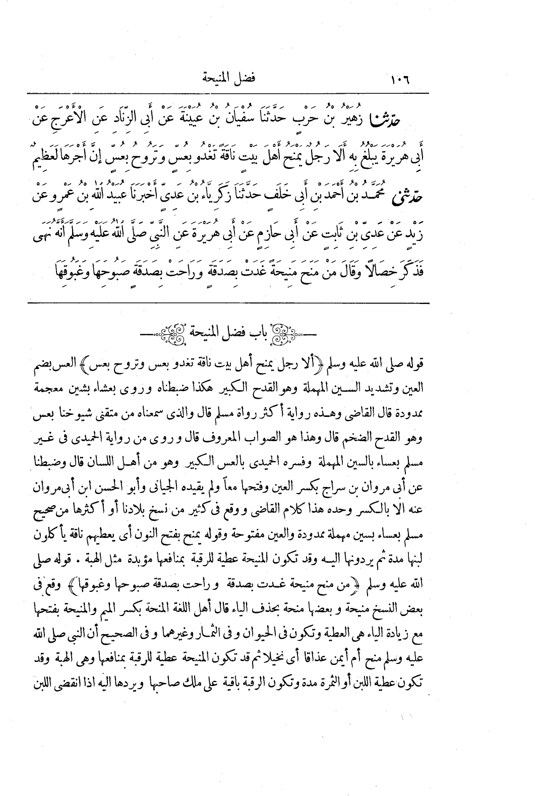 [1020] قَوْلُهُ صَلَّى اللَّهُ عَلَيْهِ وَسَلَّمَ (مَنْ مَنَحَ مَنِيحَةً غَدَتْ بِصَدَقَةٍ وَرَاحَتْ بِصَدَقَةٍ صَبُوحَهَا وَغَبُوقَهَا) وَقَعَ فِي بَعْضِ النُّسَخِ مَنِيحَةً وَبَعْضِهَا مِنْحَةً بِحَذْفِ الْيَاءِ قَالَ أَهْلُ اللُّغَةِ الْمِنْحَةُ بِكَسْرِ الْمِيمِ وَالْمَنِيحَةُ بِفَتْحِهَا مَعَ زِيَادَةِ الْيَاءِ هِيَ الْعَطِيَّةُ وَتَكُونُ فِي الْحَيَوَانِ وَفِي الثِّمَارِ وَغَيْرِهِمَا وَفِي الصَّحِيحِ أَنَّ النَّبِيَّ صَلَّى اللَّهُ عَلَيْهِ وَسَلَّمَ مَنَحَ أُمَّ أَيْمَنَ عِذَاقًا أَيْ نَخِيلًا ثُمَّ قَدْ تَكُونُ الْمَنِيحَةُ عَطِيَّةً لِلرَّقَبَةِ بِمَنَافِعِهَا وَهِيَ الْهِبَةُ وَقَدْ تَكُونُ عَطِيَّةَ اللَّبَنِ أَوَ الثَّمَرَةِ مُدَّةً وَتَكُونُ الرَّقَبَةُ بَاقِيَةً عَلَى مِلْكِ صَاحِبِهَا وَيَرُدُّهَا إِلَيْهِ إِذَا انْقَضَى اللَّبَنُ