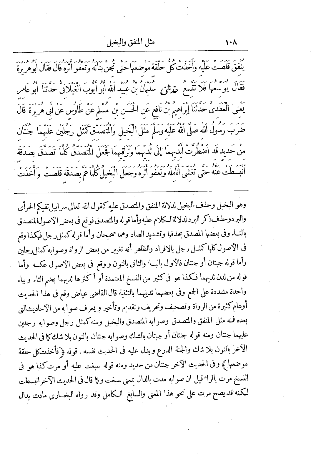 وَهُوَ الْبَخِيلُ وَحَذَفَ الْبَخِيلَ لِدَلَالَةِ الْمُنْفِقِ وَالْمُتَصَدِّقِ عَلَيْهِ كَقَوْلِ اللَّهِ تَعَالَى سَرَابِيلَ تَقِيكُمُ الْحَرَّ أَيْ وَالْبَرْدَ وَحَذَفَ ذِكْرَ الْبَرْدِ لِدَلَالَةِ الْكَلَامِ عَلَيْهِ وَأَمَّا قَوْلُهُ وَالْمُتَصَدِّقِ فَوَقَعَ فِي بَعْضِ الْأُصُولِ الْمُتَصَدِّقِ بِالتَّاءِ وَفِي بَعْضِهَا الْمُصَّدِّقِ بِحَذْفِهَا وَتَشْدِيدِ الصَّادِ وَهُمَا صَحِيحَانِ وَأَمَّا قَوْلُهُ كَمَثَلِ رَجُلٍ فَهَكَذَا وَقَعَ فِي الْأُصُولِ كُلِّهَا كَمَثَلِ رَجُلٍ بِالْإِفْرَادِ وَالظَّاهِرُ أَنَّهُ تَغْيِيرٌ مِنْ بَعْضِ الرُّوَاةِ وَصَوَابُهُ كَمَثَلِ رَجُلَيْنِ وَأَمَّا قَوْلُهُ جُبَّتَانِ أَوْ جُنَّتَانِ فَالْأَوَّلُ بِالْبَاءِ وَالثَّانِي بِالنُّونِ وَوَقَعَ فِي بَعْضِ الْأُصُولِ عَكْسَهُ وَأَمَّا قَوْلُهُ مِنْ لَدُنْ ثُدْيهِمَا فَكَذَا هُوَ فِي كَثِيرٍ مِنَ النُّسَخِ الْمُعْتَمَدَةِ أَوْ أَكْثَرِهَا ثُدْيهِمَا بِضَمِّ الثَّاءِ وَبِيَاءٍ وَاحِدَةٍ مُشَدَّدَةٍ عَلَى الْجَمْعِ وَفِي بَعْضِهِمَا ثُدْيَيْهِمَا بِالتَّثْنِيَةِ قَالَ الْقَاضِي عِيَاضٌ وَقَعَ فِي هَذَا الْحَدِيثِ أَوْهَامٌ كَثِيرَةٌ مِنَ الرُّوَاةِ وَتَصْحِيفٌ وَتَحْرِيفٌ وَتَقْدِيمٌ وَتَأْخِيرٌ وَيُعْرَفُ صَوَابُهُ مِنَ الْأَحَادِيثِ الَّتِي بَعْدَهُ فَمِنْهُ مَثَلُ الْمُنْفِقِ وَالْمُتَصَدِّقِ وَصَوَابُهُ الْمُتَصَدِّقِ وَالْبَخِيلِ وَمِنْهُ كَمَثَلِ رَجُلٍ وَصَوَابُهُ رَجُلَيْنِ عَلَيْهِمَا جُنَّتَانِ وَمِنْهُ قَوْلُهُ جُنَّتَانِ أَوْ جُبَّتَانِ بِالشَّكِّ وَصَوَابُهُ جُنَّتَانِ بِالنُّونِ بِلَا شَكٍّ كَمَا فِي الْحَدِيثِ الْآخَرِ بِالنُّونِ بِلَا شَكٍّ وَالْجُنَّةُ الدِّرْعُ وَيَدُلُّ عَلَيْهِ فِي الْحَدِيثِ نَفْسِهِ قَوْلُهُ (فَأَخَذَتْ كُلُّ حَلْقَةٍ مَوْضِعَهَا) وَفِي الْحَدِيثِ الْآخَرِ جُنَّتَانِ مِنْ حَدِيدٍ وَمِنْهُ قَوْلُهُ سَبَغَتْ عَلَيْهِ أَوْ مَرَّتْ كَذَا هُوَ فِي النُّسَخِ مَرَّتْ بِالرَّاءِ قِيلَ إِنَّ صَوَابَهُ مُدَّتْ بِالدَّالِ بِمَعْنَى سَبَغَتْ وَكَمَا قَالَ فِي الْحَدِيثِ الْآخَرِ انْبَسَطَتْ لَكِنَّهُ قَدْ يَصِحُّ مَرَّتْ عَلَى نَحْوِ هَذَا الْمَعْنَى وَالسَّابِغُ الْكَامِلُ وَقَدْ رَوَاهُ الْبُخَارِيُّ مَادَتْ بدال