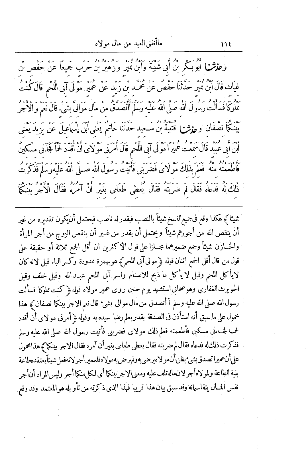 [1025] قَوْلُهُ (مَوْلَى آبِي اللَّحْمِ) هُوَ بِهَمْزَةٍ مَمْدُودَةٍ وَكَسْرِ الْبَاءِ قِيلَ لِأَنَّهُ كَانَ لَا يَأْكُلُ اللَّحْمَ وَقِيلَ لَا يَأْكُلُ مَا ذُبِحَ لِلْأَصْنَامِ وَاسْمُ آبِي اللَّحْمِ عَبْدُ اللَّهِ وَقِيلَ خَلَفٌ وَقِيلَ الْحُوَيْرِثُ الْغِفَارِيُّ وَهُوَ صَحَابِيٌّ اسْتُشْهِدَ يَوْمَ حُنَيْنٍ رَوَى عُمَيْرٌ مَوْلَاهُ قَوْلَهُ (كُنْتُ مَمْلُوكًا فَسَأَلْتُ رَسُولَ اللَّهِ صَلَّى اللَّهُ عَلَيْهِ وَسَلَّمَ أَأَتَصَدَّقُ مِنْ مَالِ مَوَالِيَّ بِشَيْءٍ قَالَ نَعَمِ الْأَجْرُ بَيْنَكُمَا نِصْفَانِ) هَذَا مَحْمُولٌ عَلَى مَا سَبَقَ أَنَّهُ اسْتَأْذَنَ فِي الصَّدَقَةِ بِقَدْرٍ يَعْلَمُ رِضَا سَيِّدِهِ بِهِ وَقَوْلُهُ (أَمَرَنِي مَوْلَايَ أَنْ أُقَدِّدَ لَحْمًا فَجَاءَنِي مِسْكِينٌ فَأَطْعَمْتُهُ فَعَلِمَ ذَلِكَ مَوْلَايَ فَضَرَبَنِي فَأَتَيْتُ رَسُولَ اللَّهِ صَلَّى اللَّهُ عَلَيْهِ وَسَلَّمَ فَذَكَرْتُ ذَلِكَ لَهُ فَدَعَاهُ فَقَالَ لِمَ ضَرَبْتَهُ فَقَالَ يُعْطِي طَعَامِي بِغَيْرِ أَنْ آمُرَهُ فَقَالَ الْأَجْرُ بَيْنَكُمَا) هَذَا مَحْمُولٌ عَلَى أَنَّ عُمَيْرًا تَصَدَّقَ بِشَيْءٍ يَظُنُّ أَنَّ مَوْلَاهُ يَرْضَى بِهِ وَلَمْ يَرْضَ بِهِ مَوْلَاهُ فَلِعُمَيْرٍ أَجْرٌ لأنه فعل شيئا يعتقد طَاعَةً بِنِيَّةِ الطَّاعَةِ وَلِمَوْلَاهُ أَجْرٌ لِأَنَّ مَالَهُ تَلِفَ عَلَيْهِ وَمَعْنَى الْأَجْرُ بَيْنَكُمَا أَيْ لِكُلٍّ مِنْكُمَا أَجْرٌ وَلَيْسَ الْمُرَادُ أَنَّ أَجْرَ نَفْسِ الْمَالِ يَتَقَاسَمَانِهِ وَقَدْ سَبَقَ بَيَانُ هَذَا قَرِيبًا فَهَذَا الَّذِي ذَكَرْتُهُ مِنْ تَأْوِيلِهِ هُوَ الْمُعْتَمَدُ وقد وقع