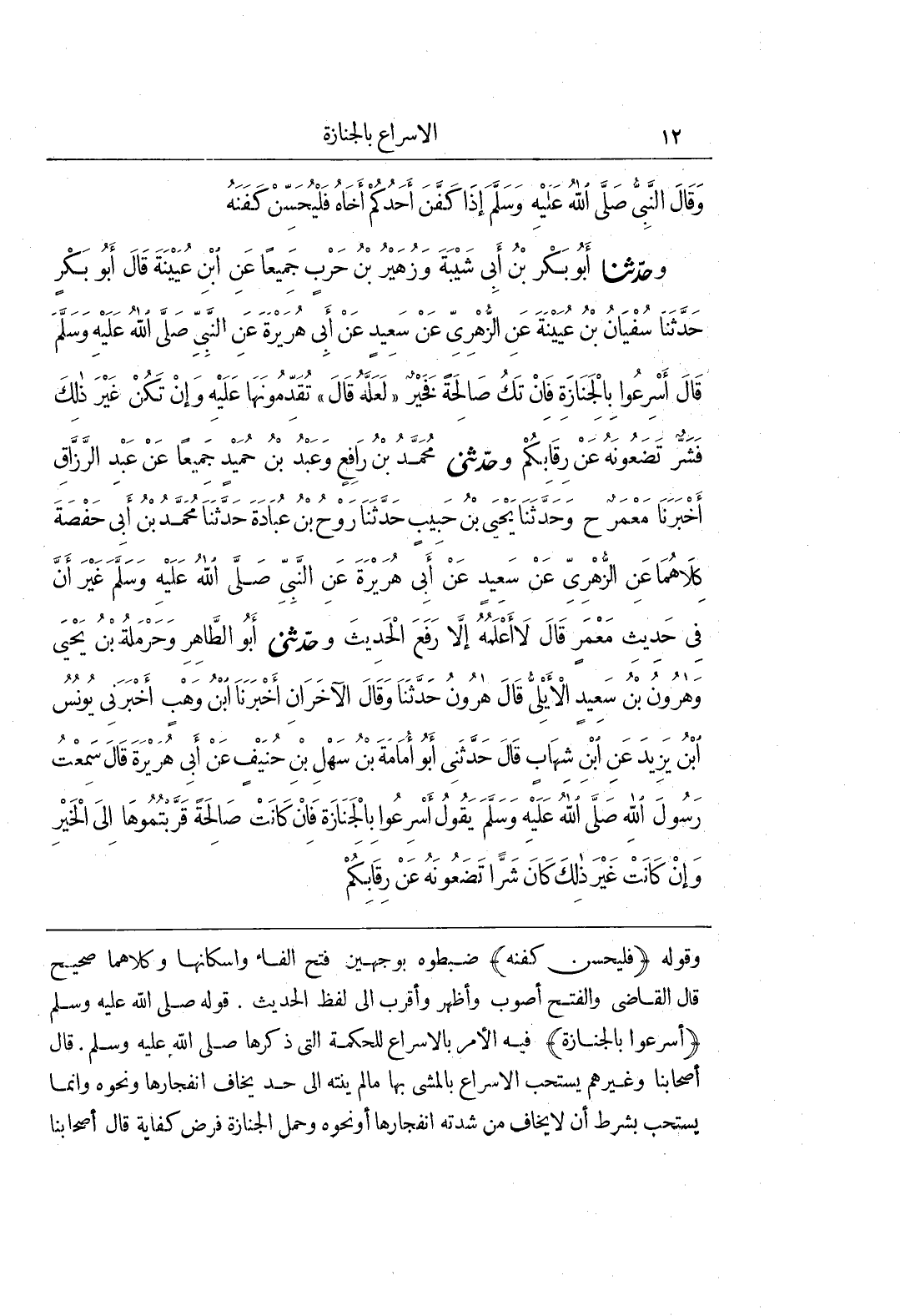 [944] قَوْلُهُ صَلَّى اللَّهُ عَلَيْهِ وَسَلَّمَ (أَسْرِعُوا بِالْجِنَازَةِ) فِيهِ الْأَمْرُ بِالْإِسْرَاعِ لِلْحِكْمَةِ الَّتِي ذَكَرَهَا صَلَّى اللَّهُ عَلَيْهِ وَسَلَّمَ قَالَ أَصْحَابُنَا وَغَيْرُهُمْ يُسْتَحَبُّ الْإِسْرَاعُ بِالْمَشْيِ بِهَا مَا لَمْ يَنْتَهِ إِلَى حَدٍّ يَخَافُ انْفِجَارَهَا وَنَحْوَهُ وَإِنَّمَا يُسْتَحَبُّ بِشَرْطِ أَنْ لَا يَخَافَ مِنْ شِدَّتِهِ انْفِجَارَهَا أَوْ نَحْوَهُ وَحَمْلُ الْجِنَازَةِ فَرْضُ كِفَايَةٍ قَالَ أَصْحَابُنَا