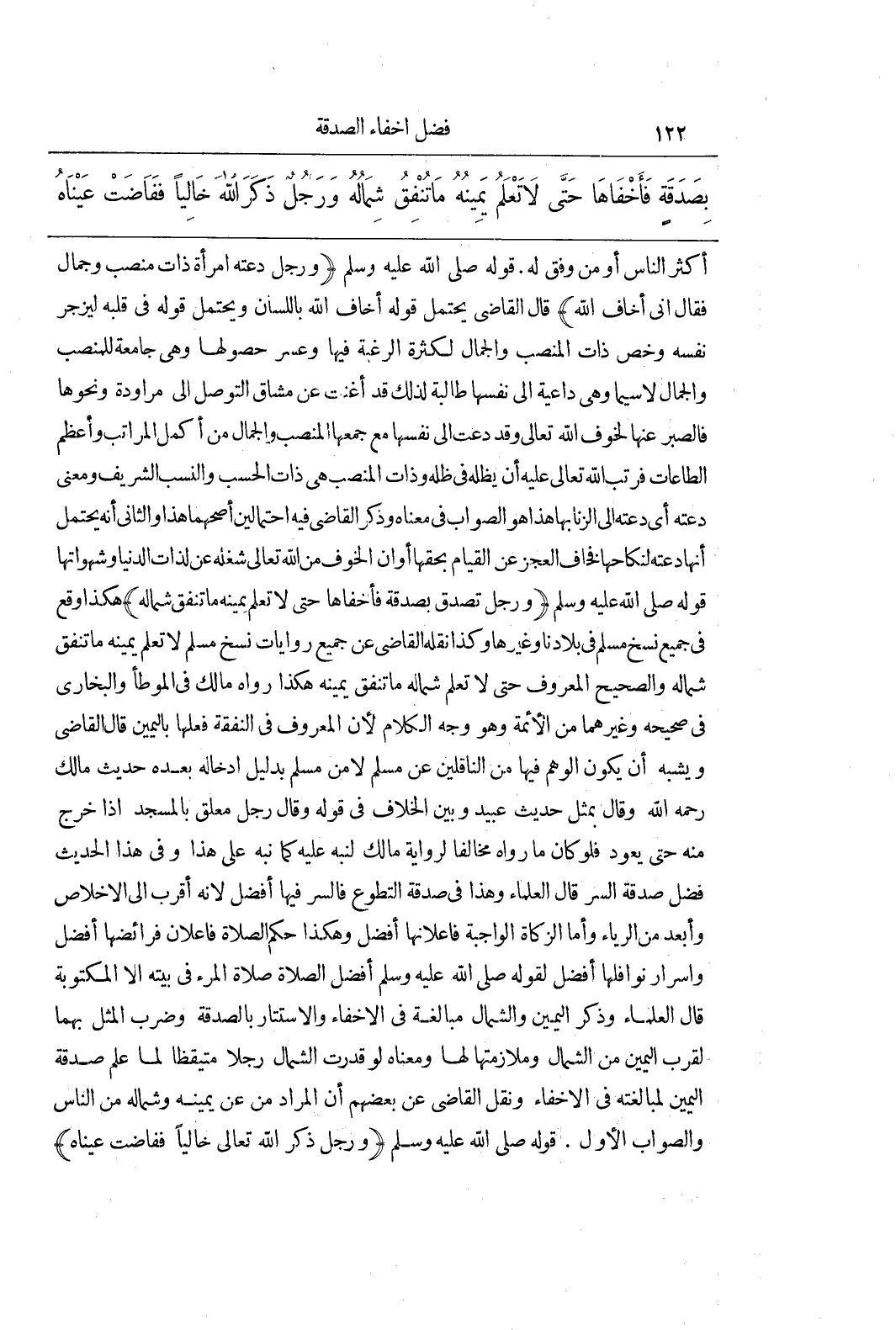 أَكْثَرُ النَّاسِ أَوْ مَنْ وُفِّقَ لَهُ قَوْلُهُ صَلَّى اللَّهُ عَلَيْهِ وَسَلَّمَ (وَرَجُلٌ دَعَتْهُ امْرَأَةٌ ذَاتُ مَنْصِبٍ وَجَمَالٍ فَقَالَ إِنِّي أَخَافُ اللَّهَ) قَالَ الْقَاضِي يَحْتَمِلُ قَوْلُهُ أَخَافُ اللَّهَ بِاللِّسَانِ وَيَحْتَمِلُ قَوْلُهُ فِي قَلْبِهِ لِيَزْجُرَ نَفْسَهُ وَخَصَّ ذَاتَ الْمَنْصِبِ وَالْجَمَالِ لِكَثْرَةِ الرَّغْبَةِ فِيهَا وَعُسْرِ حُصُولِهَا وَهِيَ جَامِعَةٌ لِلْمَنْصِبِ وَالْجَمَالِ لَا سِيَّمَا وَهِيَ دَاعِيَةٌ إِلَى نَفْسِهَا طَالِبَةٌ لِذَلِكَ قَدْ أَغْنَتْ عَنْ مَشَاقِّ التَّوَصُّلِ إِلَى مُرَاوَدَةٍ وَنَحْوِهَا فَالصَّبْرُ عَنْهَا لِخَوْفِ اللَّهِ تَعَالَى وَقَدْ دَعَتْ إِلَى نَفْسِهَا مَعَ جَمْعِهَا الْمَنْصِبَ وَالْجَمَالَ مِنْ أَكْمَلِ الْمَرَاتِبِ وَأَعْظَمِ الطَّاعَاتِ فَرَتَّبَ اللَّهُ تَعَالَى عَلَيْهِ أَنْ يُظِلَّهُ فِي ظِلِّهِ وَذَاتُ الْمَنْصِبِ هِيَ ذَاتُ الْحَسَبِ وَالنَّسَبِ الشَّرِيفِ وَمَعْنَى دَعَتْهُ أي دعته إلى الزنى بِهَا هَذَا هُوَ الصَّوَابُ فِي مَعْنَاهُ وَذَكَرَ الْقَاضِي فِيهِ احْتِمَالَيْنِ أَصَحَّهُمَا هَذَا وَالثَّانِي أَنَّهُ يَحْتَمِلُ أَنَّهَا دَعَتْهُ لِنِكَاحِهَا فَخَافَ الْعَجْزَ عَنِ الْقِيَامِ بِحَقِّهَا أَوْ أَنَّ الْخَوْفَ مِنَ اللَّهِ تَعَالَى شَغْلَهُ عَنْ لِذَاتِ الدُّنْيَا وَشَهَوَاتِهَا قَوْلُهُ صَلَّى اللَّهُ عَلَيْهِ وَسَلَّمَ (وَرَجُلٌ تَصَدَّقَ بِصَدَقَةٍ فَأَخْفَاهَا حَتَّى لَا تَعْلَمَ يَمِينُهُ مَا تُنْفِقُ شِمَالُهُ) هَكَذَا وَقَعَ فِي جَمِيعِ نُسَخِ مُسْلِمٍ فِي بِلَادِنَا وَغَيْرِهَا وَكَذَا نَقَلَهُ الْقَاضِي عَنْ جَمِيعِ رِوَايَاتِ نُسَخِ مُسْلِمٍ لَا تَعْلَمَ يَمِينُهُ مَا تُنْفِقُ شِمَالُهُ وَالصَّحِيحُ الْمَعْرُوفُ حَتَّى لَا تَعْلَمَ شِمَالُهُ مَا تُنْفِقُ يَمِينُهُ هَكَذَا رَوَاهُ مَالِكٌ فِي الْمُوَطَّأِ وَالْبُخَارِيُّ فِي صَحِيحِهِ وَغَيْرُهُمَا مِنَ الْأَئِمَّةِ وَهُوَ وَجْهُ الْكَلَامِ لِأَنَّ الْمَعْرُوفَ فِي النَّفَقَةِ فِعْلُهَا بِالْيَمِينِ قَالَ الْقَاضِي وَيُشْبِهُ أَنْ يَكُونَ الْوَهَمُ فِيهَا مِنَ النَّاقِلِينَ عَنْ مُسْلِمٍ لَا مِنْ مُسْلِمٍ بِدَلِيلِ إِدْخَالِهِ بَعْدَهُ حَدِيثَ مَالِكٍ رَحِمَهُ اللَّهُ وَقَالَ بِمِثْلِ حَدِيثِ عُبَيْدٍ وَبَيَّنَ الْخِلَافَ فِي قَوْلِهِ وَقَالَ رَجُلٌ مُعَلَّقٌ بِالْمَسْجِدِ إِذَا خَرَجَ مِنْهُ حَتَّى يَعُودَ فَلَوْ كَانَ مَا رَوَاهُ مُخَالِفًا لِرِوَايَةِ مَالِكٍ لَنَبَّهَ عَلَيْهِ كَمَا نَبَّهَ عَلَى هَذَا وَفِي هَذَا الْحَدِيثِ فَضْلُ صَدَقَةِ السِّرِّ قَالَ الْعُلَمَاءُ وَهَذَا فِي صَدَقَةِ التَّطَوُّعِ فَالسِّرُّ فِيهَا أَفْضَلُ لِأَنَّهُ أَقْرَبُ إِلَى الْإِخْلَاصِ وَأَبْعَدُ مِنَ الرِّيَاءِ وَأَمَّا الزَّكَاةُ الْوَاجِبَةُ فَإِعْلَانُهَا أَفْضَلُ وَهَكَذَا حُكْمُ الصَّلَاةِ فَإِعْلَانُ فَرَائِضِهَا أَفْضَلُ وَإِسْرَارُ نَوَافِلِهَا أَفْضَلُ لِقَوْلِهِ صَلَّى اللَّهُ عَلَيْهِ وَسَلَّمَ أَفْضَلُ الصَّلَاةِ صَلَاةُ الْمَرْءِ فِي بَيْتِهِ إِلَّا الْمَكْتُوبَةَ قَالَ الْعُلَمَاءُ وَذَكَرَ الْيَمِينَ وَالشِّمَالَ مُبَالَغَةً فِي الْإِخْفَاءِ وَالِاسْتِتَارِ بِالصَّدَقَةِ وَضَرَبَ الْمَثَلَ بِهِمَا لِقُرْبِ الْيَمِينِ مِنَ الشِّمَالِ وَمُلَازَمَتِهَا لَهَا وَمَعْنَاهُ لَوْ قَدَّرْتَ الشِّمَالَ رَجُلًا مُتَيَقِّظًا لَمَا عَلِمَ صَدَقَةَ الْيَمِينِ لِمُبَالَغَتِهِ فِي الْإِخْفَاءِ وَنَقَلَ الْقَاضِي عَنْ بَعْضِهِمْ أَنَّ الْمُرَادَ مَنْ عَنْ يَمِينِهِ وَشِمَالِهِ مِنَ النَّاسِ وَالصَّوَابُ الْأَوَّلُ قَوْلُهُ صَلَّى اللَّهُ عَلَيْهِ وَسَلَّمَ (وَرَجُلٌ ذَكَرَ اللَّهَ تَعَالَى خَال