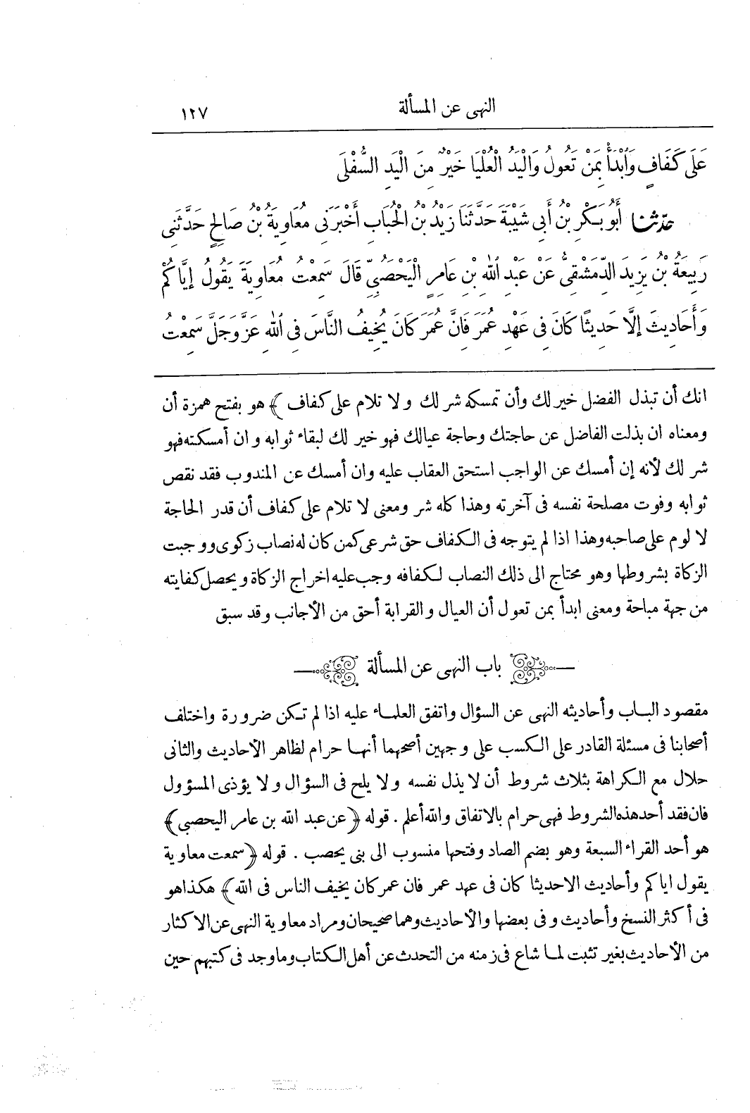 مَقْصُودُ الْبَابِ وَأَحَادِيثِهِ النَّهْيُ عَنِ السُّؤَالِ وَاتَّفَقَ الْعُلَمَاءُ عَلَيْهِ إِذَا لَمْ تَكُنْ ضَرُورَةٌ وَاخْتَلَفَ أَصْحَابُنَا فِي مَسْأَلَةِ الْقَادِرِ عَلَى الْكَسْبِ عَلَى وَجْهَيْنِ أَصَحُّهُمَا أَنَّهَا حَرَامٌ لِظَاهِرِ الْأَحَادِيثِ وَالثَّانِي حَلَالٌ مَعَ الْكَرَاهَةِ بِثَلَاثِ شُرُوطٍ أَنْ لَا يُذِلَّ نَفْسَهُ وَلَا يُلِحَّ فِي السُّؤَالِ وَلَا يُؤْذِيَ المسؤول فَإِنْ فُقِدَ أَحَدُ هَذِهِ الشُّرُوطِ فَهِيَ حَرَامٌ بِالِاتِّفَاقِ وَاللَّهُ أَعْلَمُ