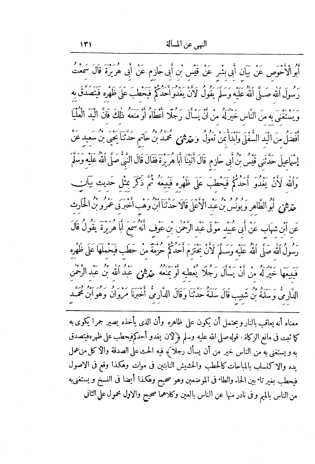 [1042] قَوْلُهُ صَلَّى اللَّهُ عَلَيْهِ وَسَلَّمَ (لَأَنْ يَغْدُوَ أَحَدُكُمْ فَيَحْطِبَ عَلَى ظَهْرِهِ فَيَتَصَدَّقَ بِهِ وَيَسْتَغْنِيَ بِهِ مِنَ النَّاسِ خَيْرٌ مِنْ أَنْ يَسْأَلَ رَجُلًا) فِيهِ الْحَثُّ عَلَى الصَّدَقَةِ وَالْأَكْلِ مِنْ عَمَلِ يَدِهِ وَالِاكْتِسَابِ بِالْمُبَاحَاتِ كَالْحَطَبِ وَالْحَشِيشِ النَّابِتَيْنِ فِي مَوَاتٍ وَهَكَذَا وَقَعَ فِي الْأُصُولِ فَيَحْطِبَ بِغَيْرِ تَاءٍ بَيْنَ الْحَاءِ وَالطَّاءِ فِي الْمَوْضِعَيْنِ وَهُوَ صَحِيحٌ وَهَكَذَا أَيْضًا فِي النُّسَخِ وَيَسْتَغْنِيَ بِهِ مِنَ النَّاسِ بِالْمِيمِ وَفِي نَادِرٍ مِنْهَا عَنِ النَّاسِ بِالْعَيْنِ وَكِلَاهُمَا صَحِيحٌ وَالْأَوَّلُ مَحْمُولٌ على الثاني