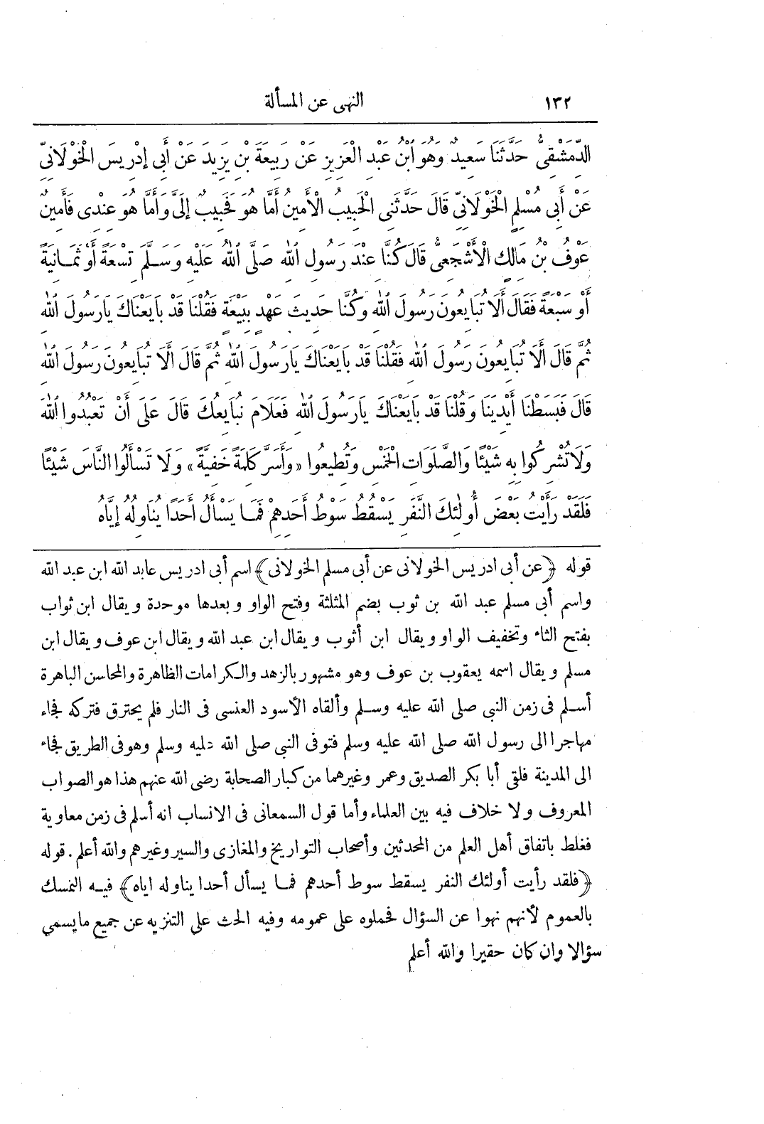 [1043] قَوْلُهُ (عَنْ أَبِي إِدْرِيسَ الْخَوْلَانِيِّ عَنْ أَبِي مُسْلِمٍ الْخَوْلَانِيِّ) اسْمُ أَبِي إِدْرِيسَ عَابدُ اللَّهِ بْنُ عَبْدِ اللَّهِ وَاسْمُ أَبِي مُسْلِمٍ عَبْدُ اللَّهِ بْنُ ثُوَبٍ بِضَمِّ الْمُثَلَّثَةِ وَفَتْحِ الْوَاوِ وبعدها موحدة ويقال بن ثواب بفتح الثاء وتخفيف الواو ويقال بن أثوب ويقال بن عبد الله ويقال بن عوف ويقال بن مُسْلِمٍ وَيُقَالُ اسْمُهُ يَعْقُوبُ بْنُ عَوْفٍ وَهُوَ مَشْهُورٌ بِالزُّهْدِ وَالْكَرَامَاتِ الظَّاهِرَةِ وَالْمَحَاسِنِ الْبَاهِرَةِ أَسْلَمَ فِي زَمَنِ النَّبِيِّ صَلَّى اللَّهُ عَلَيْهِ وَسَلَّمَ وَأَلْقَاهُ الْأَسْوَدُ الْعَنْسِيُّ فِي النَّارِ فَلَمْ يَحْتَرِقْ فَتَرَكَهُ فَجَاءَ مُهَاجِرًا إِلَى رَسُولِ اللَّهِ صَلَّى اللَّهُ عَلَيْهِ وَسَلَّمَ فَتُوُفِّيَ النَّبِيُّ صَلَّى اللَّهُ عَلَيْهِ وَسَلَّمَ وَهُوَ فِي الطَّرِيقِ فَجَاءَ إِلَى الْمَدِينَةِ فَلَقِيَ أَبَا بَكْرٍ الصِّدِّيقَ وَعُمَرَ وَغَيْرَهُمَا مِنْ كِبَارِ الصَّحَابَةِ رَضِيَ اللَّهُ عَنْهُمْ هَذَا هُوَ الصَّوَابُ الْمَعْرُوفُ وَلَا خِلَافَ فِيهِ بَيْنَ الْعُلَمَاءِ وَأَمَّا قَوْلُ السَّمْعَانِيِّ فِي الْأَنْسَابِ إِنَّهُ أَسْلَمَ فِي زَمَنِ مُعَاوِيَةَ فَغَلَطٌ بِاتِّفَاقِ أَهْلِ الْعِلْمِ مِنَ الْمُحَدِّثِينَ وَأَصْحَابِ التَّوَارِيخِ وَالْمَغَازِي وَالسِّيَرِ وغيرهم والله أعلم قوله (فلقد رأيت أُولَئِكَ النَّفَرِ يَسْقُطُ سَوْطُ أَحَدِهِمْ فَمَا يَسْأَلُ أَحَدًا يُنَاوِلُهُ إِيَّاهُ) فِيهِ التَّمَسُّكُ بِالْعُمُومِ لِأَنَّهُمْ نُهُوا عَنِ السُّؤَالِ فَحَمَلُوهُ عَلَى عُمُومِهِ وَفِيهِ الْحَثُّ عَلَى التَّنْزِيهِ عَنْ جَمِيعِ مَا يُسَمَّى سُؤَالًا وَإِنْ كَانَ حَقِيرًا وَاللَّهُ أَعْلَمُ