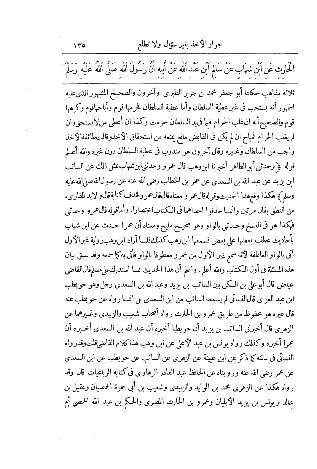 ثَلَاثَةٍ مَذَاهِبَ حَكَاهَا أَبُو جَعْفَرٍ مُحَمَّدُ بْنُ جرير الطبرى وآخرون وَالصَّحِيحُ الْمَشْهُورُ الَّذِي عَلَيْهِ الْجُمْهُورُ أَنَّهُ يُسْتَحَبُّ فِي غَيْرِ عَطِيَّةِ السُّلْطَانِ وَأَمَّا عَطِيَّةُ السُّلْطَانِ فَحَرَّمَهَا قَوْمٌ وَأَبَاحَهَا قَوْمٌ وَكَرِهَهَا قَوْمٌ وَالصَّحِيحُ أَنَّهُ إِنْ غَلَبَ الْحَرَامُ فِيمَا فِي يَدِ السُّلْطَانِ حَرُمَتْ وَكَذَا إِنْ أَعْطَى مَنْ لَا يَسْتَحِقُّ وَإِنْ لَمْ يَغْلِبِ الْحَرَامُ فَمُبَاحٌ إِنْ لم يكن في القابض مانع يمنعه من اسْتِحْقَاقَ الْأَخْذِ وَقَالَتْ طَائِفَةٌ الْأَخْذُ وَاجِبٌ مِنَ السُّلْطَانِ وَغَيْرِهِ وَقَالَ آخَرُونَ هُوَ مَنْدُوبٌ فِي عَطِيَّةِ السُّلْطَانِ دُونَ غَيْرِهِ وَاللَّهُ أَعْلَمُ قَوْلُهُ (وحدثنى أبو الطاهر أخبرنا بن وهب قال عمرو وحدثنى بن شِهَابٍ بِمِثْلِ ذَلِكَ عَنِ السَّائِبِ بْنِ يَزِيدَ عَنْ عَبْدِ اللَّهِ بْنِ السَّعْدِيِّ عَنْ عُمَرَ بْنِ الْخَطَّابِ رَضِيَ اللَّهُ عَنْهُ عَنْ رَسُولِ اللَّهِ صَلَّى اللَّهُ عَلَيْهِ وَسَلَّمَ) هَكَذَا وَقَعَ هَذَا الْحَدِيثُ وَقَوْلُهُ قَالَ عَمْرٌو مَعْنَاهُ قَالَ قَالَ عَمْرٌو فَحَذَفَ كِتَابَةَ قَالَ وَلَا بُدَّ لِلْقَارِئِ مِنَ النُّطْقِ بِقَالَ مَرَّتَيْنِ وَإِنَّمَا حَذَفُوا إِحْدَاهُمَا فِي الْكِتَابِ اخْتِصَارًا وَأَمَّا قَوْلُهُ قَالَ عَمْرٌو وَحَدَّثَنِي فَهَكَذَا هُوَ فِي النُّسَخِ وَحَدَّثَنِي بِالْوَاوِ وَهُوَ صَحِيحٌ مَلِيحٌ وَمَعْنَاهُ أَنَّ عَمْرًا حدث عن بن شِهَابٍ بِأَحَادِيثَ عُطِفَ بَعْضُهَا عَلَى بَعْضٍ فَسَمِعَهَا بن وهب كذلك فلما أراد بن وَهْبٍ رِوَايَةَ غَيْرِ الْأَوَّلِ أَتَى بِالْوَاوِ الْعَاطِفَةِ لِأَنَّهُ سَمِعَ غَيْرَ الْأَوَّلِ مِنْ عَمْرٍو مَعْطُوفًا بِالْوَاوِ فَأَتَى بِهِ كَمَا سَمِعَهُ وَقَدْ سَبَقَ بَيَانُ هَذِهِ الْمَسْأَلَةِ فِي أَوَّلِ الْكِتَابِ وَاللَّهُ أَعْلَمُ وَاعْلَمْ أَنَّ هَذَا الْحَدِيثَ مِمَّا اسْتُدْرِكَ عَلَى مُسْلِمٍ قَالَ الْقَاضِي عِيَاضٌ قَالَ أَبُو عَلِيِّ بْنُ السَّكَنِ بَيْنَ السَّائِبِ بْنِ يَزِيدَ وَعَبْدِ اللَّهِ بْنِ السَّعْدِيِّ رَجُلٌ وَهُوَ حُوَيْطِبُ بْنُ عَبْدِ الْعُزَّى قَالَ النَّسَائِيُّ لَمْ يَسْمَعْهُ السائب من بن السَّعْدِيِّ بَلْ إِنَّمَا رَوَاهُ عَنْ حُوَيْطِبٍ عَنْهُ قَالَ غَيْرُهُ هُوَ مَحْفُوظٌ مِنْ طَرِيقِ عَمْرِو بْنِ الْحَارِثِ رَوَاهُ أَصْحَابُ شُعَيْبٍ وَالزُّبَيْدِيِّ وَغَيْرِهِمَا عَنِ الزُّهْرِيِّ قَالَ أَخْبَرَنِي السَّائِبُ بْنُ يَزِيدَ أَنَّ حُوَيْطِبًا أَخْبَرَهُ أَنَّ عَبْدَ اللَّهِ بْنَ السَّعْدِيِّ أَخْبَرَهُ أَنَّ عَمْرًا أَخْبَرَهُ وَكَذَلِكَ رَوَاهُ يونس بن عبد الأعلى عن بن وَهْبٍ هَذَا كَلَامُ الْقَاضِي قُلْتُ وَقَدْ رَوَاهُ النسائي في سننه كما ذكر عن بن عُيْيَنَةَ عَنِ الزُّهْرِيِّ عَنِ السَّائِبِ عَنْ حُوَيْطِبٍ عن بن السَّعْدِيِّ عَنْ عُمَرَ رَضِيَ اللَّهُ عَنْهُ وَرُوِّينَاهُ عَنِ الْحَافِظِ عَبْدِ الْقَادِرِ الرُّهَاوِيِّ فِي كِتَابِهِ الرَّبَاعِيَاتِ قَالَ وَقَدْ رَوَاهُ هَكَذَا عَنِ الزُّهْرِيِّ مُحَمَّدُ بْنُ الْوَلِيدِ وَالزُّبَيْدِيُّ وَشُعَيْبُ بْنُ أَبِي حَمْزَةَ الْحِمْصِيَّانِ وَعُقَيْلُ بْنُ خَالِدٍ وَيُونُسُ بْنُ يَزِيدَ الْأَيْلِيَّانِ وَعَمْرُو بْنُ الْحَارِثِ الْمِصْرِيُّ وَالْحَكَمُ بْنُ عَبْدِ اللَّهِ الْحِمْصِيُّ ثُمَّ