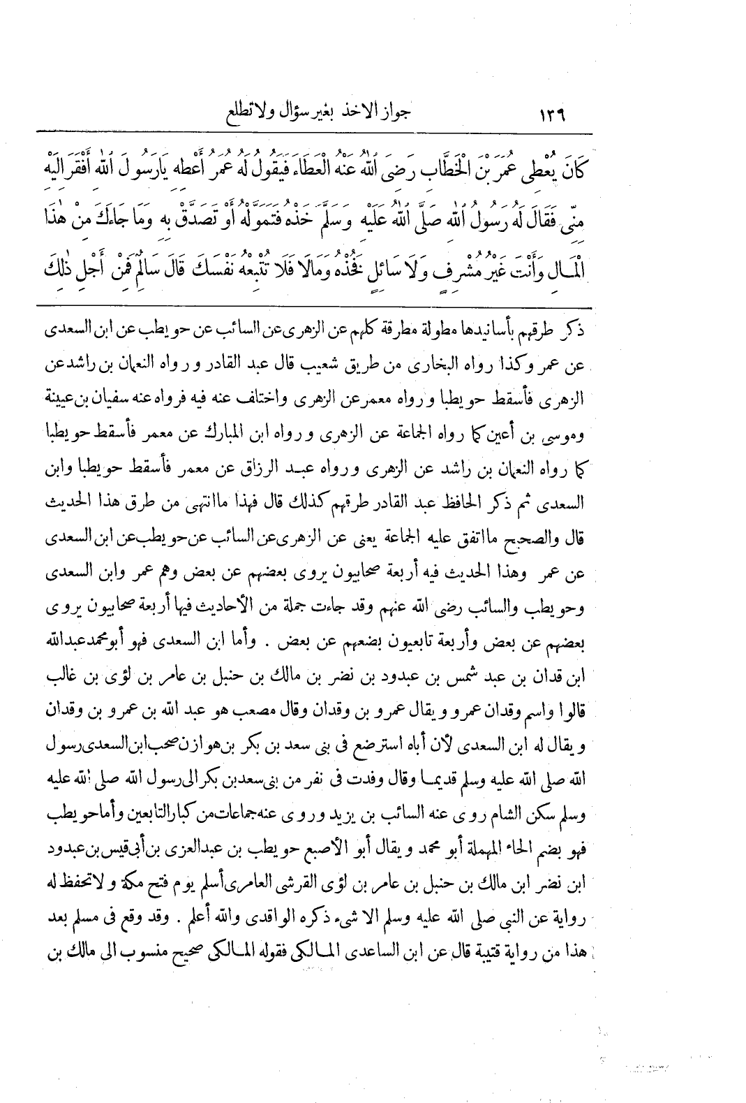 ذَكَرَ طُرُقَهُمْ بِأَسَانِيدِهَا مُطَوَّلَةً مُطْرَقَةً كُلُّهُمْ عَنِ الزهري عن السائب عن حويطب عن بن السَّعْدِيِّ عَنْ عُمَرَ وَكَذَا رَوَاهُ الْبُخَارِيُّ مِنْ طَرِيقِ شُعَيْبٍ قَالَ عَبْدُ الْقَادِرِ وَرَوَاهُ النُّعْمَانُ بْنُ رَاشِدٍ عَنِ الزُّهْرِيِّ فَأَسْقَطَ حُوَيْطِبًا وَرَوَاهُ مَعْمَرٌ عَنِ الزُّهْرِيِّ وَاخْتُلِفَ عَنْهُ فِيهِ فَرَوَاهُ عَنْهُ سُفْيَانُ بْنُ عُيَيْنَةَ وَمُوسَى بْنُ أَعْيَنَ كما رواه الجماعة عن الزهري ورواه بن الْمُبَارَكِ عَنْ مَعْمَرٍ فَأَسْقَطَ حُوَيْطِبًا كَمَا رَوَاهُ النُّعْمَانُ بْنُ رَاشِدٍ عَنِ الزُّهْرِيِّ وَرَوَاهُ عَبْدُ الرزاق عن معمر فأسقط حويطبا وبن السَّعْدِيِّ ثُمَّ ذَكَرَ الْحَافِظُ عَبْدُ الْقَادِرِ طُرُقَهُمْ كَذَلِكَ قَالَ فَهَذَا مَا انْتَهَى مِنْ طُرُقِ هَذَا الْحَدِيثِ قَالَ وَالصَّحِيحُ مَا اتَّفَقَ عَلَيْهِ الْجَمَاعَةُ يَعْنِي عَنِ الزُّهْرِيِّ عَنِ السَّائِبِ عَنْ حويطب عن بن السَّعْدِيِّ عَنْ عُمَرَ وَهَذَا الْحَدِيثُ فِيهِ أَرْبَعَةٌ صَحَابِيُّونَ يَرْوِي بَعْضُهُمْ عَنْ بَعْضٍ وَهُمْ عُمَرُ وبن السَّعْدِيِّ وَحُوَيْطِبٌ وَالسَّائِبُ رَضِيَ اللَّهُ عَنْهُمْ وَقَدْ جَاءَتْ جُمْلَةٌ مِنَ الْأَحَادِيثِ فِيهَا أَرْبَعَةٌ صَحَابِيُّونَ يَرْوِي بَعْضُهُمْ عَنْ بَعْضٍ وَأَرْبَعَةٌ تَابِعِيُّونَ بَعْضُهُمْ عَنْ بعض وأما بن السَّعْدِيِّ فَهُوَ أَبُو مُحَمَّدٍ عَبْدُ اللَّهِ بْنُ وقدان بن عبد شمس بن عبدود بْنِ نَضْرِ بْنِ مَالِكِ بْنِ حَنْبَلِ بْنِ عَامِرِ بْنِ لُؤَيِّ بْنِ غَالِبٍ قَالُوا وَاسْمُ وقدان عمرو ويقال عمرو بن وقدان وقال مُصْعَبٌ هُوَ عَبْدُ اللَّهِ بْنُ عَمْرِو بْنِ وقدان ويقال له بن السَّعْدِيِّ لِأَنَّ أَبَاهُ اسْتُرْضِعَ فِي بَنِي سَعْدِ بن بكر بن هوازن صحب بن السَّعْدِيِّ رَسُولَ اللَّهِ صَلَّى اللَّهُ عَلَيْهِ وَسَلَّمَ قَدِيمًا وَقَالَ وَفَدْتُ فِي نَفَرٍ مِنْ بَنِي سَعْدِ بْنِ بَكْرٍ إِلَى رَسُولِ اللَّهِ صَلَّى اللَّهُ عَلَيْهِ وَسَلَّمَ سَكَنَ الشَّامَ رَوَى عَنْهُ السَّائِبُ بْنُ يَزِيدَ وَرَوَى عَنْهُ جَمَاعَاتٌ مِنْ كِبَارِ التَّابِعِينَ وَأَمَّا حُوَيْطِبٌ فَهُوَ بِضَمِّ الْحَاءِ الْمُهْمَلَةِ أَبُو مُحَمَّدٍ وَيُقَالُ أَبُو الْأُصْبُعِ حُوَيْطِبُ بْنُ عَبْدِ الْعُزَّى بْنِ أَبِي قَيْسِ بْنِ عبدود بْنِ نَضْرِ بْنِ مَالِكِ بْنِ حَنْبَلِ بْنِ عَامِرِ بْنِ لُؤَيِّ الْقُرَشِيُّ الْعَامِرِيُّ أَسْلَمَ يَوْمَ فَتْحِ مَكَّةَ وَلَا تُحْفَظُ لَهُ رِوَايَةٌ عَنِ النَّبِيِّ صَلَّى اللَّهُ عَلَيْهِ وَسَلَّمَ إِلَّا شَيْءٌ ذَكَرَهُ الْوَاقِدِيُّ وَاللَّهُ أَعْلَمُ وَقَدْ وَقَعَ فِي مُسْلِمٍ بَعْدَ هَذَا مِنْ رِوَايَةِ قُتَيْبَةَ قَالَ عن بن السَّاعِدِيِّ الْمَالِكِيِّ فَقَوْلُهُ الْمَالِكِيُّ صَحِيحٌ مَنْسُوبٌ إِلَى مالك بن