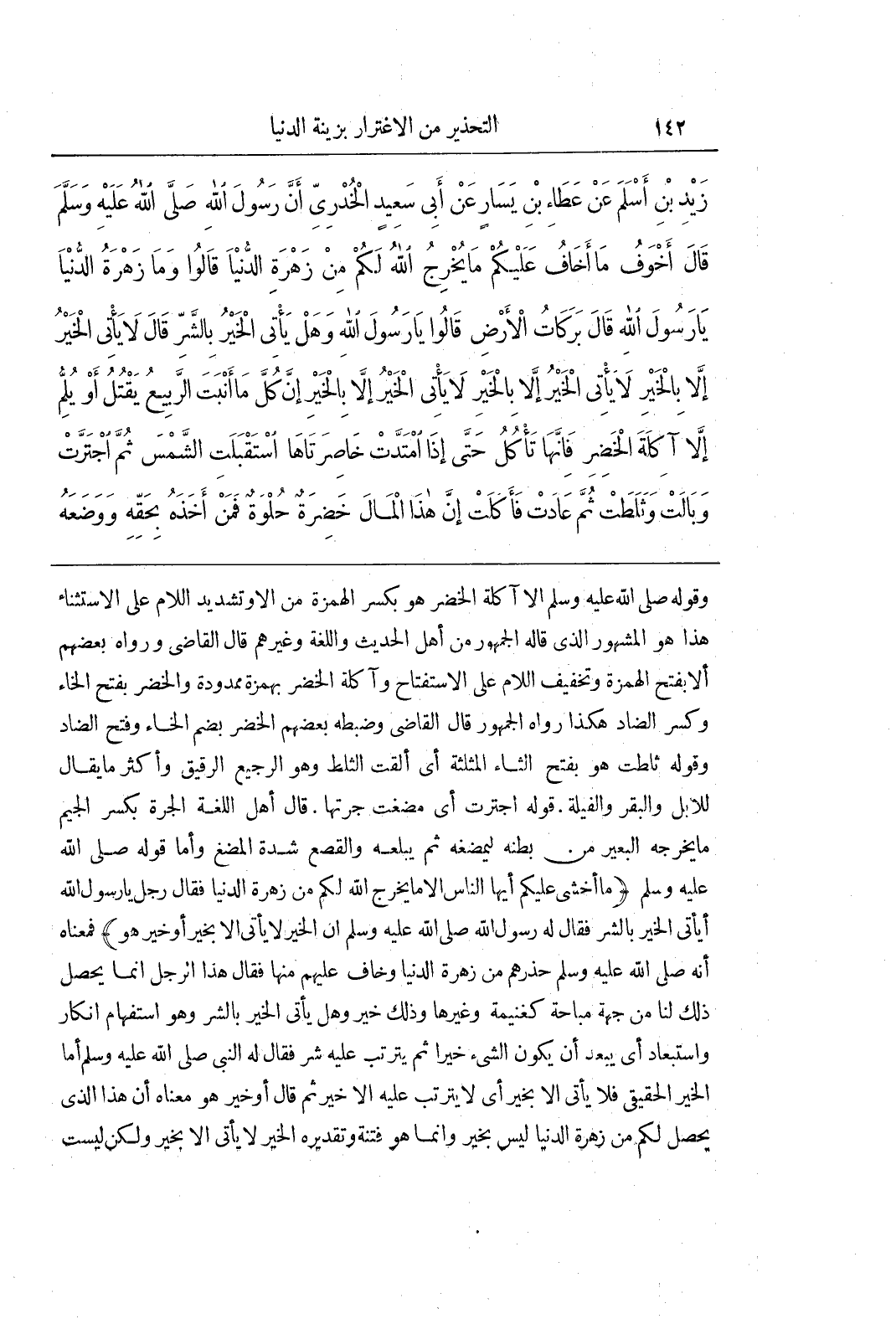 وَقَوْلُهُ صَلَّى اللَّهُ عَلَيْهِ وَسَلَّمَ إِلَّا آكِلَةَ الْخَضِرِ هُوَ بِكَسْرِ الْهَمْزَةِ مِنْ إِلَّا وَتَشْدِيدِ اللَّامِ عَلَى الِاسْتِثْنَاءِ هَذَا هُوَ الْمَشْهُورُ الَّذِي قَالَهُ الْجُمْهُورُ مِنْ أَهْلِ الْحَدِيثِ وَاللُّغَةِ وَغَيْرِهِمْ قَالَ الْقَاضِي وَرَوَاهُ بَعْضُهُمْ أَلَا بِفَتْحِ الْهَمْزَةِ وتخفيف اللام على الاستفتاح وآكلة الْخَضِرِ بِهَمْزَةِ مَمْدُودَةٍ وَالْخَضِرِ بِفَتْحِ الْخَاءِ وَكَسْرِ الضَّادِ هَكَذَا رَوَاهُ الْجُمْهُورُ قَالَ الْقَاضِي وَضَبْطَهُ بَعْضُهُمْ الْخُضَرِ بِضَمِّ الْخَاءِ وَفَتْحِ الضَّادِ وَقَوْلُهُ ثَلَطَتْ هُوَ بِفَتْحِ الثَّاءِ الْمُثَلَّثَةِ أَيْ أَلْقَتِ الثَّلْطَ وَهُوَ الرَّجِيعُ الرَّقِيقُ وَأَكْثَرُ مَا يُقَالُ لِلْإِبِلِ وَالْبَقَرِ وَالْفِيَلَةِ قَوْلُهُ اجْتَرَّتْ أَيْ مَضَغَتْ جِرَّتَهَا قَالَ أَهْلُ اللُّغَةِ الْجِرَّةُ بِكَسْرِ الْجِيمِ مَا يُخْرِجُهُ الْبَعِيرُ مِنْ بَطْنِهِ لِيَمْضُغَهُ ثُمَّ يَبْلَعَهُ وَالْقَصْعُ شِدَّةُ الْمَضْغِ وَأَمَّا قَوْلُهُ صَلَّى اللَّهُ عَلَيْهِ وَسَلَّمَ (مَا أَخْشَى عَلَيْكُمْ أَيُّهَا النَّاسُ إِلَّا مَا يُخْرِجُ اللَّهُ لَكُمْ مِنْ زَهْرَةِ الدُّنْيَا فَقَالَ رَجُلٌ يَا رَسُولَ اللَّهِ أَيَأْتِي الْخَيْرُ بِالشَّرِّ فَقَالَ لَهُ رَسُولُ اللَّهِ صَلَّى اللَّهُ عَلَيْهِ وَسَلَّمَ إِنَّ الْخَيْرَ لَا يَأْتِي إِلَّا بِخَيْرٍ أَوَ خَيْرٌ هُوَ) فَمَعْنَاهُ أَنَّهُ صَلَّى اللَّهُ عَلَيْهِ وَسَلَّمَ حَذَّرَهُمْ مِنْ زَهْرَةِ الدُّنْيَا وَخَافَ عَلَيْهِمْ مِنْهَا فَقَالَ هَذَا الرَّجُلُ إِنَّمَا يَحْصُلُ ذَلِكَ لَنَا مِنْ جِهَةٍ مُبَاحَةٍ كَغَنِيمَةٍ وَغَيْرِهَا وَذَلِكَ خَيْرٌ وَهَلْ يَأْتِي الْخَيْرُ بِالشَّرِّ وَهُوَ اسْتِفْهَامُ إِنْكَارٍ وَاسْتِبْعَادٍ أَيْ يَبْعُدُ أَنْ يَكُونَ الشَّيْءُ خَيْرًا ثُمَّ يَتَرَتَّبُ عَلَيْهِ شَرٌّ فَقَالَ لَهُ النَّبِيُّ صَلَّى اللَّهُ عَلَيْهِ وَسَلَّمَ أَمَّا الْخَيْرُ الْحَقِيقِيُّ فَلَا يَأْتِي إِلَّا بِخَيْرٍ أَيْ لَا يَتَرَتَّبُ عَلَيْهِ إِلَّا خَيْرٌ ثُمَّ قَالَ أَوَ خَيْرٌ هُوَ مَعْنَاهُ أَنَّ هَذَا الَّذِي يَحْصُلُ لَكُمْ مِنْ زَهْرَةِ الدُّنْيَا لَيْسَ بِخَيْرٍ وَإِنَّمَا هُوَ فِتْنَةٌ وَتَقْدِيرُهُ الْخَيْرُ لَا يَأْتِي إِلَّا بِخَيْرٍ وَلَكِنْ لَيْسَتْ