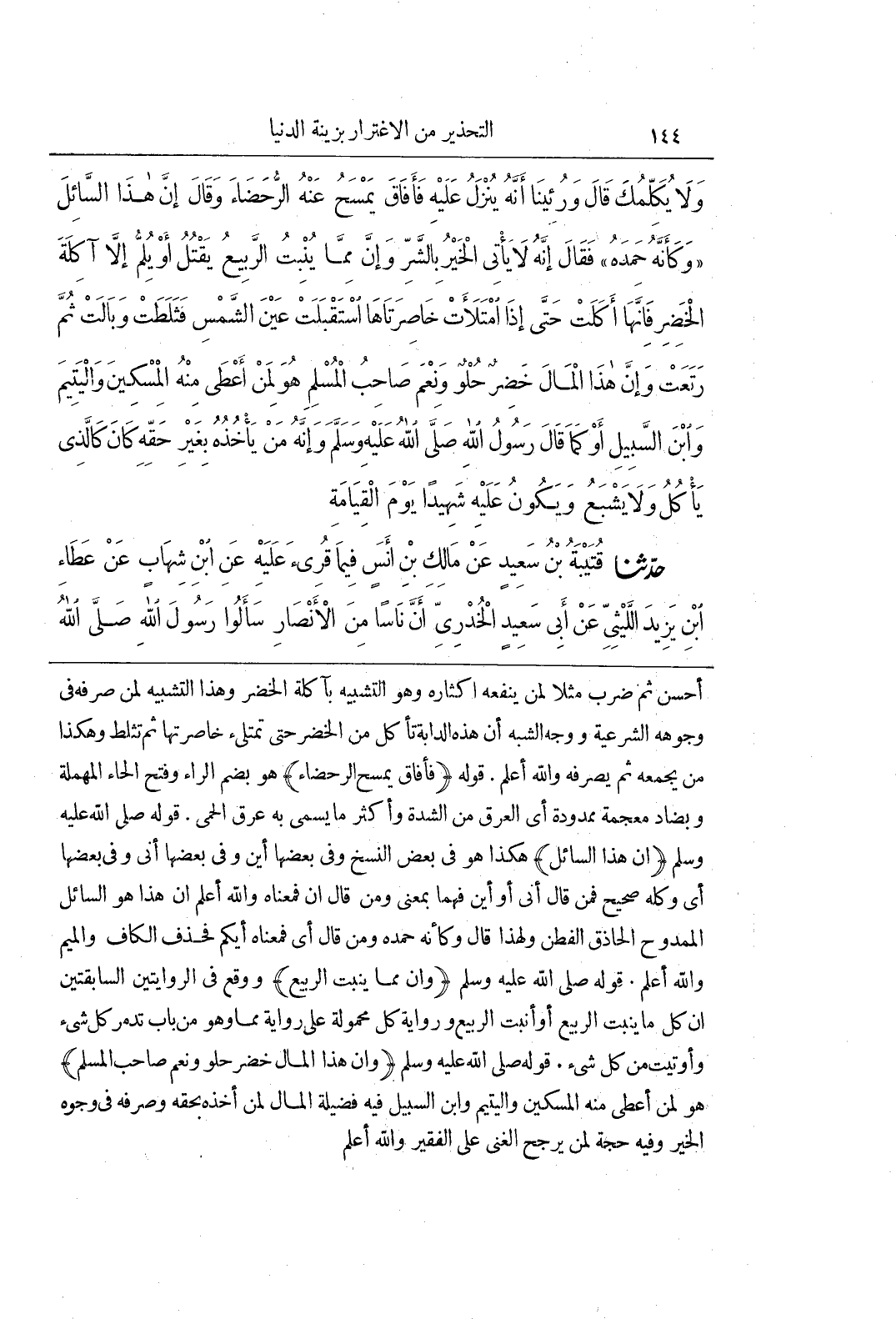 أَحْسَنُ ثُمَّ ضَرَبَ مَثَلًا لِمَنْ يَنْفَعُهُ إِكْثَارُهُ وَهُوَ التَّشْبِيهُ بِآكِلَةِ الْخَضِرِ وَهَذَا التَّشْبِيهُ لِمَنْ صَرَفَهُ فِي وُجُوهِهِ الشَّرْعِيَّةِ وَوَجْهُ الشَّبَهِ أَنَّ هذه الدابة تأكل من الخضر حتى تمتليء خَاصِرَتُهَا ثُمَّ تَثْلِطُ وَهَكَذَا مِنْ يَجْمَعُهُ ثُمَّ يَصْرِفُهُ وَاللَّهُ أَعْلَمُ قَوْلُهُ (فَأَفَاقَ يَمْسَحُ الرُّحَضَاءَ) هُوَ بِضَمِّ الرَّاءِ وَفَتْحِ الْحَاءِ الْمُهْمَلَةِ وَبِضَادٍ مُعْجَمَةٍ مَمْدُودَةٍ أَيِ الْعَرَقَ مِنَ الشِّدَّةِ وَأَكْثَرُ مَا يُسَمَّى بِهِ عَرَقُ الْحُمَّى قَوْلُهُ صَلَّى اللَّهُ عَلَيْهِ وَسَلَّمَ (إِنَّ هَذَا السَّائِلَ) هَكَذَا هُوَ فِي بَعْضِ النُّسَخِ وَفِي بَعْضِهَا أَيْنَ وَفِي بَعْضِهَا أَنَّى وَفِي بَعْضِهَا أَيْ وَكُلُّهُ صَحِيحٌ فَمَنْ قَالَ أَنَّى أَوْ أَيْنَ فَهُمَا بِمَعْنًى وَمَنْ قَالَ إِنَّ فَمَعْنَاهُ وَاللَّهُ أَعْلَمُ إِنَّ هَذَا هُوَ السَّائِلُ الْمَمْدُوحُ الْحَاذِقُ الْفَطِنُ وَلِهَذَا قَالَ وَكَأَنَّهُ حَمِدَهُ وَمَنْ قَالَ أَيٌّ فَمَعْنَاهُ أَيُّكُمْ فَحَذَفَ الْكَافَ وَالْمِيمَ وَاللَّهُ أَعْلَمُ قَوْلُهُ صَلَّى اللَّهُ عَلَيْهِ وَسَلَّمَ (وَإِنْ مِمَّا يَنْبُتُ الرَّبِيعُ) وَوَقَعَ فِي الرِّوَايَتَيْنِ السَّابِقَتَيْنِ إِنَّ كُلَّ مَا يُنْبِتُ الرَّبِيعُ أَوْ أَنْبَتَ الرَّبِيعُ وَرِوَايَةُ كُلَّ مَحْمُولَةٌ عَلَى رِوَايَةِ مِمَّا وَهُوَ مِنْ بَابِ تُدَمِّرُ كُلَّ شَيْءٍ وَأُوتِيَتْ مِنْ كُلَّ شَيْءٍ قَوْلُهُ صَلَّى اللَّهُ عَلَيْهِ وَسَلَّمَ (وَإِنَّ هَذَا الْمَالَ خَضِرٌ حُلْوٌ وَنِعْمَ صَاحِبُ الْمُسْلِمِ) هُوَ لِمَنْ أَعْطَى مِنْهُ الْمِسْكِينَ وَالْيَتِيمَ وبن السَّبِيلِ فِيهِ فَضِيلَةُ الْمَالِ لِمَنْ أَخَذَهُ بِحَقِّهِ وَصَرَفَهُ فِي وُجُوهِ الْخَيْرِ وَفِيهِ حُجَّةٌ لِمَنْ يُرَجِّحُ الْغَنِيَّ عَلَى الْفَقِيرِ وَاللَّهُ أَعْلَمُ