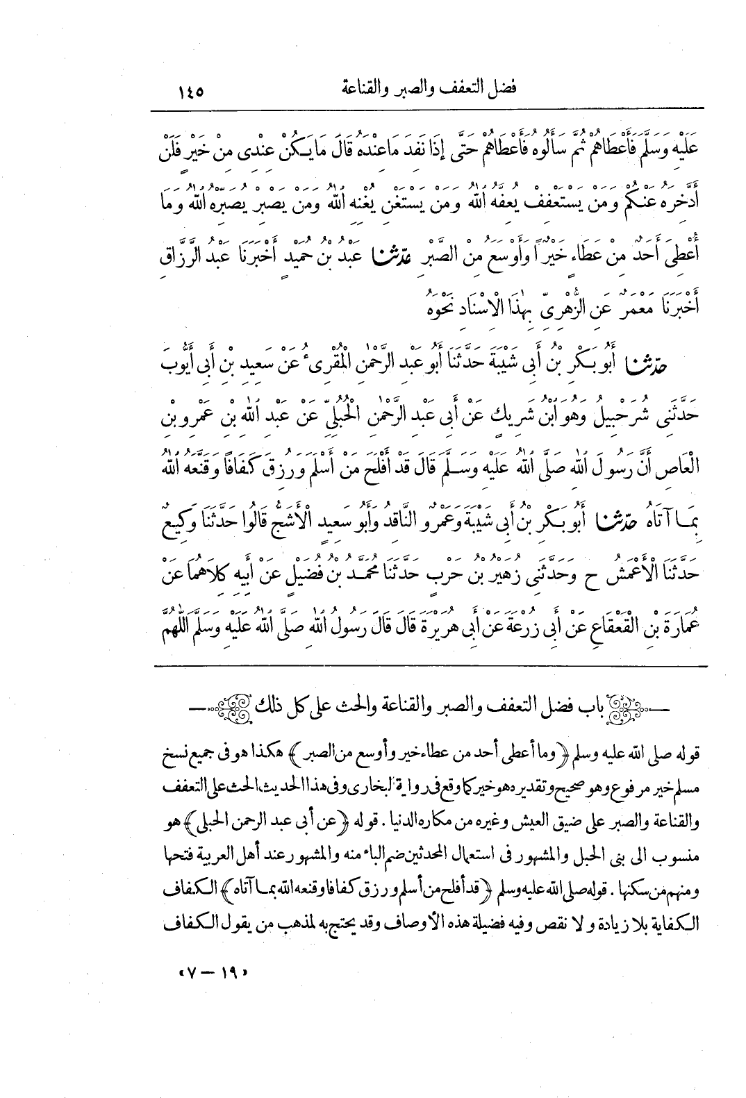 [1054] قَوْلُهُ (عَنْ أَبِي عَبْدِ الرَّحْمَنِ الْحُبُلِيِّ) هُوَ مَنْسُوبٌ إِلَى بَنِي الْحُبُلِ وَالْمَشْهُورُ فِي اسْتِعْمَالِ الْمُحَدِّثِينَ ضَمُّ الْبَاءِ مِنْهُ وَالْمَشْهُورُ عِنْدَ أَهْلِ الْعَرَبِيَّةِ فَتْحُهَا وَمِنْهُمْ مَنْ سَكَّنَهَا قَوْلُهُ صَلَّى اللَّهُ عَلَيْهِ وَسَلَّمَ (قَدْ أَفْلَحَ مَنْ أَسْلَمَ وَرُزِقَ كَفَافًا وَقَنَّعَهُ اللَّهُ بِمَا آتَاهُ) الْكَفَافُ الْكِفَايَةُ بِلَا زِيَادَةٍ وَلَا نَقْصٍ وَفِيهِ فَضِيلَةُ هَذِهِ الْأَوْصَافِ وَقَدْ يُحْتَجُّ بِهِ لِمَذْهَبِ مَنْ يقول الكفاف