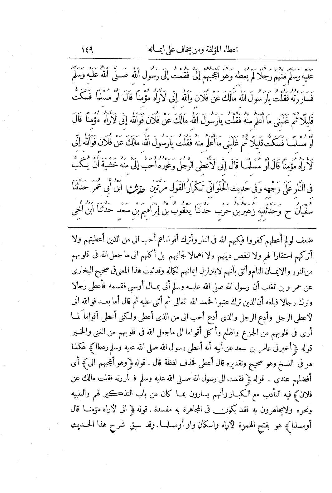 ضَعْفٌ لَوْ لَمْ أُعْطِهِمْ كَفَرُوا فَيَكُبَّهُمُ اللَّهُ فِي النَّارِ وَأَتْرُكُ أَقْوَامًا هُمْ أَحَبُّ إِلَيَّ مِنَ الَّذِينَ أَعْطَيْتُهُمْ وَلَا أَتْرُكُهُمُ احْتِقَارًا لَهُمْ وَلَا لِنَقْصِ دِينِهِمْ وَلَا إِهْمَالًا لِجَانِبِهِمْ بَلْ أَكِلُهُمْ إِلَى مَا جَعَلَ اللَّهُ فِي قُلُوبِهِمْ مِنَ النُّورِ وَالْإِيمَانِ التَّامِّ وَأَثِقُ بِأَنَّهُمْ لَا يَتَزَلْزَلُ إِيمَانُهُمْ لِكَمَالِهِ وَقَدْ ثَبَتَ هَذَا الْمَعْنَى فِي صَحِيحِ الْبُخَارِيِّ عَنْ عَمْرِو بْنِ تَغْلِبَ إن رسول الله صلى الله عليه وسلم أُتِيَ بِمَالٍ أَوْ سَبْيٍ فَقَسَمَهُ فَأَعْطَى رِجَالًا وَتَرَكَ رِجَالًا فَبَلَغَهُ أَنَّ الَّذِينَ تَرَكَ عَتَبُوا فَحَمِدَ اللَّهَ تَعَالَى ثُمَّ أَثْنَى عَلَيْهِ ثُمَّ قَالَ أَمَّا بَعْدُ فَوَاللَّهِ إِنِّي لَأُعْطِي الرَّجُلَ وَأَدَعُ الرَّجُلَ وَالَّذِي أَدَعُ أَحَبُّ إِلَيَّ مِنَ الَّذِي أُعْطِي وَلَكِنِّي أُعْطِي أَقْوَامًا لِمَا أَرَى فِي قُلُوبِهِمْ مِنَ الْجَزَعِ وَالْهَلَعِ وَأَكِلُ أَقْوَامًا إِلَى مَا جَعَلَ اللَّهُ فِي قُلُوبِهِمْ مِنَ الْغِنَى وَالْخَيْرِ قَوْلُهُ (أَخْبَرَنِي عَامِرُ بْنُ سَعْدٍ عَنْ أَبِيهِ أَنَّهُ أَعْطَى رَسُولُ اللَّهِ صَلَّى اللَّهُ عَلَيْهِ وَسَلَّمَ رَهْطًا) هَكَذَا هُوَ فِي النُّسَخِ وَهُوَ صَحِيحٌ وَتَقْدِيرُهُ قَالَ أَعْطَى فَحَذَفَ لَفْظَةَ قَالَ قَوْلُهُ (وَهُوَ أَعْجَبُهُمْ إِلَيَّ) أَيْ أَفْضَلُهُمْ عِنْدِي قَوْلُهُ (فَقُمْتُ إِلَى رَسُولِ اللَّهِ صَلَّى اللَّهُ عَلَيْهِ وَسَلَّمَ فساررته فقلت مالك عَنْ فُلَانٍ) فِيهِ التَّأَدُّبُ مَعَ الْكِبَارِ وَأَنَّهُمْ يُسَارُّونَ بِمَا كَانَ مِنْ بَابِ التَّذْكِيرِ لَهُمْ وَالتَّنْبِيهِ وَنَحْوِهِ وَلَا يُجَاهَرُونَ بِهِ فَقَدْ يَكُونُ فِي الْمُجَاهَرَةِ بِهِ مَفْسَدَةٌ قَوْلُهُ (إِنِّي لَأَرَاهُ مُؤْمِنًا قَالَ أَوْ مُسْلِمًا) هُوَ بِفَتْحِ الْهَمْزَةِ لَأَرَاهُ وَإِسْكَانِ وَاوِ أَوْ مُسْلِمًا وَقَدْ سَبَقَ شَرْحُ هَذَا الْحَدِيثِ