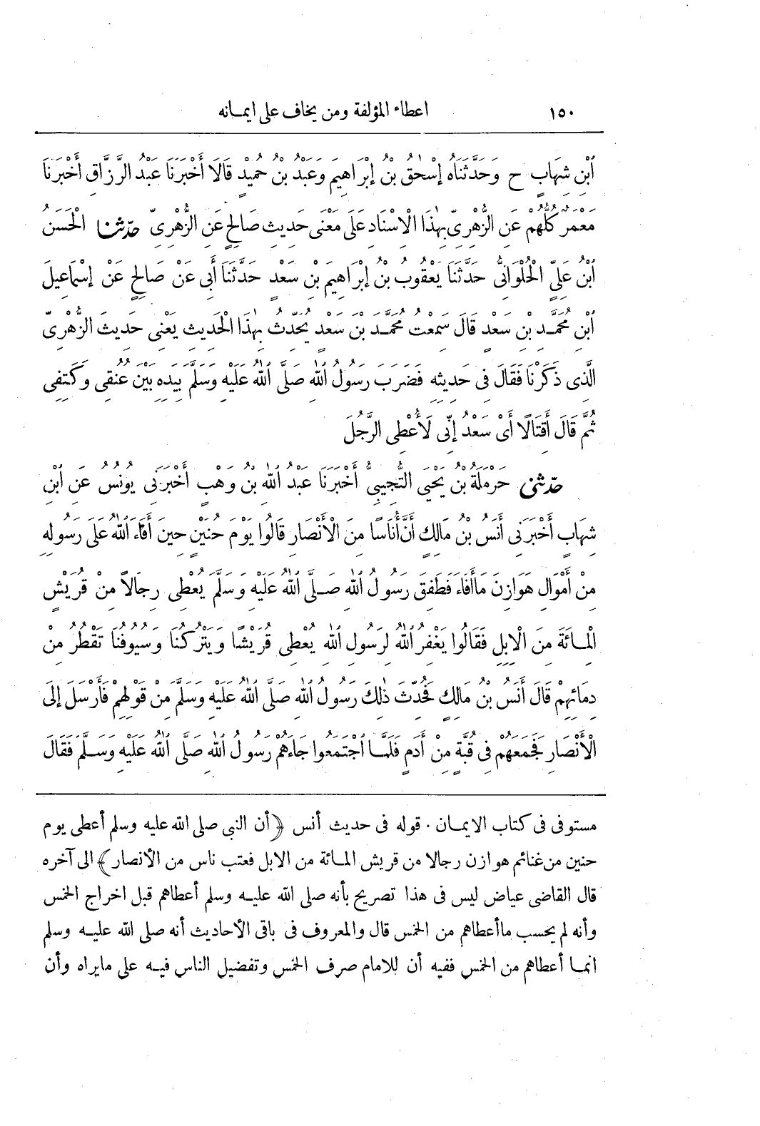 مستوفى في كتاب الايمان قَوْلُهُ فِي حَدِيثِ أَنَسٍ (أَنَّ النَّبِيَّ صَلَّى اللَّهُ عَلَيْهِ وَسَلَّمَ أَعْطَى يَوْمَ حُنَيْنٍ مِنْ غَنَائِمِ هَوَازِنَ رِجَالًا مِنْ قُرَيْشٍ الْمِائَةَ مِنَ الْإِبِلِ فَعَتَبَ نَاسٌ مِنَ الْأَنْصَارِ) إِلَى آخِرِهِ قَالَ الْقَاضِي عِيَاضٌ لَيْسَ فِي هَذَا تَصْرِيحٌ بِأَنَّهُ صَلَّى اللَّهُ عَلَيْهِ وَسَلَّمَ أَعْطَاهُمْ قَبْلَ إِخْرَاجِ الْخُمُسِ وَأَنَّهُ لَمْ يَحْسِبْ مَا أَعْطَاهُمْ مِنَ الْخُمُسِ قَالَ وَالْمَعْرُوفُ فِي بَاقِي الْأَحَادِيثِ أَنَّهُ صَلَّى اللَّهُ عَلَيْهِ وَسَلَّمَ إِنَّمَا أَعْطَاهُمْ مِنَ الْخُمُسِ فَفِيهِ أَنَّ لِلْإِمَامِ صَرْفَ الْخُمُسِ وَتَفْضِيلَ النَّاسِ فِيهِ عَلَى مَا يَرَاهُ وَأَنْ