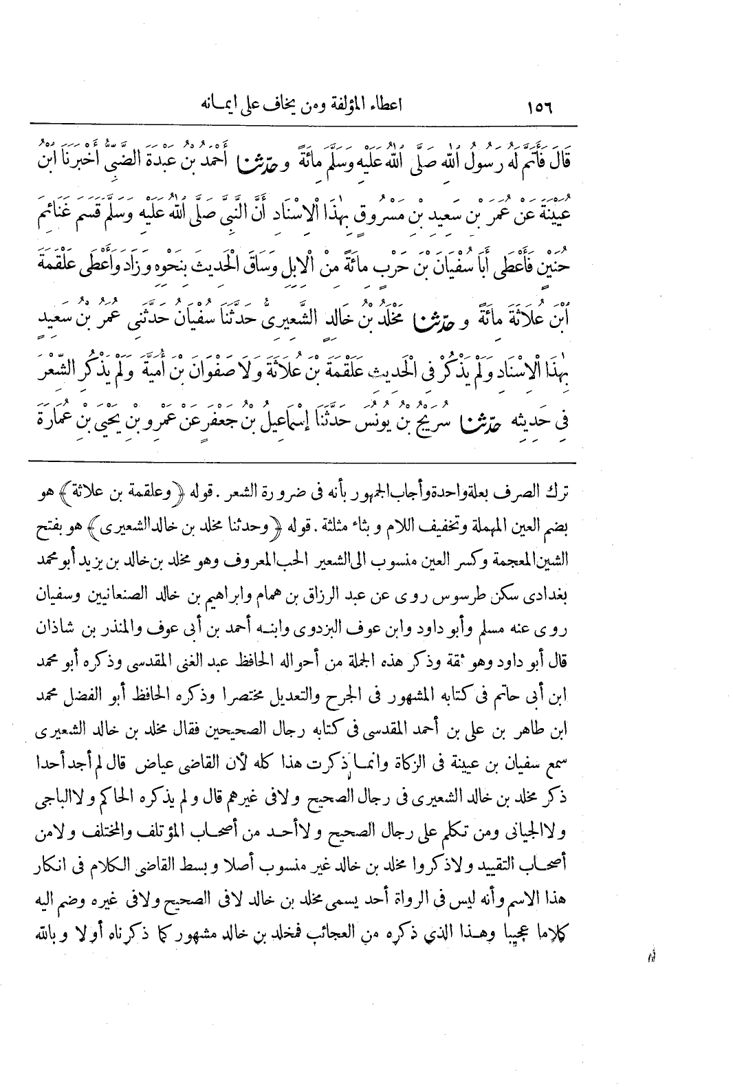 تَرْكَ الصَّرْفِ بِعِلَّةٍ وَاحِدَةٍ وَأَجَابَ الْجُمْهُورُ بِأَنَّهُ فِي ضَرُورَةِ الشِّعْرِ قَوْلُهُ (وَعَلْقَمَةَ بْنَ عُلَاثَةَ) هُوَ بِضَمِّ الْعَيْنِ الْمُهْمَلَةِ وَتَخْفِيفِ اللَّامِ وَبِثَاءٍ مُثَلَّثَةٍ قَوْلُهُ (وَحَدَّثَنَا مَخْلَدُ بْنُ خَالِدٍ الشَّعِيرِيُّ) هُوَ بِفَتْحِ الشِّينِ الْمُعْجَمَةِ وَكَسْرِ الْعَيْنِ مَنْسُوبٌ إِلَى الشَّعِيرِ الْحَبِّ الْمَعْرُوفِ وَهُوَ مَخْلَدُ بْنُ خَالِدِ بْنِ يَزِيدَ أَبُو مُحَمَّدٍ بَغْدَادِيٌّ سَكَنَ طَرَسُوسَ رَوَى عَنْ عَبْدِ الرَّزَّاقِ بْنِ هَمَّامٍ وَإِبْرَاهِيمَ بْنِ خَالِدٍ الصَّنْعانِيَّيْنِ وَسُفْيَانَ رَوَى عَنْهُ مسلم وأبو داود وبن عَوْفٍ الْبَزْدَوِيُّ وَابْنُهُ أَحْمَدُ بْنُ أَبِي عَوْفٍ وَالْمُنْذِرُ بْنُ شَاذَانَ قَالَ أَبُو دَاوُدَ وَهُوَ ثِقَةٌ وَذَكَرَ هَذِهِ الْجُمْلَةَ مِنْ أَحْوَالِهِ الْحَافِظُ عَبْدُ الْغَنِيِّ الْمَقْدِسِيُّ وَذَكَرَهُ أَبُو مُحَمَّدِ بْنُ أَبِي حَاتِمٍ فِي كِتَابِهِ الْمَشْهُورِ فِي الْجَرْحِ وَالتَّعْدِيلِ مُخْتَصَرًا وَذَكَرَهُ الْحَافِظُ أَبُو الْفَضْلِ مُحَمَّدُ بْنُ طَاهِرِ بْنِ عَلِيِّ بْنِ أَحْمَدَ الْمَقْدِسِيُّ فِي كِتَابِهِ رِجَالُ الصَّحِيحَيْنِ فَقَالَ مَخْلَدُ بْنُ خَالِدٍ الشَّعِيرِيُّ سَمِعَ سُفْيَانَ بْنَ عُيَيْنَةَ فِي الزَّكَاةِ وَإِنَّمَا ذَكَرْتُ هَذَا كُلَّهُ لِأَنَّ الْقَاضِيَ عِيَاضٌ قَالَ لَمْ أَجِدْ أَحَدًا ذَكَرَ مَخْلَدَ بْنَ خَالِدٍ الشَّعِيرِيَّ فِي رِجَالِ الصَّحِيحِ وَلَا فِي غَيْرِهِمْ قَالَ وَلَمْ يَذْكُرْهُ الْحَاكِمُ وَلَا الْبَاجِيُّ وَلَا الْجَيَّانِيُّ وَمَنْ تَكَلَّمَ عَلَى رِجَالِ الصَّحِيحِ وَلَا أَحَدٌ مِنْ أَصْحَابِ الْمُؤْتَلِفِ وَالْمُخْتَلِفِ وَلَا مِنْ أَصْحَابِ التَّقْيِيدِ وَلَا ذَكَرُوا مَخْلَدَ بْنَ خَالِدٍ غَيْرَ مَنْسُوبٍ أَصْلًا وَبَسَطَ الْقَاضِي الْكَلَامَ فِي إِنْكَارِ هَذَا الِاسْمِ وَأَنَّهُ لَيْسَ فِي الرُّوَاةِ أَحَدٌ يُسَمَّى مَخْلَدَ بْنَ خَالِدٍ لَا فِي الصَّحِيحِ وَلَا فِي غَيْرِهِ وَضَمَّ إِلَيْهِ كَلَامًا عَجِيبًا وَهَذَا الَّذِي ذَكَرَهُ مِنَ الْعَجَائِبِ فَمَخْلَدُ بْنُ خَالِدٍ مَشْهُورٌ كَمَا ذَكَرْنَاهُ أولا وبالله