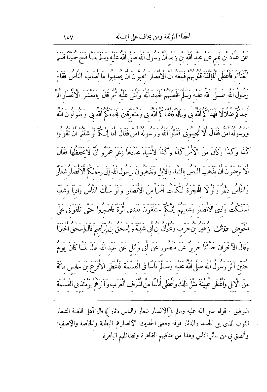 [1061] قَوْلُهُ صَلَّى اللَّهُ عَلَيْهِ وَسَلَّمَ (الْأَنْصَارُ شِعَارٌ وَالنَّاسُ دِثَارٌ) قَالَ أَهْلُ اللُّغَةِ الشِّعَارُ الثوب الذي يلى الجسد والدثار فَوْقُهُ وَمَعْنَى الْحَدِيثِ الْأَنْصَارُ هُمُ الْبِطَانَةُ وَالْخَاصَّةُ وَالْأَصْفِيَاءُ وَأَلْصَقُ بِي مِنْ سَائِرِ النَّاسِ وَهَذَا مِنْ مَنَاقِبِهِمُ الظَّاهِرَةِ وَفَضَائِلِهِمُ الْبَاهِرَةِ