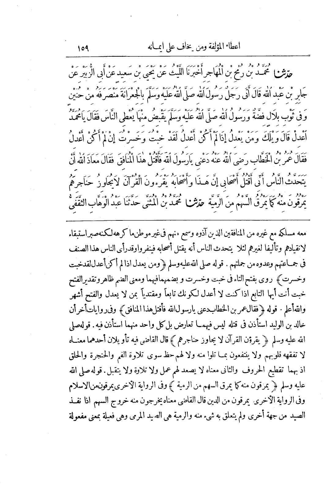 [1063] قَوْلُهُ صَلَّى اللَّهُ عَلَيْهِ وَسَلَّمَ (وَمَنْ يَعْدِلْ إِذَا لَمْ أَكُنْ أَعْدِلُ لَقَدْ خِبْتَ وَخَسِرْتَ) رُوِيَ بِفَتْحِ التَّاءِ فِي خِبْتَ وَخَسِرْتَ وَبِضَمِّهِمَا فِيهِمَا وَمَعْنَى الضَّمِّ ظَاهِرٌ وَتَقْدِيرُ الْفَتْحِ خِبْتَ أَنْتَ أَيُّهَا التَّابِعُ إِذَا كُنْتُ لَا أَعْدِلُ لِكَوْنِكَ تَابِعًا وَمُقْتَدِيًا بِمَنْ لَا يَعْدِلُ وَالْفَتْحُ أَشْهَرُ وَاللَّهُ أَعْلَمُ قَوْلُهُ (فَقَالَ عُمَرُ بْنُ الْخَطَّابِ دَعْنِي يَا رَسُولَ اللَّهِ فَأَقْتُلَ هَذَا الْمُنَافِقَ) وَفِي رِوَايَاتٍ أُخَرَ أَنَّ خَالِدَ بْنَ الْوَلِيدِ اسْتَأْذَنَ فِي قَتْلِهِ لَيْسَ فِيهِمَا تَعَارُضٌ بَلْ كُلُّ وَاحِدٍ مِنْهُمَا اسْتَأْذَنَ فِيهِ قَوْلُهُ صَلَّى اللَّهُ عَلَيْهِ وَسَلَّمَ (يقرؤون الْقُرْآنَ لَا يُجَاوِزُ حَنَاجِرَهُمْ) قَالَ الْقَاضِي فِيهِ تَأْوِيلَانِ أَحَدُهُمَا مَعْنَاهُ لَا تَفْقَهُهُ قُلُوبُهُمْ وَلَا يَنْتَفِعُونَ بِمَا تَلَوْا مِنْهُ وَلَا لَهُمْ حَظٌّ سِوَى تِلَاوَةِ الْفَمِ وَالْحَنْجَرَةِ وَالْحَلْقِ إِذْ بِهِمَا تقطيع الحروف والثاني مَعْنَاهُ لَا يَصْعَدُ لَهُمْ عَمَلٌ وَلَا تِلَاوَةٌ وَلَا يُتَقَبَّلُ قَوْلُهُ صَلَّى اللَّهُ عَلَيْهِ وَسَلَّمَ (يَمْرُقُونَ مِنْهُ كَمَا يَمْرُقُ السَّهْمُ مِنَ الرَّمِيَّةِ) وَفِي الرِّوَايَةِ الْأُخْرَى يَمْرُقُونَ مِنَ الْإِسْلَامِ وَفِي الرِّوَايَةِ الْأُخْرَى يَمْرُقُونَ مِنَ الدِّينِ قَالَ الْقَاضِي مَعْنَاهُ يَخْرُجُونَ مِنْهُ خُرُوجَ السَّهْمِ إِذَا نَفَذَ الصَّيْدَ مِنْ جِهَةِ أُخْرَى وَلَمْ يَتَعَلَّقْ بِهِ شيء منه والرمية هِيَ الصَّيْدُ الْمَرْمِيُّ وَهِيَ فَعِيلَةٌ بِمَعْنَى مَفْعُولَةٍ