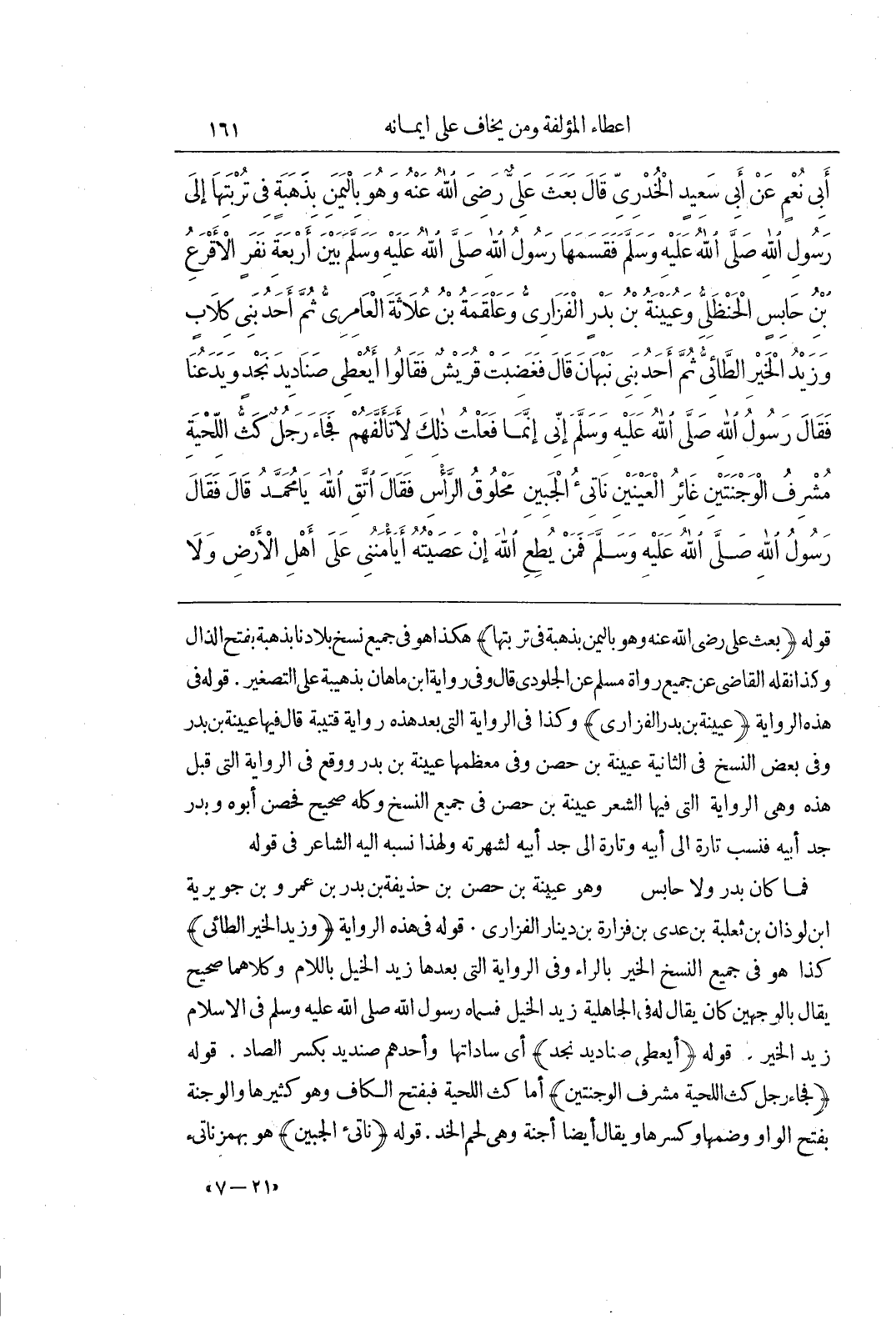 (وَهُوَ عُيَيْنَةُ بْنُ حِصْنِ بْنِ حُذَيْفَةَ بْنِ بَدْرِ بْنِ عَمْرِو بْنِ جُوَيْرِيَةَ بْنِ لَوْذَانَ بْنِ ثَعْلَبَةَ بْنِ عَدِيِّ بْنِ فَزَارَةَ بْنِ دِينَارٍ الْفَزَارِيُّ قَوْلُهُ فِي هَذِهِ الرِّوَايَةِ (وَزَيْدُ الْخَيْرِ الطَّائِيُّ) كَذَا هُوَ فِي جَمِيعِ النُّسَخِ الْخَيْرِ بِالرَّاءِ وَفِي الرِّوَايَةِ الَّتِي بَعْدَهَا زَيْدُ الْخَيْلِ بِاللَّامِ وَكِلَاهُمَا صَحِيحٌ يُقَالُ بِالْوَجْهَيْنِ كَانَ يُقَالُ لَهُ فِي الْجَاهِلِيَّةِ زَيْدُ الْخَيْلِ فَسَمَّاهُ رَسُولُ اللَّهِ صَلَّى اللَّهُ عَلَيْهِ وَسَلَّمَ فِي الْإِسْلَامِ زَيْدُ الْخَيْرِ قَوْلُهُ (أَيُعْطِي صَنَادِيدَ نَجْدٍ) أَيْ سَادَاتِهَا وَأَحَدُهُمْ صِنْدِيدٌ بِكَسْرِ الصَّادِ قَوْلُهُ (فَجَاءَ رَجُلٌ كَثُّ اللِّحْيَةِ مُشْرِفُ الْوَجْنَتَيْنِ) أَمَّا كَثُّ اللِّحْيَةِ فبفتح الكاف وهو كثيرها والوجنة بِفَتْحِ الْوَاوِ وَضَمِّهَا وَكَسْرِهَا وَيُقَالُ أَيْضًا أَجْنَةٌ وهي لحم الخد قوله (ناتىء الجبين) هو بهمز ناتيء)