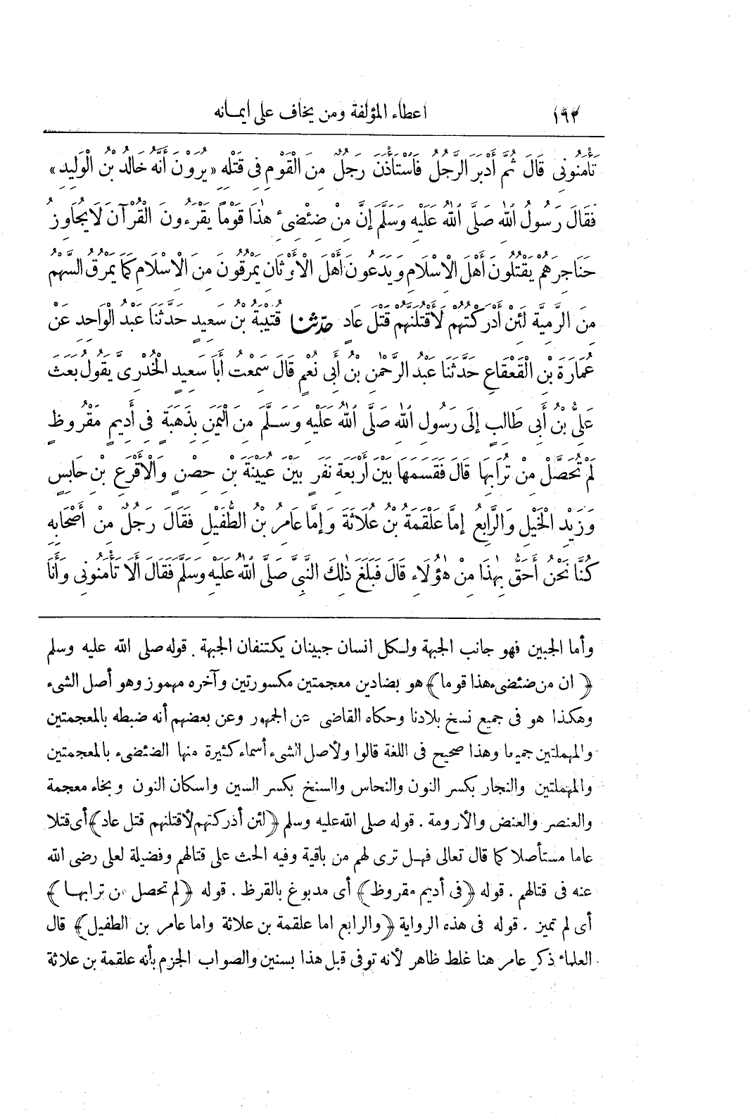 وَأَمَّا الْجَبِينِ فَهُوَ جَانِبُ الْجَبْهَةِ وَلِكُلِّ إِنْسَانٍ جَبِينَانِ يَكْتَنِفَانِ الْجَبْهَةَ قَوْلُهُ صَلَّى اللَّهُ عَلَيْهِ وَسَلَّمَ (إِنَّ مِنْ ضئضىء هَذَا قَوْمًا) هُوَ بِضَادَيْنِ مُعْجَمَتَيْنِ مَكْسُورَتَيْنِ وَآخِرُهُ مَهْمُوزٌ وَهُوَ أَصْلُ الشَّيْءِ وَهَكَذَا هُوَ فِي جَمِيعِ نُسَخِ بِلَادِنَا وَحَكَاهُ الْقَاضِي عَنِ الْجُمْهُورِ وَعَنْ بَعْضِهِمْ أَنَّهُ ضَبَطَهُ بِالْمُعْجَمَتَيْنِ وَالْمُهْمَلَتَيْنِ جَمِيعًا وَهَذَا صَحِيحٌ فِي اللُّغَةِ قَالُوا وَلِأَصْلِ الشَّيْءِ أَسْمَاءٌ كَثِيرَةٌ مِنْهَا الضِّئْضِئُ بِالْمُعْجَمَتَيْنِ وَالْمُهْمَلَتَيْنِ وَالنِّجَارُ بكسر النون والنحاس والسنخ بكسر السين واسكان النون وبخاء معجمة والعنصر والعنض والأرومة قَوْلُهُ صَلَّى اللَّهُ عَلَيْهِ وَسَلَّمَ (لَئِنْ أَدْرَكْتُهُمْ لَأَقْتُلَنَّهُمْ قَتْلَ عَادٍ) أَيْ قَتْلًا عَامًّا مُسْتَأْصِلًا كَمَا قَالَ تَعَالَى فَهَلْ تَرَى لَهُمْ مِنْ باقية وَفِيهِ الْحَثُّ عَلَى قِتَالِهِمْ وَفَضِيلَةٌ لِعَلِيٍّ رَضِيَ اللَّهُ عَنْهُ فِي قِتَالِهِمْ قَوْلُهُ (فِي أَدِيمٍ مَقْرُوظٍ) أَيْ مَدْبُوغٍ بِالْقَرَظِ قَوْلُهُ (لَمْ تُحَصَّلْ مِنْ تُرَابِهَا) أَيْ لَمْ تُمَيَّزْ قَوْلُهُ فِي هَذِهِ الرِّوَايَةِ (وَالرَّابِعُ إِمَّا عَلْقَمَةُ بْنُ عُلَاثَةَ وَإِمَّا عَامِرُ بْنُ الطُّفَيْلِ) قَالَ الْعُلَمَاءُ ذِكْرُ عَامِرٍ هُنَا غَلَطٌ ظَاهِرٌ لِأَنَّهُ تُوُفِّيَ قَبْلَ هَذَا بِسِنِينَ وَالصَّوَابُ الْجَزْمُ بِأَنَّهُ عَلْقَمَةُ بْنُ علاثة
