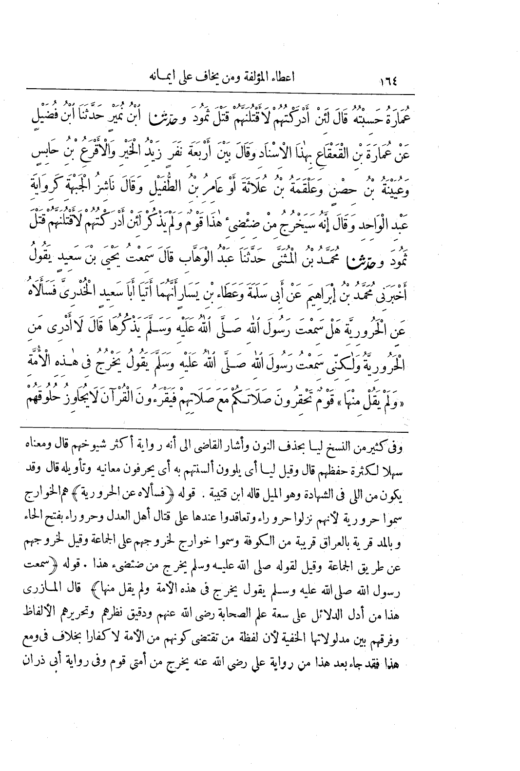 وَفِي كَثِيرٍ مِنَ النُّسَخِ لَيًّا بِحَذْفِ النُّونِ وَأَشَارَ الْقَاضِي إِلَى أَنَّهُ رِوَايَةُ أَكْثَرِ شُيُوخِهِمْ قَالَ وَمَعْنَاهُ سَهْلًا لِكَثْرَةِ حِفْظِهِمْ قَالَ وَقِيلَ لَيًّا أَيْ يَلْوُونَ أَلْسِنَتَهُمْ بِهِ أَيْ يُحَرِّفُونَ مَعَانِيَهُ وَتَأْوِيلَهُ قَالَ وَقَدْ يَكُونُ مِنَ اللَّيِّ في الشهادة وهو الميل قاله بن قُتَيْبَةَ (قَوْلُهُ (فَسَأَلَاهُ عَنِ الْحَرُورِيَّةِ) هُمُ الْخَوَارِجُ سُمُّوا حَرُورِيَّةً لِأَنَّهُمْ نَزَلُوا حَرُورَاءَ وَتَعَاقَدُوا عِنْدَهَا عَلَى قِتَالِ أَهْلِ الْعَدْلِ وَحَرُورَاءَ بِفَتْحِ الْحَاءِ وَبِالْمَدِّ قَرْيَةٌ بِالْعِرَاقِ قَرِيبَةٌ مِنَ الْكُوفَةِ وَسُمُّوا خَوَارِجَ لِخُرُوجِهِمْ عَلَى الْجَمَاعَةِ وَقِيلَ لِخُرُوجِهِمْ عَنْ طَرِيقِ الْجَمَاعَةِ وَقِيلَ لِقَوْلِهِ صَلَّى اللَّهُ عَلَيْهِ وَسَلَّمَ يَخْرُجُ مِنْ ضِئْضِئِ هَذَا قَوْلُهُ (سَمِعْتُ رَسُولَ اللَّهِ صَلَّى اللَّهُ عَلَيْهِ وَسَلَّمَ يقول يَخْرُجُ فِي هَذِهِ الْأُمَّةِ وَلَمْ يَقُلْ مِنْهَا) قَالَ الْمَازِرِيُّ هَذَا مِنْ أَدَلِّ الدَّلَائِلِ عَلَى سَعَةِ عِلْمِ الصَّحَابَةِ رَضِيَ اللَّهُ عَنْهُمْ وَدَقِيقُ نَظَرِهِمْ وَتَحْرِيرُهُمُ الْأَلْفَاظَ وَفَرْقُهُمْ بَيْنَ مَدْلُولَاتِهَا الْخَفِيَّةِ لِأَنَّ لَفْظَةَ مِنْ تَقْتَضِي كَوْنَهُمْ مِنَ الْأُمَّةِ لَا كُفَّارًا بِخِلَافِ فِي وَمَعَ هَذَا فَقَدْ جَاءَ بَعْدَ هَذَا مِنْ رِوَايَةِ عَلِيٍّ رَضِيَ اللَّهُ عَنْهُ يَخْرُجُ مِنْ أُمَّتِي قَوْمٌ وَفِي رواية أبي ذران