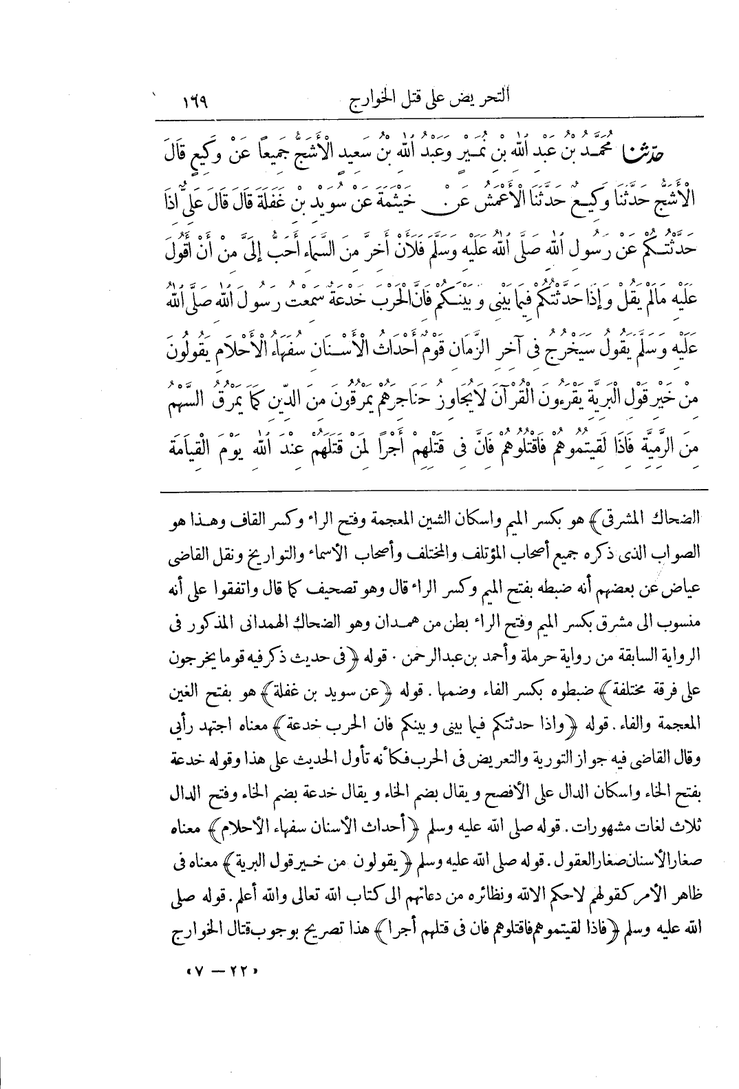[1066] قَوْلُهُ (عَنْ سُوَيْدِ بْنِ غَفَلَةَ) هُوَ بِفَتْحِ الْغَيْنِ الْمُعْجَمَةِ وَالْفَاءِ قَوْلُهُ (وَإِذَا حَدَّثْتُكُمْ فِيمَا بَيْنِي وَبَيْنَكُمْ فَإِنَّ الْحَرْبَ خَدْعَةٌ) مَعْنَاهُ أَجْتَهِدُ رأيي وقال القاضي فيه جَوَازُ التَّوْرِيَةِ وَالتَّعْرِيضِ فِي الْحَرْبِ فَكَأَنَّهُ تَأَوَّلَ الْحَدِيثَ عَلَى هَذَا وَقَوْلُهُ خَدْعَةٌ بِفَتْحِ الْخَاءِ وَإِسْكَانِ الدَّالِ عَلَى الْأَفْصَحِ وَيُقَالُ بِضَمِّ الْخَاءِ وَيُقَالُ خُدَعَةٌ بِضَمِّ الْخَاءِ وَفَتْحِ الدَّالِ ثَلَاثُ لُغَاتٍ مَشْهُورَاتٍ قَوْلُهُ صَلَّى اللَّهُ عَلَيْهِ وَسَلَّمَ (أَحْدَاثُ الْأَسْنَانِ سُفَهَاءُ الْأَحْلَامِ) مَعْنَاهُ صِغَارُ الْأَسْنَانِ صِغَارُ الْعُقُولِ قَوْلُهُ صَلَّى اللَّهُ عَلَيْهِ وَسَلَّمَ يَقُولُونَ مِنْ خَيْرِ قَوْلِ الْبَرِيَّةِ مَعْنَاهُ فِي ظَاهِرِ الْأَمْرِ كَقَوْلِهِمْ لَا حُكْمَ إِلَّا لِلَّهِ وَنَظَائِرِهِ مِنْ دُعَائِهِمْ إِلَى كِتَابِ اللَّهُ تَعَالَى وَاللَّهُ أَعْلَمُ قَوْلُهُ صَلَّى اللَّهُ عَلَيْهِ وسلم (فَإِذَا لَقِيتُمُوهُمْ فَاقْتُلُوهُمْ فَإِنَّ فِي قَتْلِهِمْ أَجْرًا) هَذَا تَصْرِيحٌ بِوُجُوبِ قِتَالِ الْخَوَارِجِ