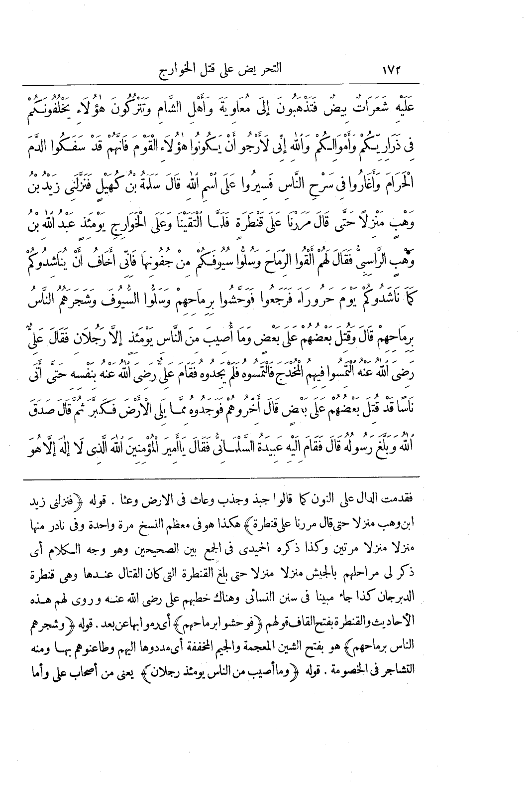 فَقُدِّمَتِ الدَّالُ عَلَى النُّونِ كَمَا قَالُوا جَبَذَ وَجَذَبَ وَعَاثَ فِي الْأَرْضِ وَعَثَا قَوْلُهُ (فَنَزَّلَنِي زَيْدُ بْنُ وَهْبٍ مَنْزِلًا حَتَّى قَالَ مَرَرْنَا عَلَى قَنْطَرَةٍ) هَكَذَا هُوَ فِي مُعْظَمِ النُّسَخِ مَرَّةً وَاحِدَةً وَفِي نَادِرٍ مِنْهَا مَنْزِلًا مَنْزِلًا مَرَّتَيْنِ وَكَذَا ذَكَرَهُ الْحُمَيْدِيُّ فِي الْجَمْعِ بَيْنَ الصَّحِيحَيْنِ وَهُوَ وَجْهُ الْكَلَامِ أَيْ ذَكَرَ لِي مَرَاحِلَهُمْ بِالْجَيْشِ مَنْزِلًا مَنْزِلًا حَتَّى بَلَغَ الْقَنْطَرَةَ الَّتِي كَانَ الْقِتَالُ عِنْدَهَا وَهِيَ قَنْطَرَةُ الدَّبْرَجَانِ كَذَا جَاءَ مُبَيَّنًا فِي سُنَنِ النَّسَائِيِّ وَهُنَاكَ خَطَبَهُمْ عَلِيٌّ رَضِيَ اللَّهُ عَنْهُ وَرَوَى لَهُمْ هذه الأحاديث والقنطرة بِفَتْحِ الْقَافِ قَوْلُهُمْ (فَوَحَّشُوا بِرِمَاحِهِمْ) أَيْ رَمَوْا بِهَا عَنْ بُعْدٍ قَوْلُهُ (وَشَجَرَهُمُ النَّاسُ بِرِمَاحِهِمْ) هُوَ بِفَتْحِ الشِّينِ الْمُعْجَمَةِ وَالْجِيمِ الْمُخَفَّفَةِ أَيْ مَدَّدُوهَا إِلَيْهِمْ وَطَاعَنُوهُمْ بِهَا وَمِنْهُ التَّشَاجُرُ فِي الخصومة قوله (وما أصيب من الناس يؤمئذ إِلَّا رَجُلَانِ) يَعْنِي مِنْ أَصْحَابِ عَلِيٍّ وَأَمَّا