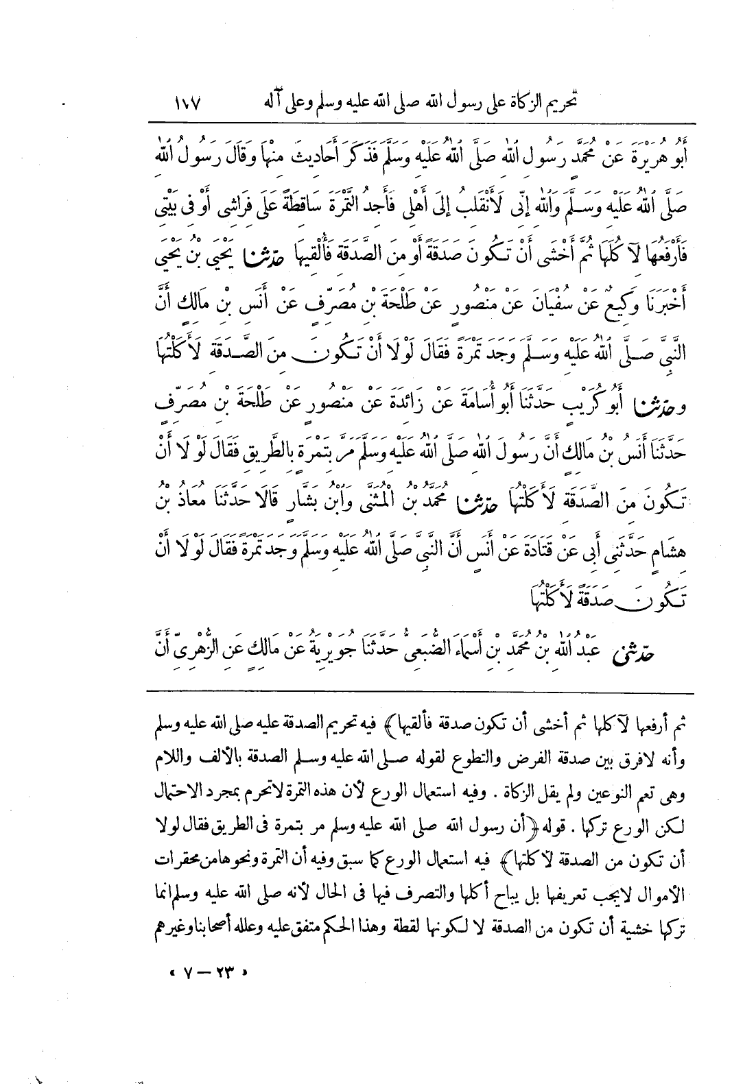 ثُمَّ أَرْفَعُهَا لِآكُلَهَا ثُمَّ أَخْشَى أَنْ تَكُونَ صَدَقَةً فَأُلْقِيَهَا) فِيهِ تَحْرِيمُ الصَّدَقَةِ عَلَيْهِ صَلَّى اللَّهُ عَلَيْهِ وَسَلَّمَ وَأَنَّهُ لَا فَرْقَ بَيْنَ صَدَقَةِ الْفَرْضِ وَالتَّطَوُّعِ لِقَوْلِهِ صَلَّى اللَّهُ عَلَيْهِ وَسَلَّمَ الصَّدَقَةُ بِالْأَلِفِ وَاللَّامِ وَهِيَ تَعُمُّ النَّوْعَيْنِ وَلَمْ يَقُلِ الزَّكَاةُ وَفِيهِ اسْتِعْمَالُ الْوَرَعِ لِأَنَّ هَذِهِ التَّمْرَةَ لَا تَحْرُمُ بِمُجَرَّدِ الِاحْتِمَالِ لَكِنَّ الْوَرَعَ تَرْكُهَا قَوْلُهُ (أَنَّ رَسُولَ اللَّهِ صَلَّى اللَّهُ عَلَيْهِ وَسَلَّمَ مَرَّ بِتَمْرَةٍ فِي الطَّرِيقِ فَقَالَ لَوْلَا أَنْ تَكُونَ مِنَ الصَّدَقَةِ لَأَكَلْتُهَا) فِيهِ اسْتِعْمَالُ الْوَرَعِ كَمَا سَبَقَ وَفِيهِ أَنَّ التَّمْرَةَ وَنَحْوَهَا مِنْ مُحَقَّرَاتِ الْأَمْوَالِ لَا يَجِبُ تَعْرِيفُهَا بَلْ يُبَاحُ أَكْلُهَا وَالتَّصَرُّفُ فِيهَا فِي الْحَالِ لِأَنَّهُ صَلَّى اللَّهُ عَلَيْهِ وَسَلَّمَ إِنَّمَا تَرَكَهَا خَشْيَةَ أَنْ تَكُونَ مِنَ الصَّدَقَةِ لَا لِكَوْنِهَا لُقَطَةً وَهَذَا الْحُكْمُ مُتَّفَقٌ عَلَيْهِ وَعَلَّلَهُ أصحابنا وغيرهم