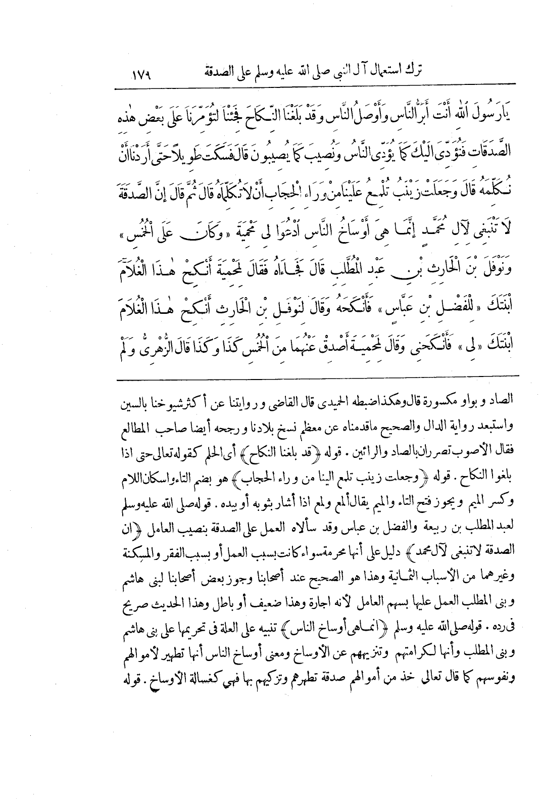 الصَّادِ وَبِوَاوٍ مَكْسُورَةٍ قَالَ وَهَكَذَا ضَبَطَهُ الْحُمَيْدِيُّ قَالَ الْقَاضِي وَرِوَايَتُنَا عَنْ أَكْثَرِ شُيُوخِنَا بِالسِّينِ وَاسْتَبْعَدَ رِوَايَةَ الدَّالِ وَالصَّحِيحُ مَا قَدَّمْنَاهُ عَنْ مُعْظَمِ نُسَخِ بِلَادِنَا وَرَجَّحَهُ أَيْضًا صَاحِبُ الْمَطَالِعِ فقال الأصوب تصرران بالصاد والرائين قَوْلُهُ (قَدْ بَلَغْنَا النِّكَاحَ) أَيَ الْحُلُمَ كَقَوْلِهِ تعالى حتى اذا بلغوا النكاح قَوْلُهُ (وَجَعَلَتْ زَيْنَبُ تُلْمِعُ إِلَيْنَا مِنْ وَرَاءِ الْحِجَابِ) هُوَ بِضَمِّ التَّاءِ وَإِسْكَانِ اللَّامِ وَكَسْرِ الْمِيمِ وَيَجُوزُ فَتْحُ التَّاءِ وَالْمِيمِ يُقَالُ أَلْمَعَ وَلَمَعَ إِذَا أَشَارَ بِثَوْبِهِ أَوْ بِيَدِهِ قَوْلُهُ صَلَّى اللَّهُ عَلَيْهِ وَسَلَّمَ لِعَبْدِ الْمُطَّلِبِ بْنِ رَبِيعَةَ وَالْفَضْلِ بْنِ عَبَّاسٍ وَقَدْ سَأَلَاهُ الْعَمَلَ عَلَى الصَّدَقَةِ بِنَصِيبِ الْعَامِلِ (إِنَّ الصَّدَقَةَ لَا تَنْبَغِي لِآلِ مُحَمَّدٍ) دَلِيلٌ عَلَى أَنَّهَا مُحَرَّمَةٌ سَوَاءٌ كَانَتْ بِسَبَبِ الْعَمَلِ أَوْ بِسَبَبِ الْفَقْرِ وَالْمَسْكَنَةِ وَغَيْرِهِمَا مِنَ الْأَسْبَابِ الثَّمَانِيَةِ وَهَذَا هُوَ الصَّحِيحُ عِنْدَ أَصْحَابِنَا وَجَوَّزَ بَعْضُ أَصْحَابِنَا لِبَنِي هَاشِمٍ وَبَنِي الْمُطَّلِبِ الْعَمَلَ عَلَيْهَا بِسَهْمِ الْعَامِلِ لِأَنَّهُ إِجَارَةٌ وَهَذَا ضَعِيفٌ أَوْ بَاطِلٌ وَهَذَا الْحَدِيثُ صَرِيحٌ فِي رَدِّهِ قَوْلُهُ صَلَّى اللَّهُ عَلَيْهِ وَسَلَّمَ (إِنَّمَا هِيَ أَوْسَاخُ النَّاسِ) تَنْبِيهٌ على العلة فِي تَحْرِيمِهَا عَلَى بَنِي هَاشِمٍ وَبَنِي الْمُطَّلِبِ وَأَنَّهَا لِكَرَامَتِهِمْ وَتَنْزِيهِهِمْ عَنِ الْأَوْسَاخِ وَمَعْنَى أَوْسَاخُ النَّاسِ أَنَّهَا تَطْهِيرٌ لِأَمْوَالِهِمْ وَنُفُوسِهِمْ كَمَا قَالَ تَعَالَى خُذْ مِنْ أَمْوَالِهِمْ صَدَقَةً تُطَهِّرُهُمْ وَتُزَكِّيهِمْ بها فَهِيَ كَغَسَّالَةِ الْأَوْسَاخِ قَوْلُهُ