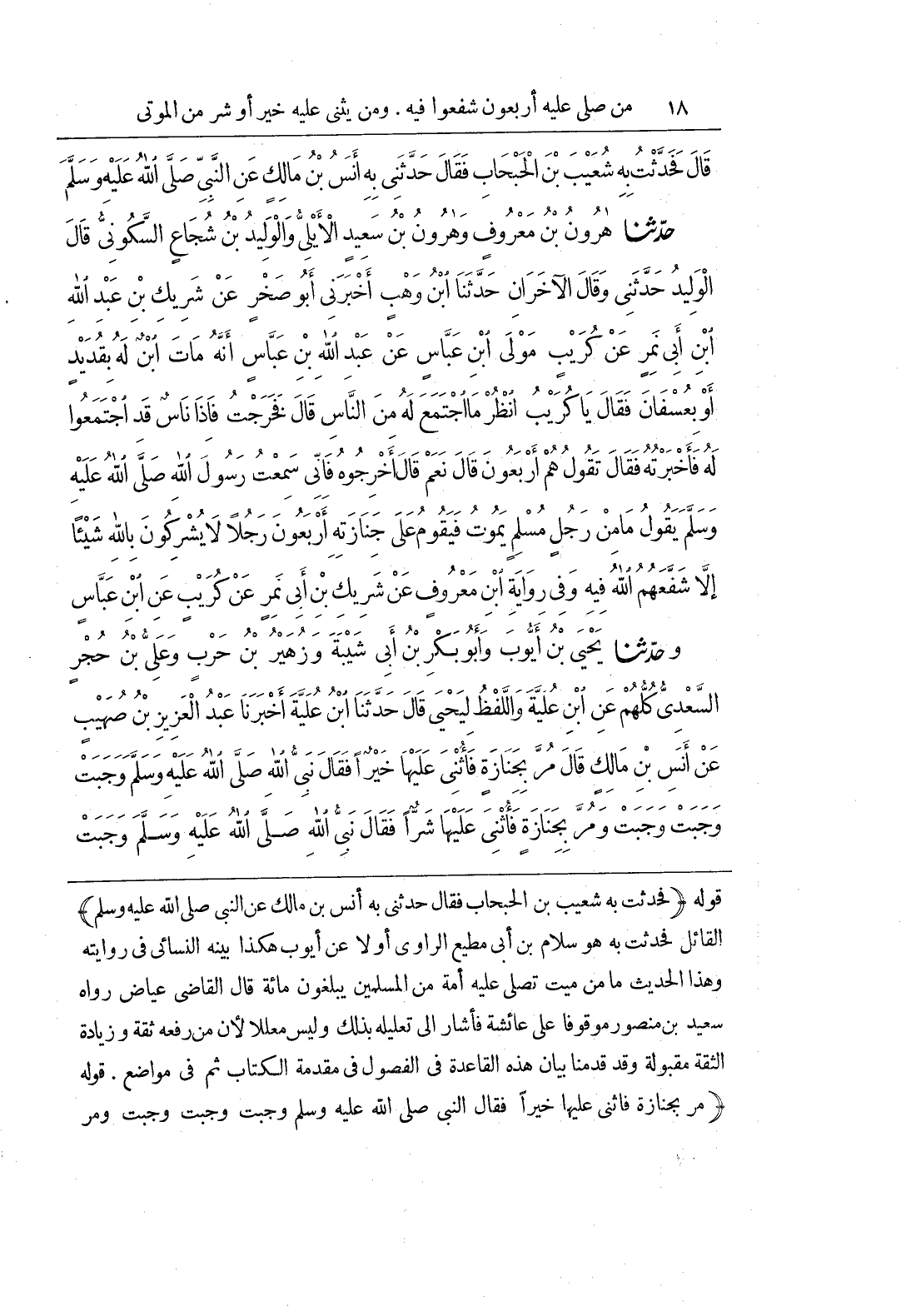 قَوْلُهُ (فَحَدَّثْتُ بِهِ شُعَيْبَ بْنَ الْحَبْحَابِ فَقَالَ حَدَّثَنِي بِهِ أَنَسُ بْنُ مَالِكٍ عَنِ النَّبِيِّ صَلَّى اللَّهُ عَلَيْهِ وَسَلَّمَ) الْقَائِلُ فَحَدَّثْتُ بِهِ هُوَ سَلَّامُ بْنُ أَبِي مُطِيعٍ الرَّاوِي أَوَّلًا عَنْ أَيُّوبَ هَكَذَا بَيَّنَهُ النَّسَائِيُّ فِي رِوَايَتِهِ وَهَذَا الْحَدِيثُ مَا مِنْ مَيِّتٍ تُصَلِّي عَلَيْهِ أُمَّةٌ مِنَ الْمُسْلِمِينَ يَبْلُغُونَ مِائَةً قَالَ الْقَاضِي عِيَاضٌ رَوَاهُ سَعِيدُ بْنُ مَنْصُورٍ مَوْقُوفًا عَلَى عَائِشَةَ فَأَشَارَ إِلَى تَعْلِيلِهِ بِذَلِكَ وَلَيْسَ مُعَلَّلًا لِأَنَّ مَنْ رَفَعَهُ ثِقَةٌ وَزِيَادَةُ الثِّقَةِ مَقْبُولَةٌ وَقَدْ قَدَّمْنَا بَيَانَ هَذِهِ الْقَاعِدَةِ فِي الْفُصُولِ في مقدمة الكتاب ثم في مواضع