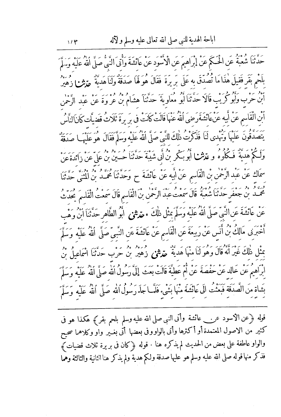 قَوْلُهُ (عَنِ الْأَسْوَدِ عَنْ عَائِشَةَ وَأُتِيَ النَّبِيُّ صَلَّى اللَّهُ عَلَيْهِ وَسَلَّمَ بِلَحْمِ بَقَرٍ) هَكَذَا هُوَ فِي كَثِيرٍ مِنَ الْأُصُولِ الْمُعْتَمَدَةِ أَوْ أَكْثَرِهَا وَأُتِيَ بِالْوَاوِ وَفِي بَعْضِهَا أُتِيَ بِغَيْرِ وَاوٍ وَكِلَاهُمَا صَحِيحٌ وَالْوَاوُ عَاطِفَةٌ عَلَى بَعْضٍ مِنَ الْحَدِيثِ لَمْ يَذْكُرْهُ هُنَا قَوْلُهُ (كَانَ فِي بَرِيرَةَ ثَلَاثُ قَضِيَّاتٍ) فَذَكَرَ مِنْهَا قَوْلَهُ صَلَّى اللَّهُ عَلَيْهِ وَسَلَّمَ هُوَ عَلَيْهَا صَدَقَةٌ وَلَكُمْ هَدِيَّةٌ وَلَمْ يَذْكُرْ هُنَا الثَّانِيَةَ وَالثَّالِثَةَ وهما