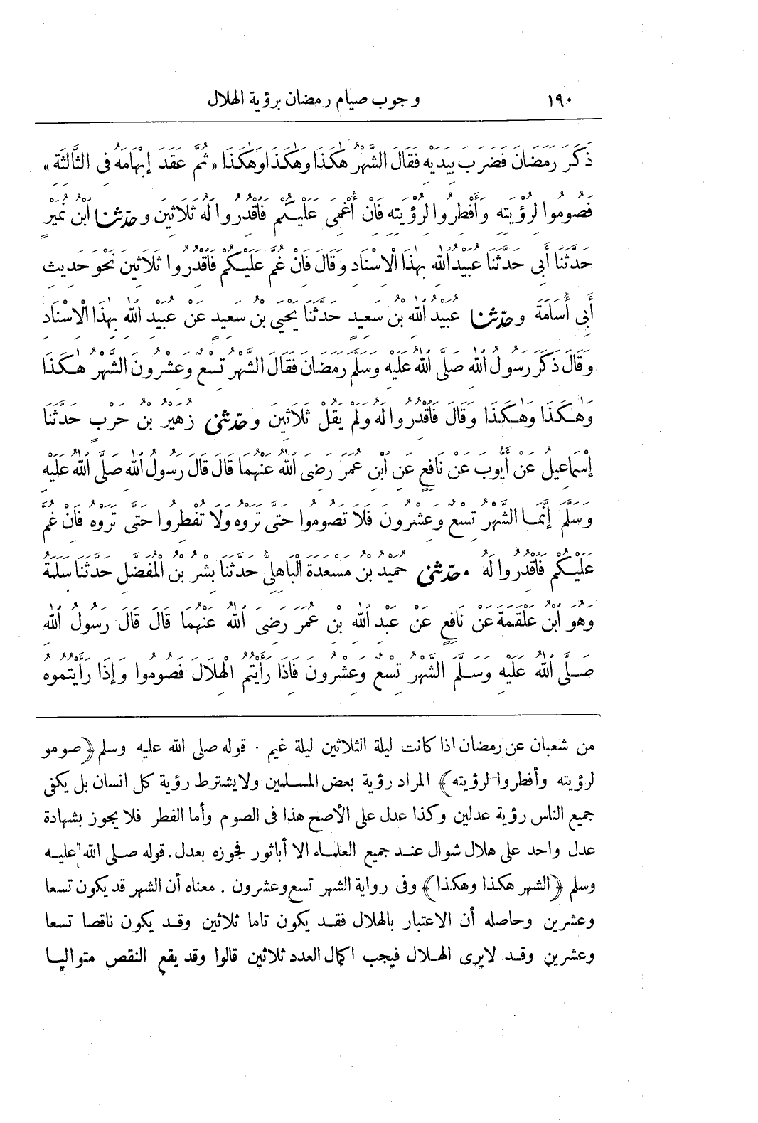 مِنْ شَعْبَانَ عَنْ رَمَضَانَ إِذَا كَانَتْ لَيْلَةُ الثَّلَاثِينَ لَيْلَةَ غَيْمٍ قَوْلُهُ صَلَّى اللَّهُ عَلَيْهِ وَسَلَّمَ (صُومُوا لِرُؤْيَتِهِ وَأَفْطِرُوا لِرُؤْيَتِهِ) الْمُرَادُ رُؤْيَةُ بَعْضِ الْمُسْلِمِينَ وَلَا يُشْتَرَطُ رُؤْيَةُ كُلِّ إِنْسَانٍ بَلْ يَكْفِي جَمِيعَ النَّاسِ رُؤْيَةُ عَدْلَيْنِ وَكَذَا عَدْلٌ عَلَى الْأَصَحِّ هَذَا فِي الصَّوْمِ وَأَمَّا الْفِطْرُ فَلَا يَجُوزُ بِشَهَادَةِ عَدْلٍ وَاحِدٍ عَلَى هلال شَوَّالٍ عِنْدَ جَمِيعِ الْعُلَمَاءِ إِلَّا أَبَا ثَوْرٍ فَجَوَّزَهُ بِعَدْلٍ قَوْلُهُ صَلَّى اللَّهُ عَلَيْهِ وَسَلَّمَ (الشَّهْرُ هَكَذَا وَهَكَذَا) وَفِي رِوَايَةٍ الشَّهْرُ تِسْعٌ وَعِشْرُونَ مَعْنَاهُ أَنَّ الشَّهْرَ قَدْ يَكُونُ تِسْعًا وَعِشْرِينَ وَحَاصِلُهُ أَنَّ الِاعْتِبَارَ بِالْهِلَالِ فَقَدْ يَكُونُ تَامًّا ثَلَاثِينَ وَقَدْ يَكُونُ نَاقِصًا تِسْعًا وَعِشْرِينَ وَقَدْ لَا يُرَى الْهِلَالُ فَيَجِبُ إِكْمَالُ الْعَدَدِ ثَلَاثِينَ قَالُوا وَقَدْ يَقَعُ النَّقْصُ مُتَوَالِيًا