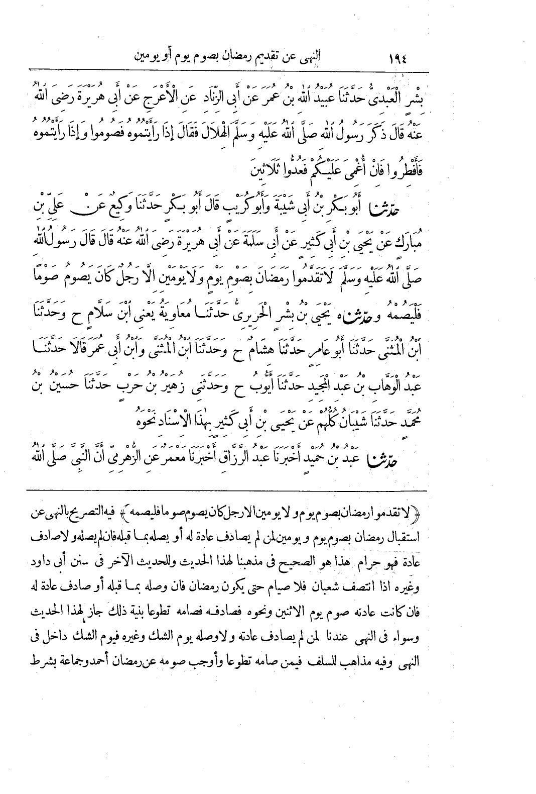 (لَا تَقَدَّمُوا رَمَضَانَ بِصَوْمِ يَوْمٍ وَلَا يَوْمَيْنِ إِلَّا رَجُلٌ كَانَ يَصُومُ صَوْمًا فَلْيَصُمْهُ) فِيهِ التَّصْرِيحُ بِالنَّهْيِ عَنِ اسْتِقْبَالِ رَمَضَانَ بِصَوْمِ يَوْمٍ وَيَوْمَيْنِ لِمَنْ لَمْ يُصَادِفْ عَادَةً لَهُ أَوْ يَصِلْهُ بِمَا قَبْلَهُ فَإِنْ لَمْ يَصِلْهُ وَلَا صَادَفَ عَادَةً فَهُوَ حَرَامٌ هَذَا هُوَ الصَّحِيحُ فِي مَذْهَبِنَا لِهَذَا الْحَدِيثِ وَلِلْحَدِيثِ الْآخَرِ فِي سُنَنِ أَبِي دَاوُدَ وَغَيْرِهِ إِذَا انْتَصَفَ شَعْبَانُ فَلَا صِيَامَ حَتَّى يَكُونَ رَمَضَانُ فَإِنْ وَصَلَهُ بِمَا قَبْلَهُ أَوْ صَادَفَ عَادَةً لَهُ فَإِنْ كَانَتْ عَادَتُهُ صَوْمَ يَوْمِ الِاثْنَيْنِ وَنَحْوِهِ فَصَادَفَهُ فَصَامَهُ تَطَوُّعًا بِنِيَّةِ ذَلِكَ جَازَ لِهَذَا الْحَدِيثِ وَسَوَاءٌ فِي النَّهْيِ عِنْدَنَا لِمَنْ لَمْ يُصَادِفْ عَادَتَهُ وَلَا وَصَلَهُ يَوْمُ الشَّكِّ وَغَيْرُهُ فَيَوْمُ الشَّكِّ دَاخِلٌ فِي النَّهْيِ وَفِيهِ مَذَاهِبُ لِلسَّلَفِ فِيمَنْ صَامَهُ تَطَوُّعًا وَأَوْجَبَ صَوْمَهُ عَنْ رَمَضَانَ أَحْمَدُ وَجَمَاعَةٌ بِشَرْطِ