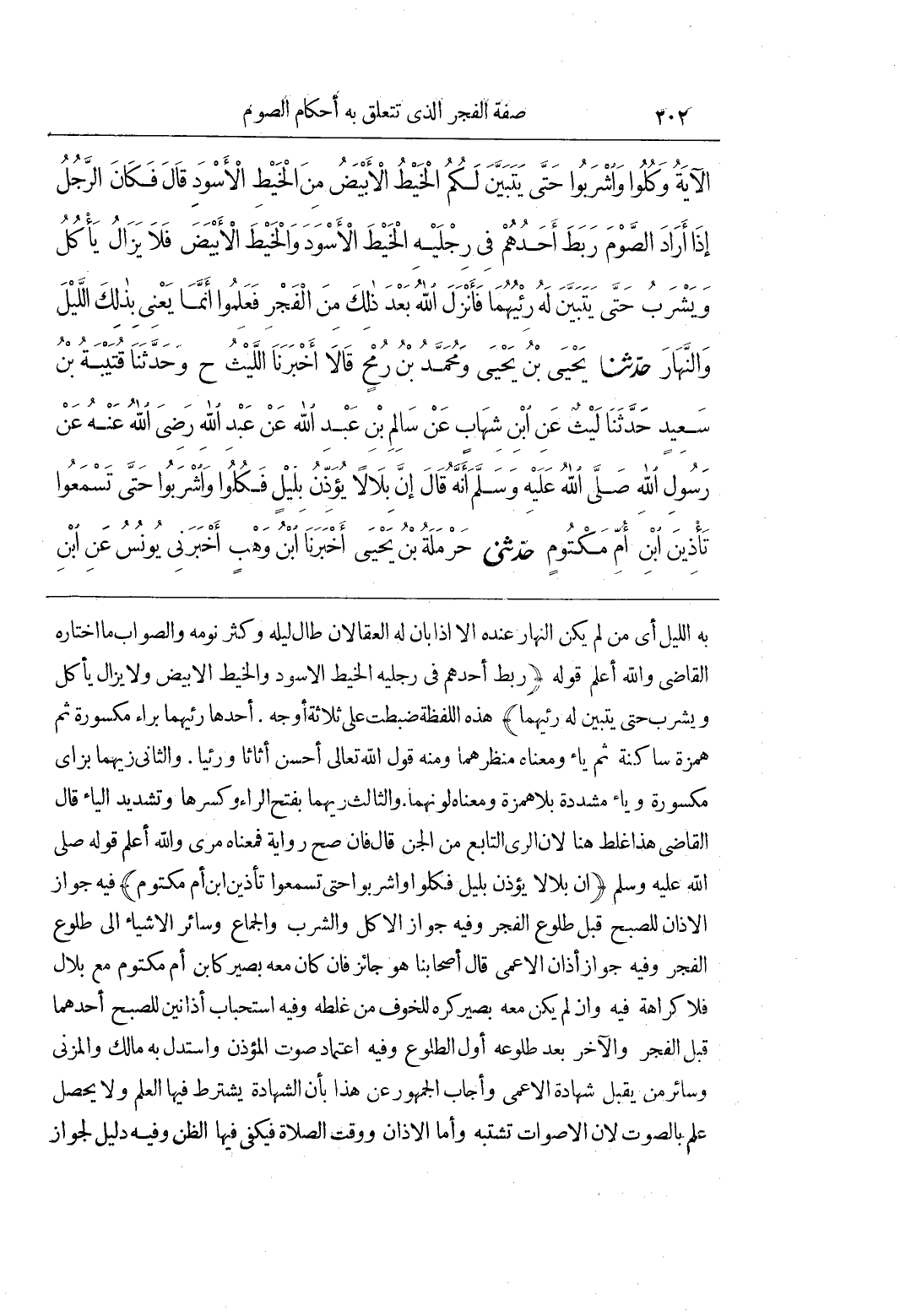 بِهِ اللَّيْلَ أَيْ مَنْ لَمْ يَكُنِ النَّهَارُ عِنْدَهُ إِلَّا إِذَا بَانَ لَهُ الْعِقَالَانِ طَالَ لَيْلُهُ وَكَثُرَ نَوْمُهُ وَالصَّوَابُ مَا اخْتَارَهُ الْقَاضِي وَاللَّهُ أَعْلَمُ قَوْلُهُ (رَبَطَ أَحَدُهُمْ فِي رِجْلَيْهِ الْخَيْطَ الْأَسْوَدَ وَالْخَيْطَ الْأَبْيَضَ وَلَا يَزَالُ يَأْكُلُ وَيَشْرَبُ حَتَّى يَتَبَيَّنَ لَهُ رِئْيُهُمَا) هَذِهِ اللَّفْظَةُ ضبطت على ثلاثة أوجه أحدها رِئْيَهُمَا بِرَاءٍ مَكْسُورَةٍ ثُمَّ هَمْزَةٍ سَاكِنَةٍ ثُمَّ يَاءٍ وَمَعْنَاهُ مَنْظَرُهُمَا وَمِنْهُ قَوْلُ اللَّهِ تَعَالَى أحسن أثاثا ورئيا وَالثَّانِي زِيُّهُمَا بِزَايٍ مَكْسُورَةٍ وَيَاءٍ مُشَدَّدَةٍ بِلَا هَمْزَةٍ وَمَعْنَاهُ لَوْنُهُمَا وَالثَّالِثُ رَيُّهُمَا بِفَتْحِ الرَّاءِ وَكَسْرِهَا وَتَشْدِيدِ الْيَاءِ قَالَ الْقَاضِي هَذَا غَلَطٌ هُنَا لِأَنَّ الرَّيَّ التَّابِعُ مِنَ الْجِنِّ قَالَ فَإِنْ صَحَّ رِوَايَةً فَمَعْنَاهُ مَرْي وَاللَّهُ أَعْلَمُ